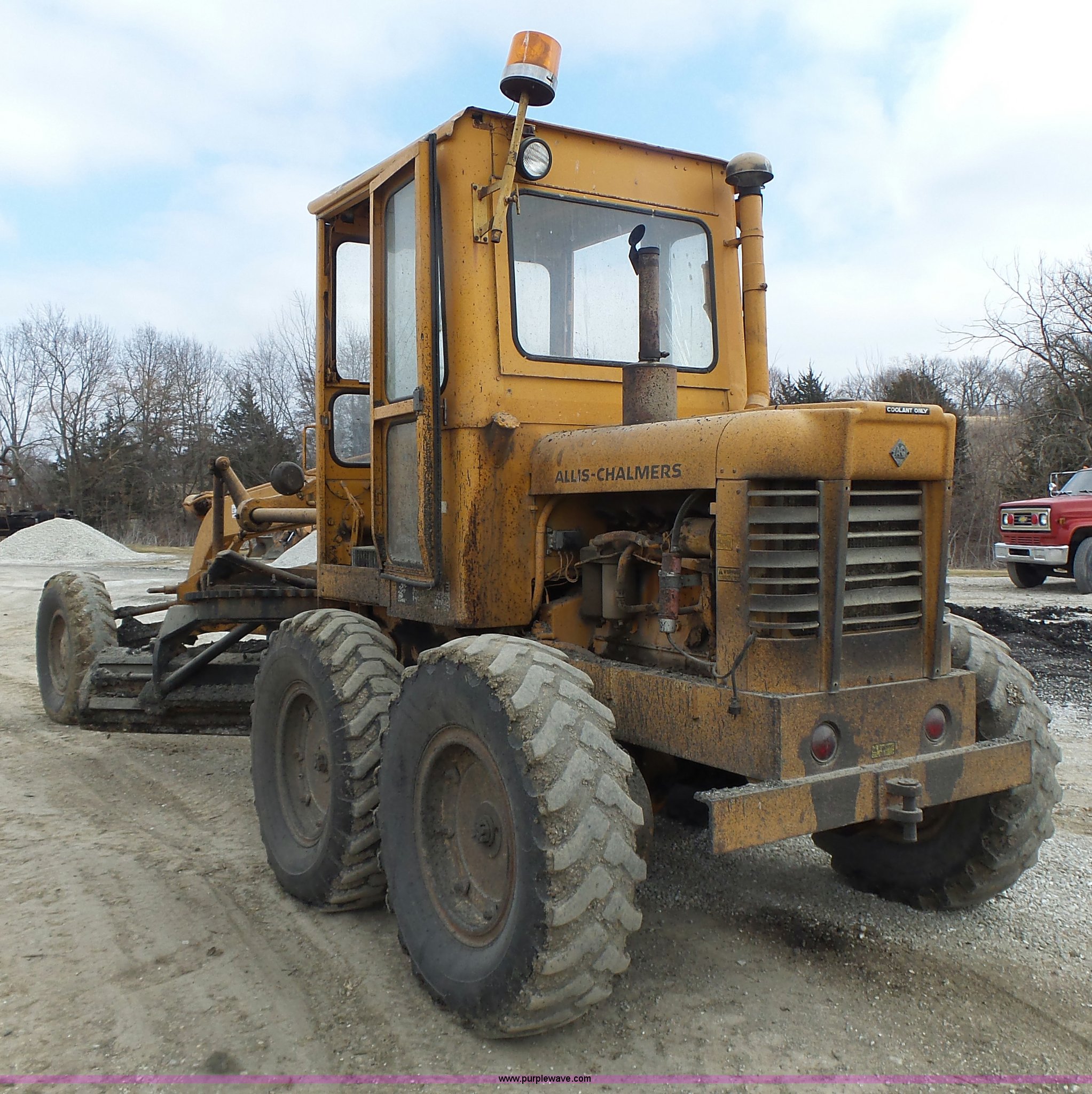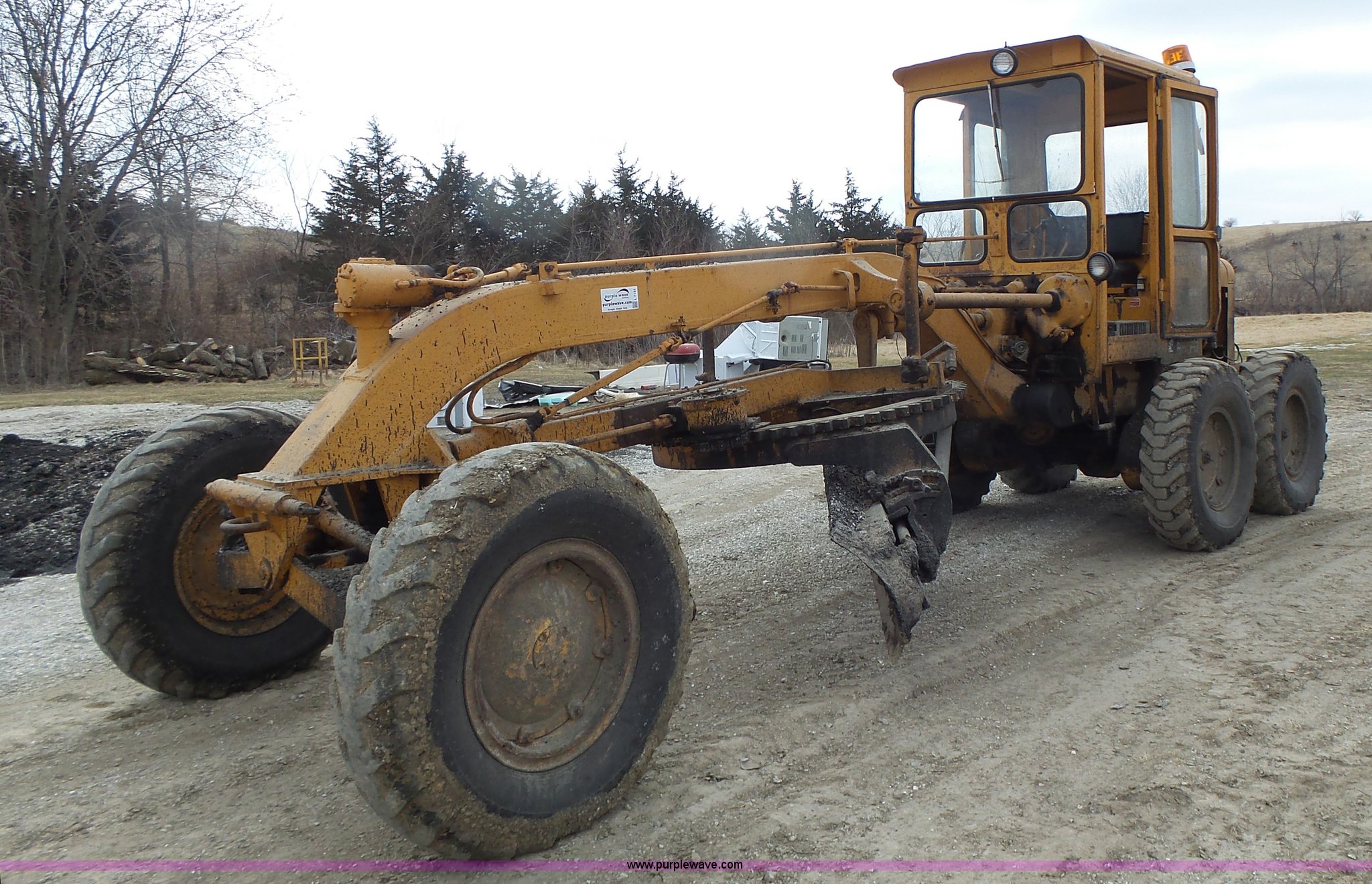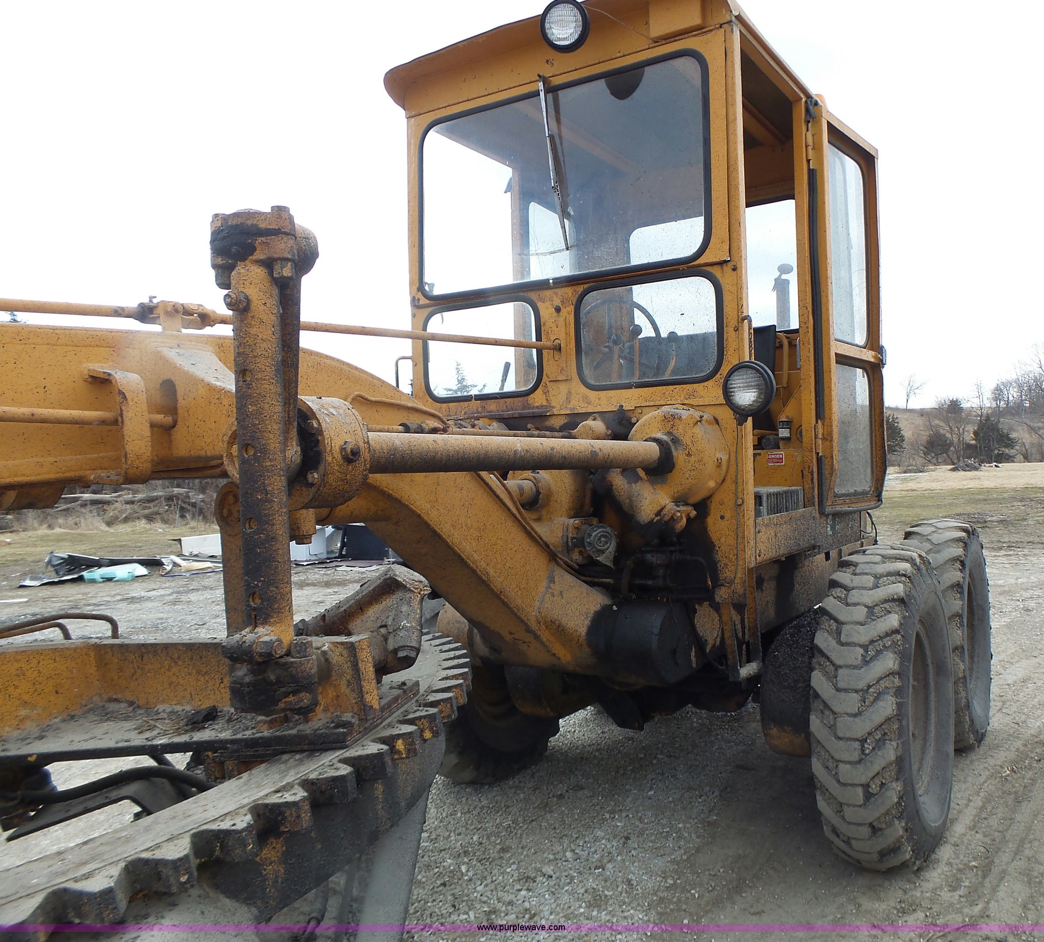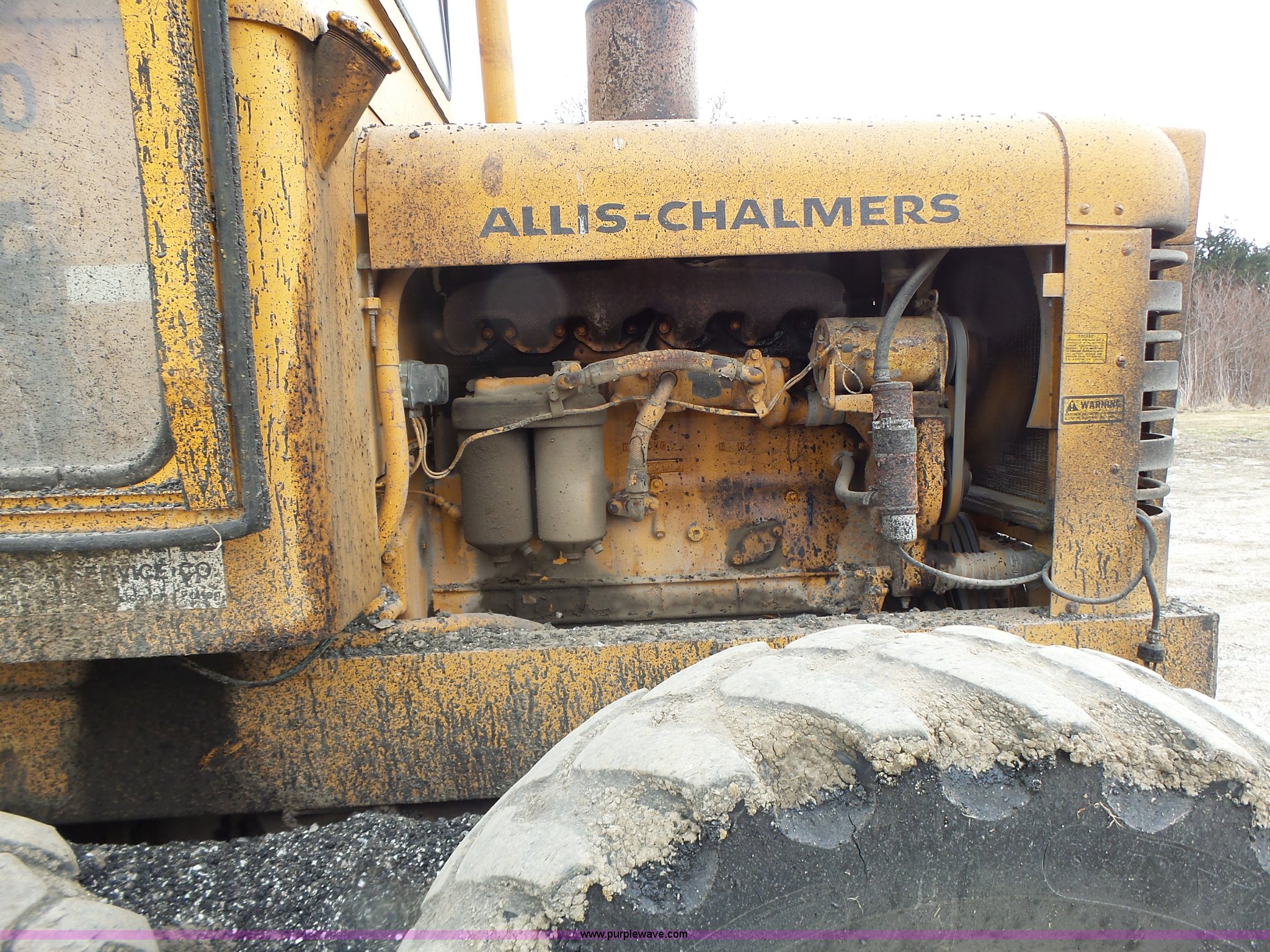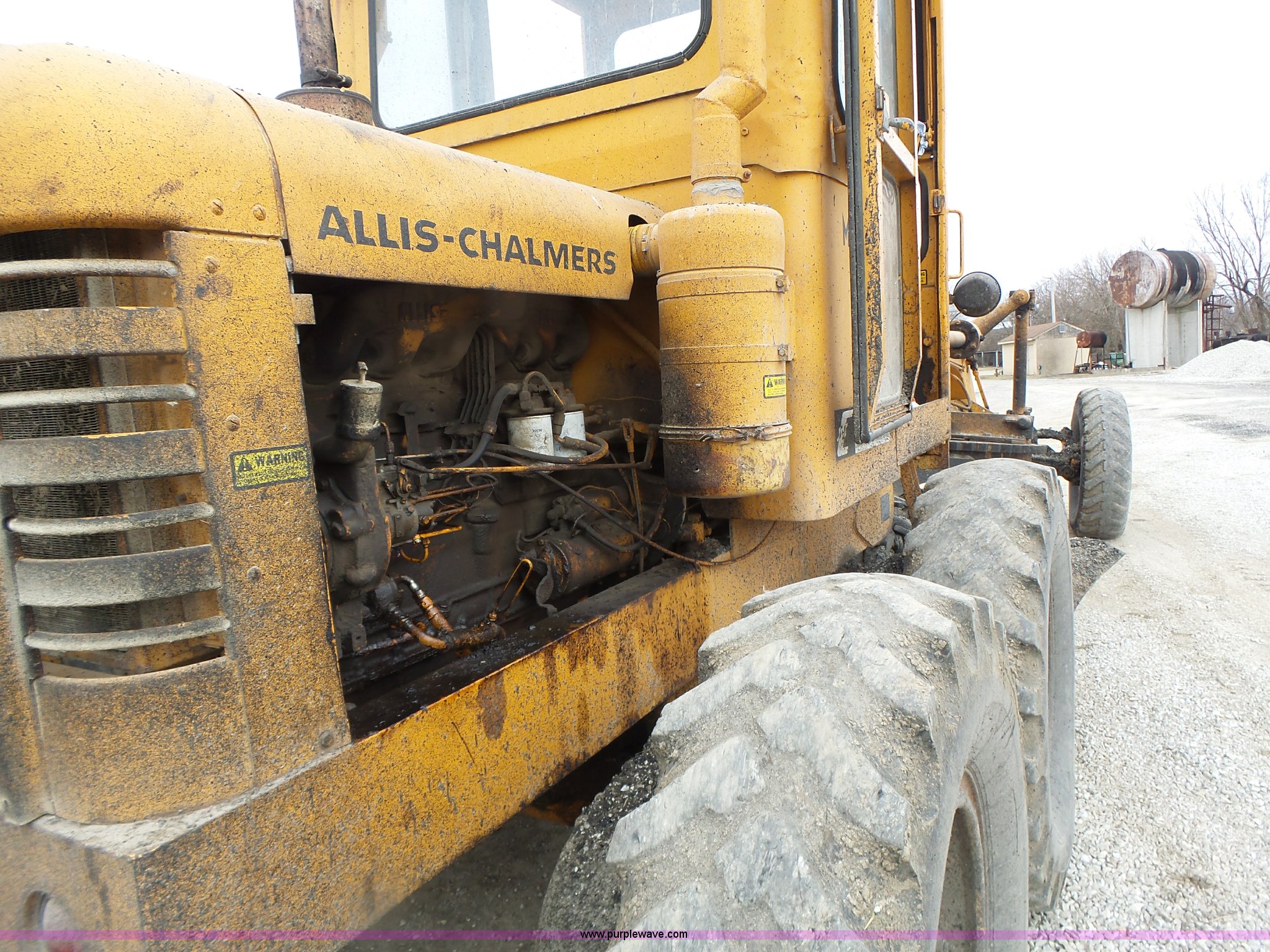 Purple Wave is selling a used Motor Grader in Missouri. This item is a 1966 Allis Chalmers M100 motor grader with the following: 8,359 hours on meter, Allis Chalmers six cylinder diesel engine, 3F-3R gears, Enclosed cab, Heat, Front and rear work lights, 12'W moldboard, Tip control, Side shift, Rigid frame, 13.00-24 tires, Serial M100R1516