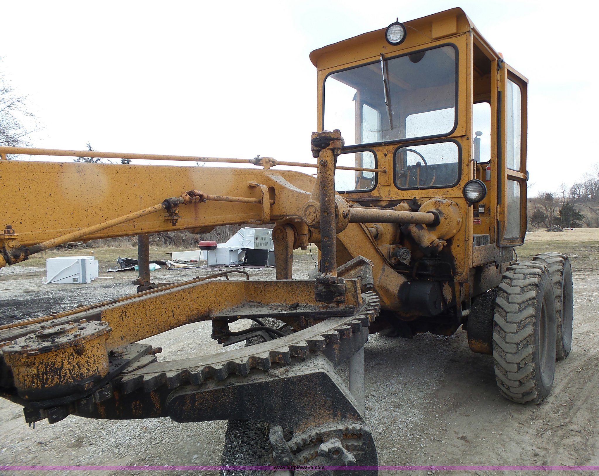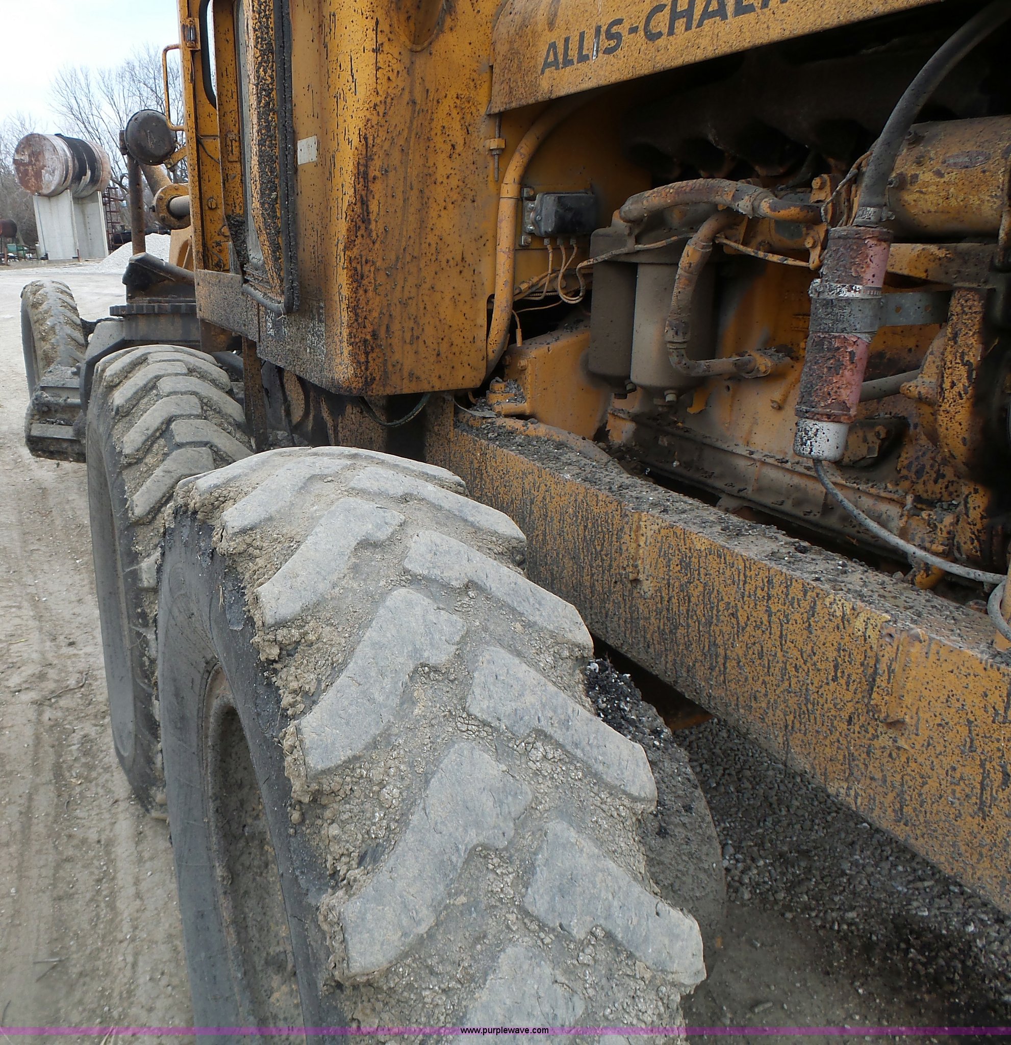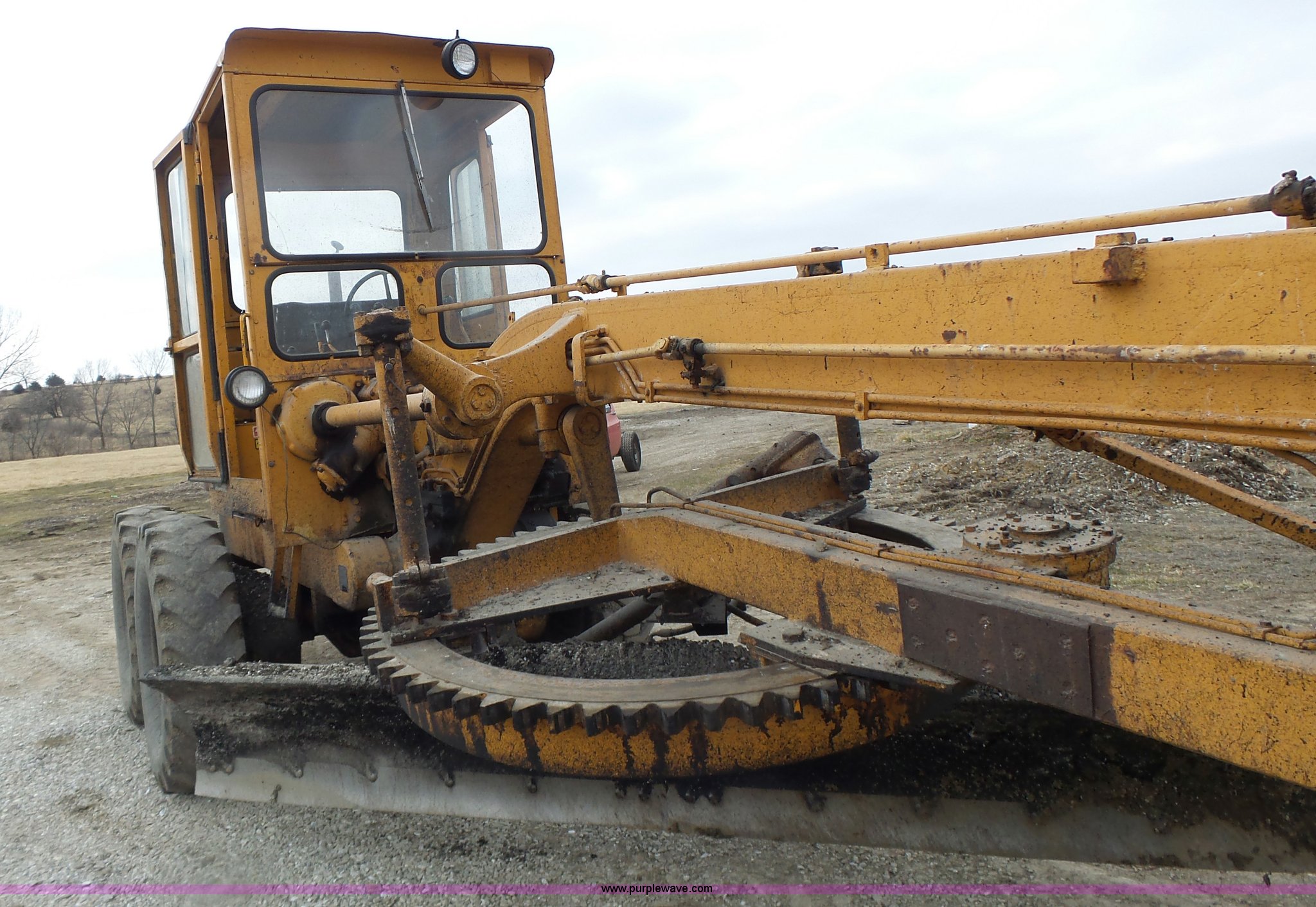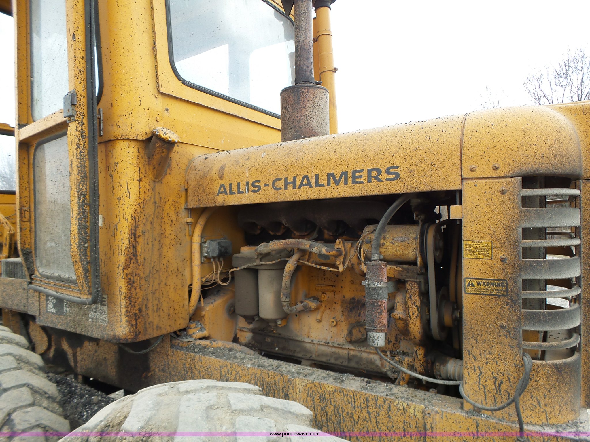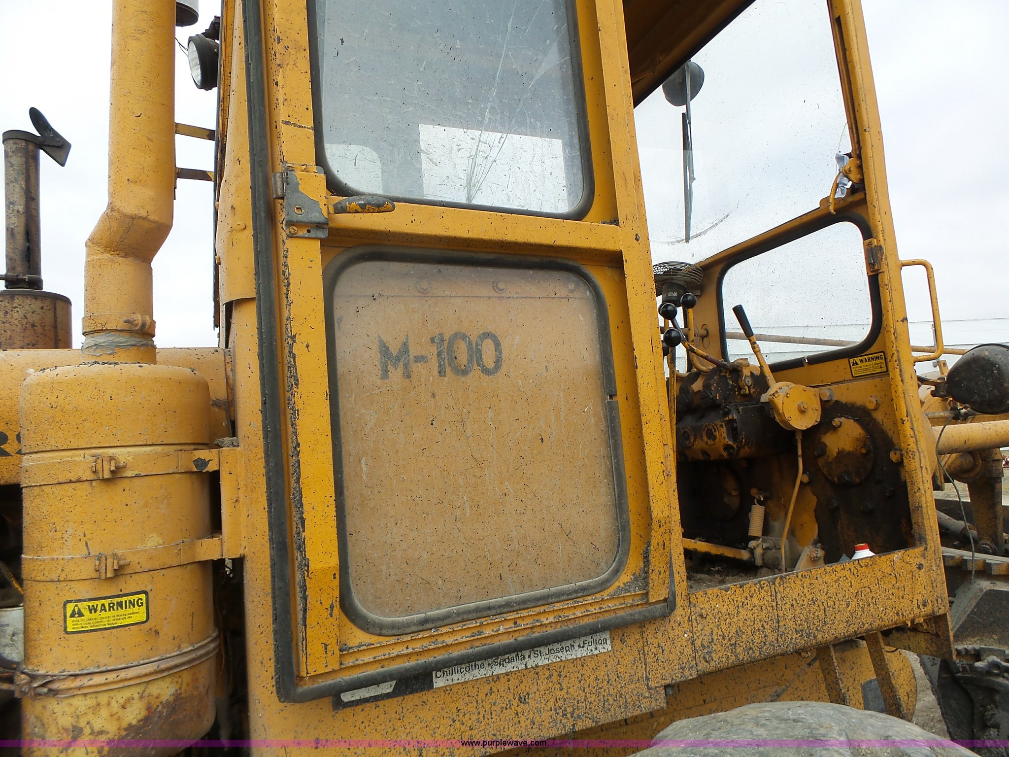Purple Wave is selling a used Motor Grader in Missouri. This item is a 1966 Allis Chalmers M100 motor grader with the following: 8,359 hours on meter, Allis Chalmers six cylinder diesel engine, 3F-3R gears, Enclosed cab, Heat, Front and rear work lights, 12'W moldboard, Tip control, Side shift, Rigid frame, 13.00-24 tires, Serial M100R1516