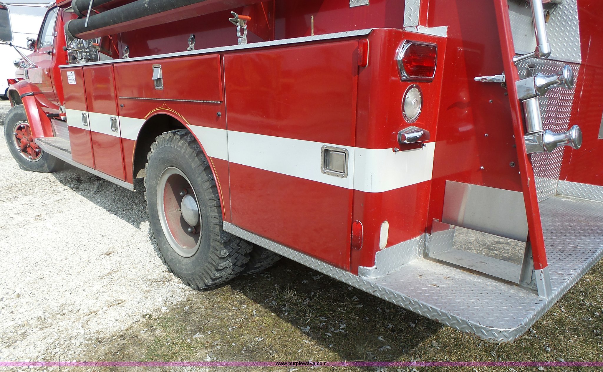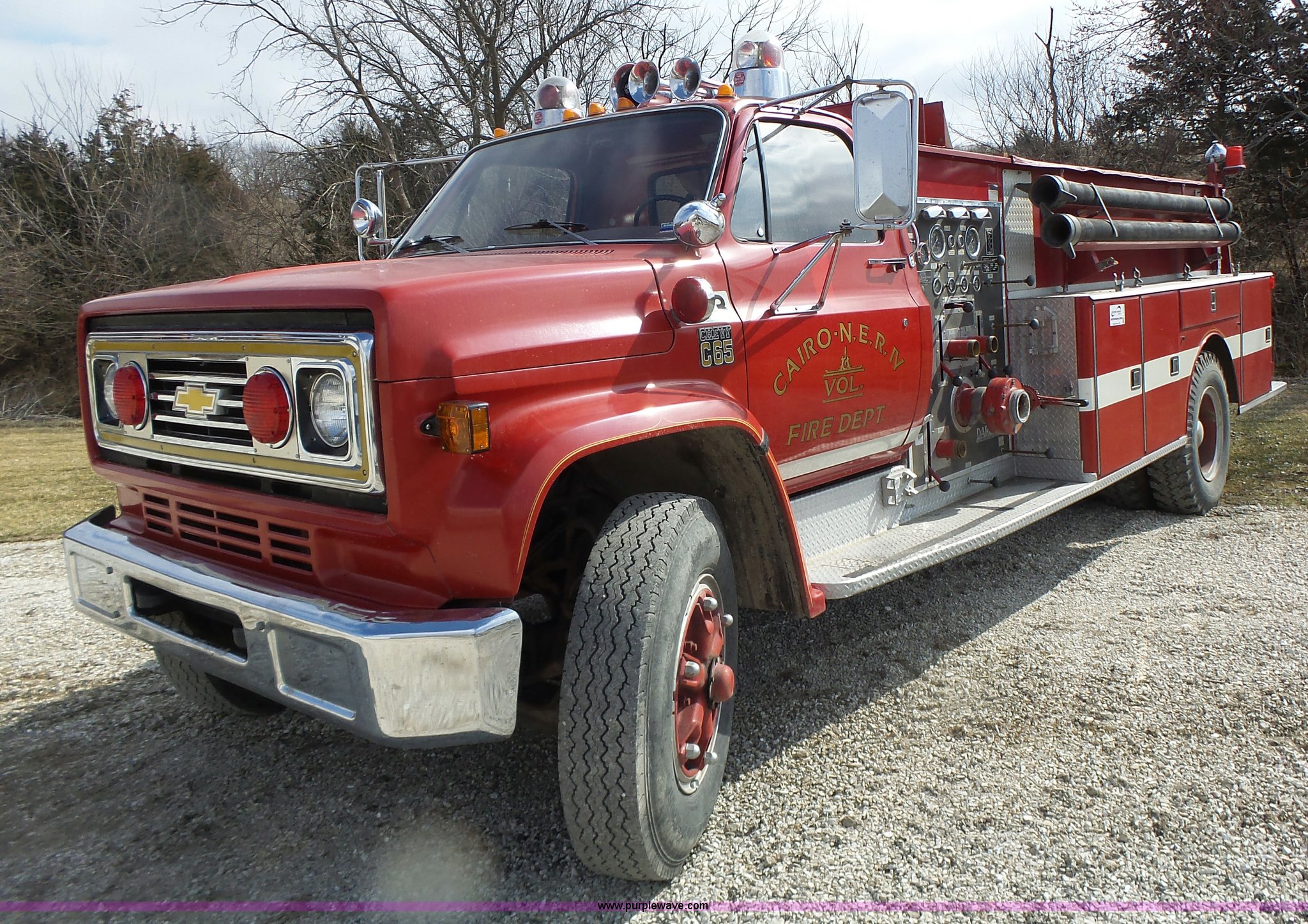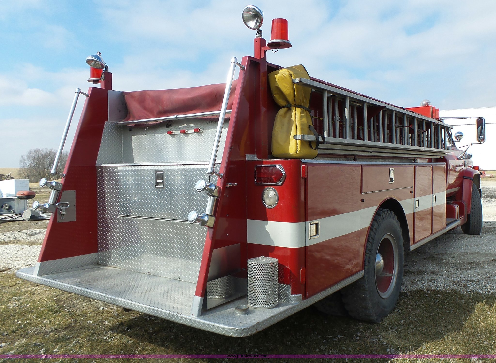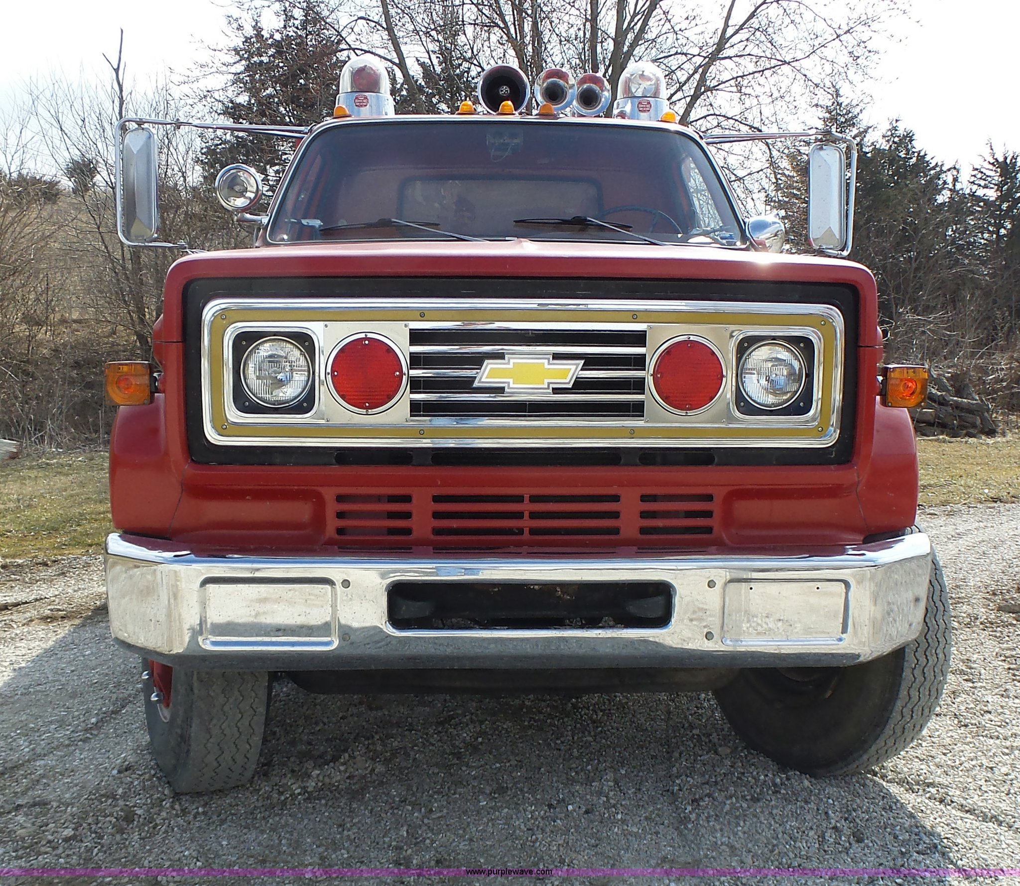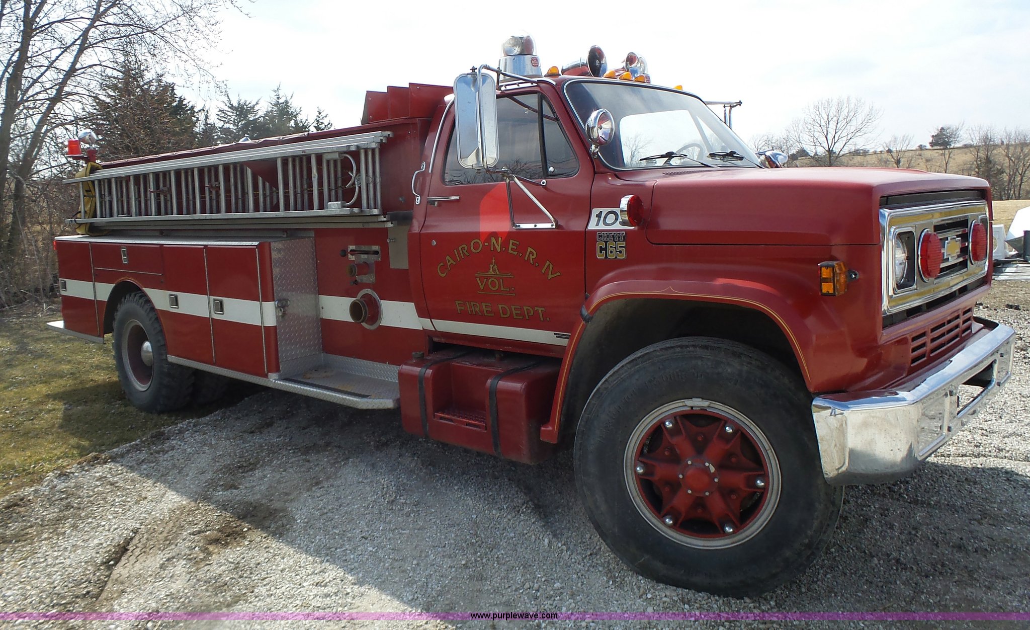 Purple Wave is selling a used Fire Truck or Emergency Vehicle in Missouri. This item is a 1975 Chevrolet C65 fire truck with the following: 21,337 miles on odometer, Eight cylinder gas engine, Five speed manual transmission, Two speed rear end, Single axle, Heat, Suspension seat, Champion 81289 platform, 750 gpm pump, Water gun, Work lights, Hose, Ladder, 10.00-20 tires