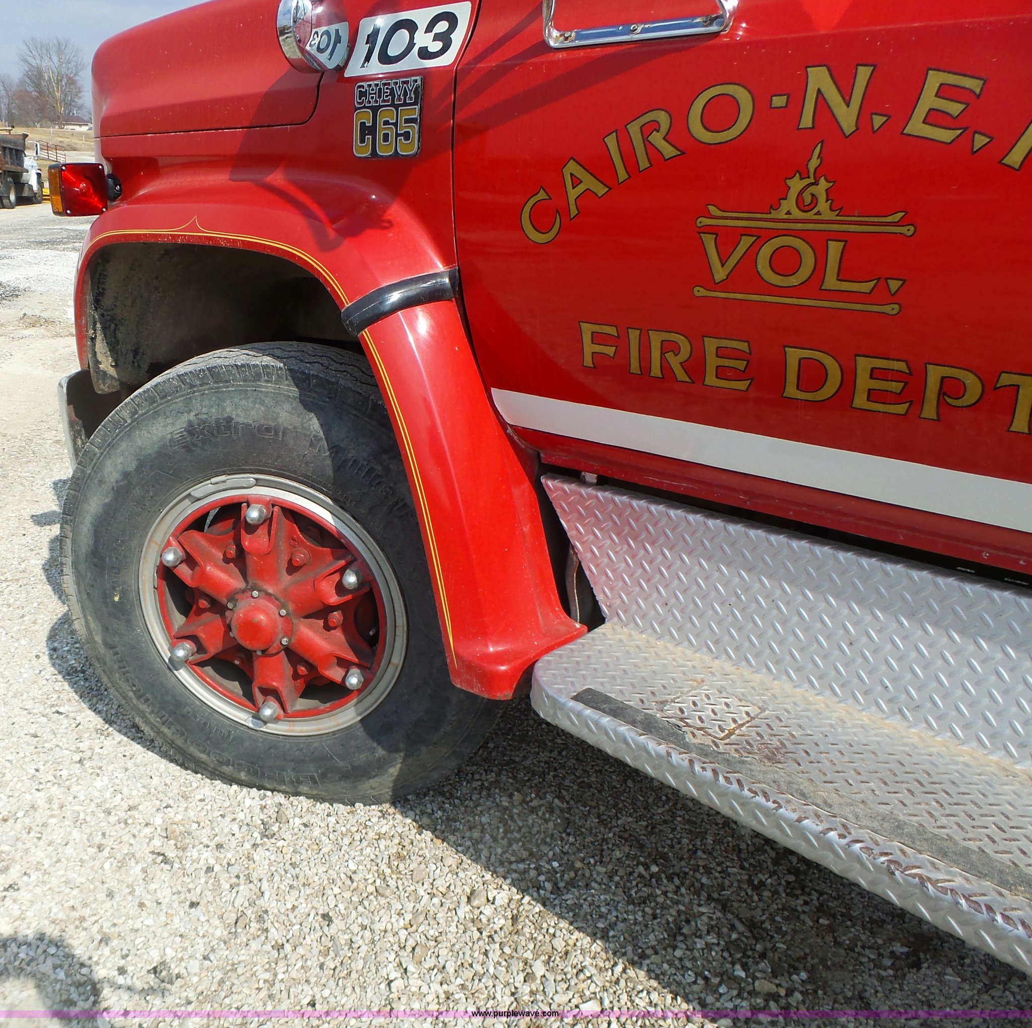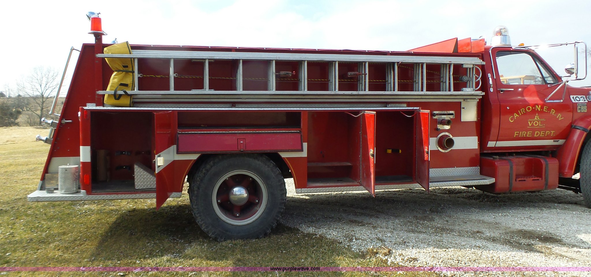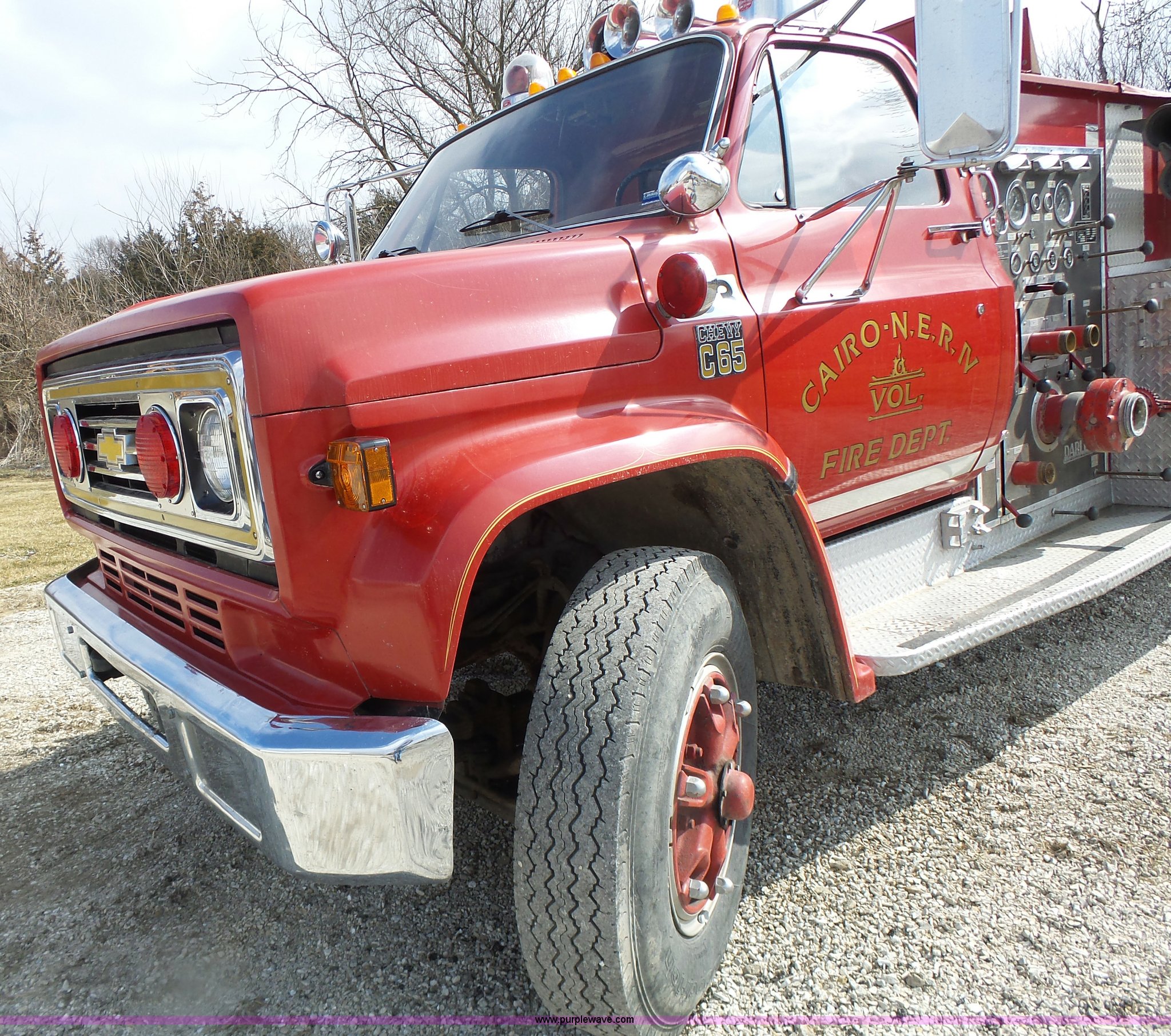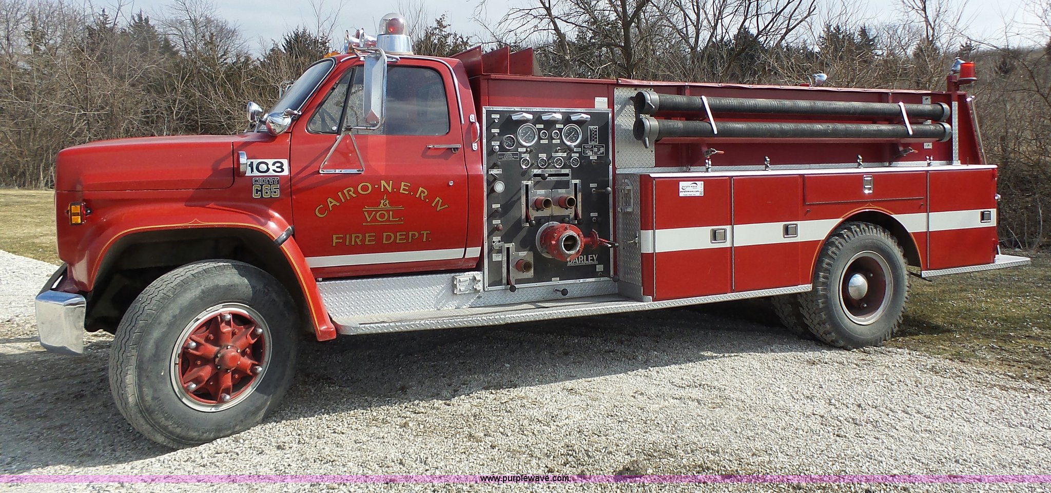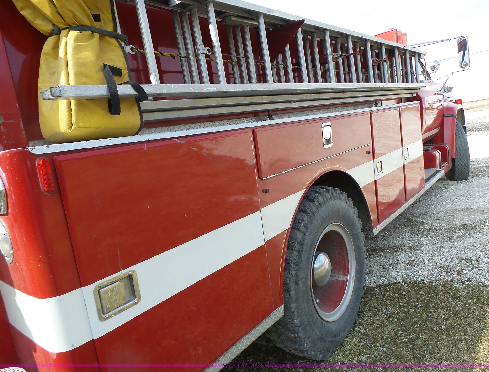 Purple Wave is selling a used Fire Truck or Emergency Vehicle in Missouri. This item is a 1975 Chevrolet C65 fire truck with the following: 21,337 miles on odometer, Eight cylinder gas engine, Five speed manual transmission, Two speed rear end, Single axle, Heat, Suspension seat, Champion 81289 platform, 750 gpm pump, Water gun, Work lights, Hose, Ladder, 10.00-20 tires