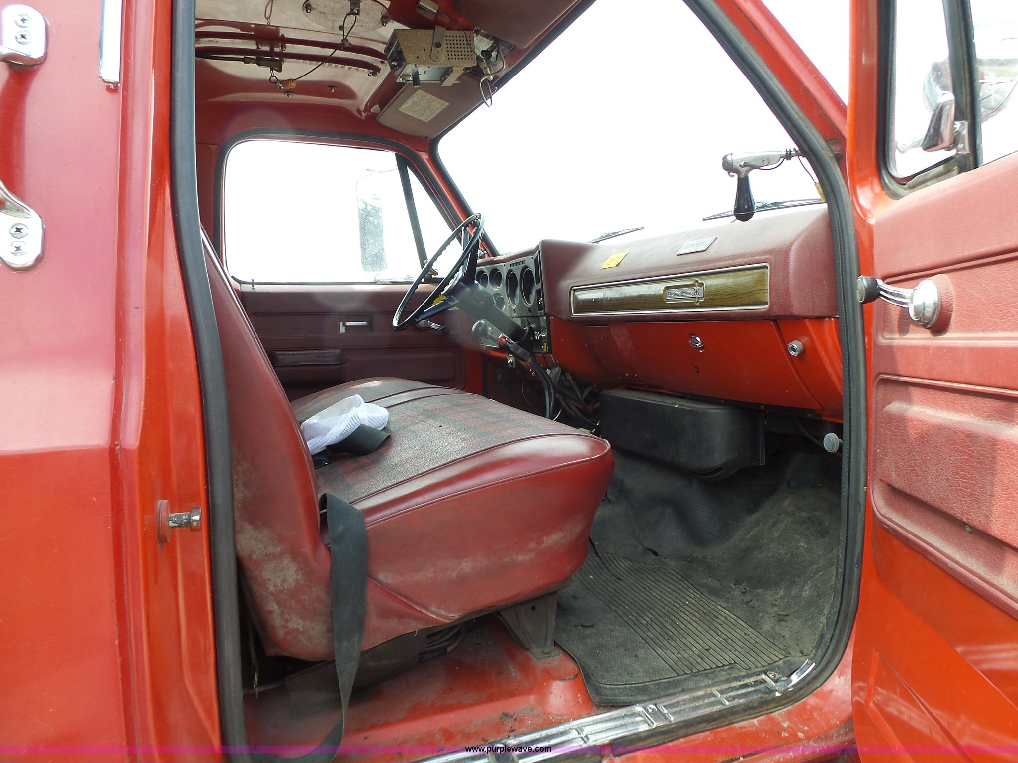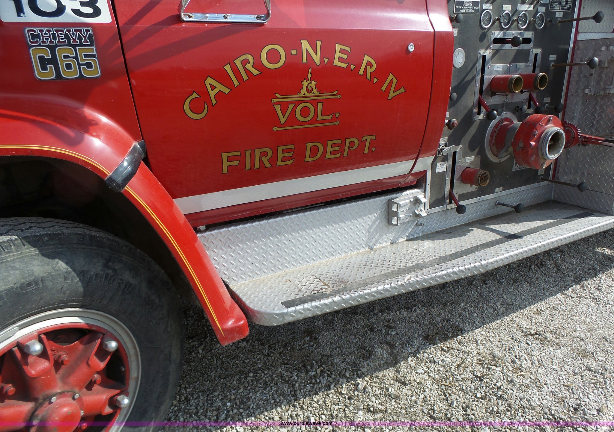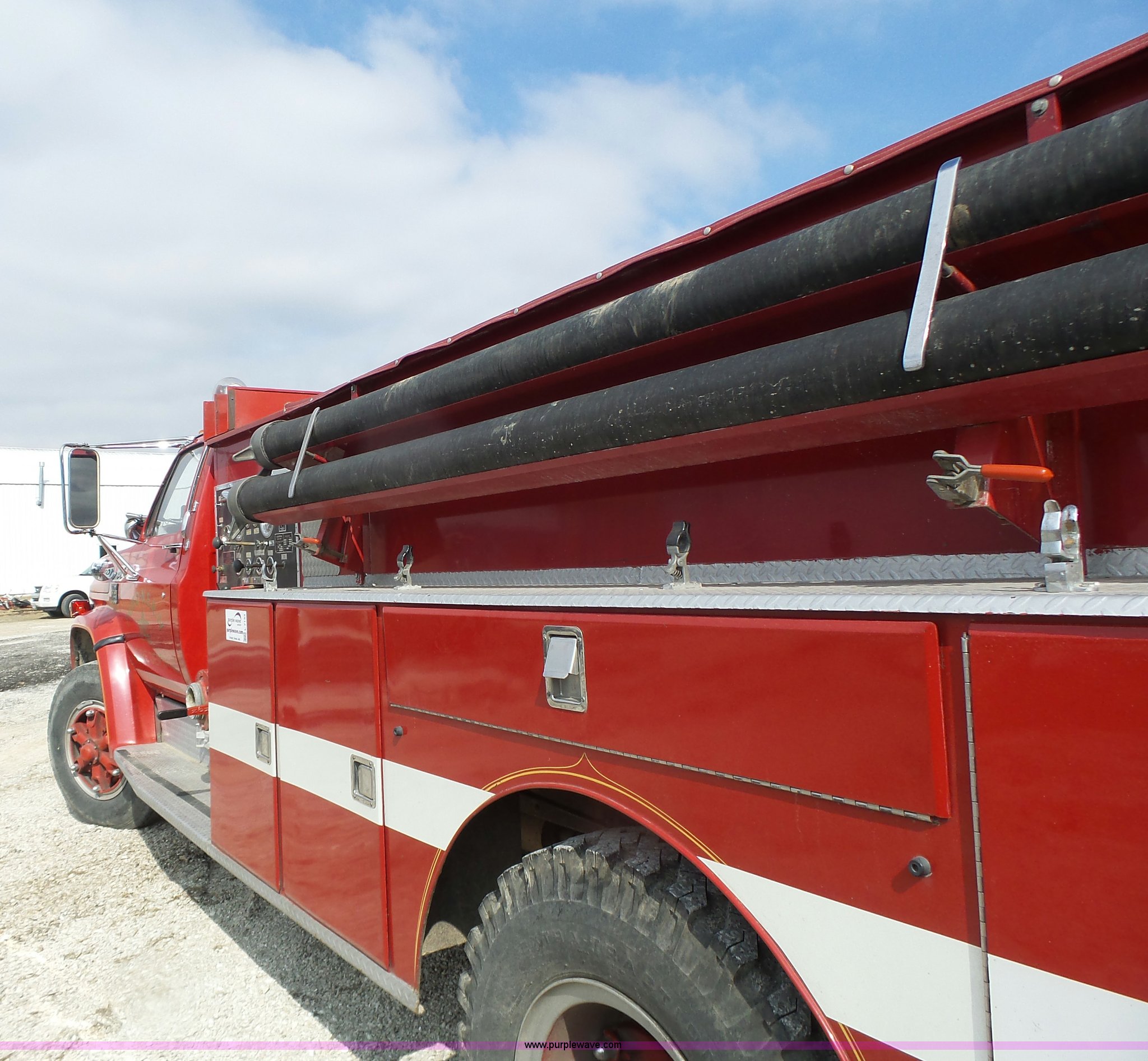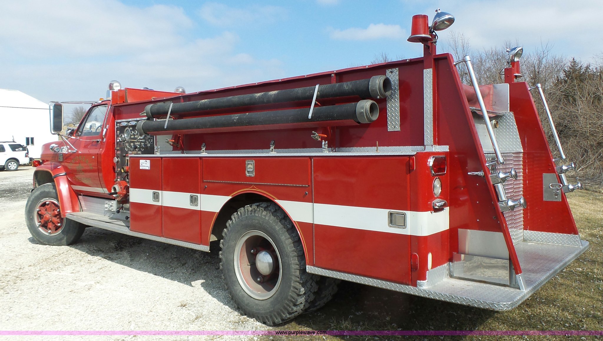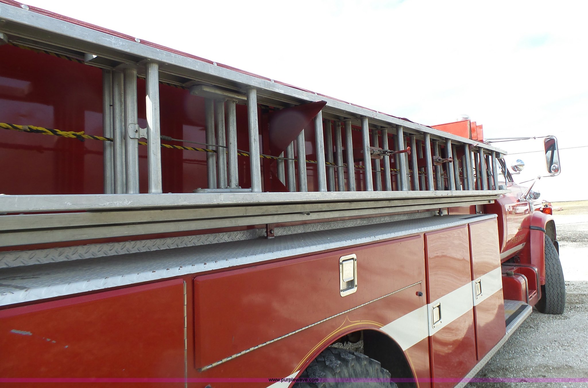 Purple Wave is selling a used Fire Truck or Emergency Vehicle in Missouri. This item is a 1975 Chevrolet C65 fire truck with the following: 21,337 miles on odometer, Eight cylinder gas engine, Five speed manual transmission, Two speed rear end, Single axle, Heat, Suspension seat, Champion 81289 platform, 750 gpm pump, Water gun, Work lights, Hose, Ladder, 10.00-20 tires