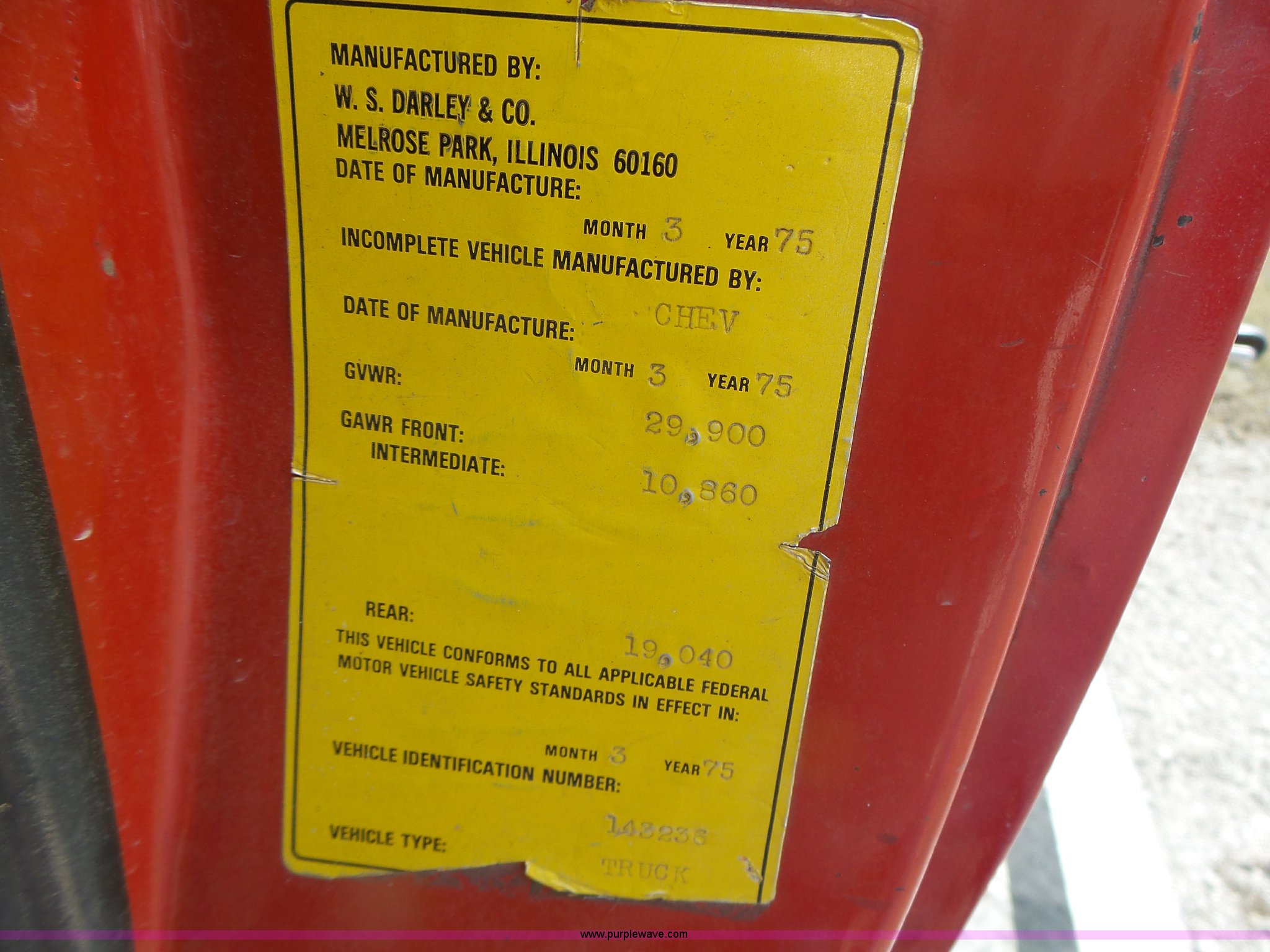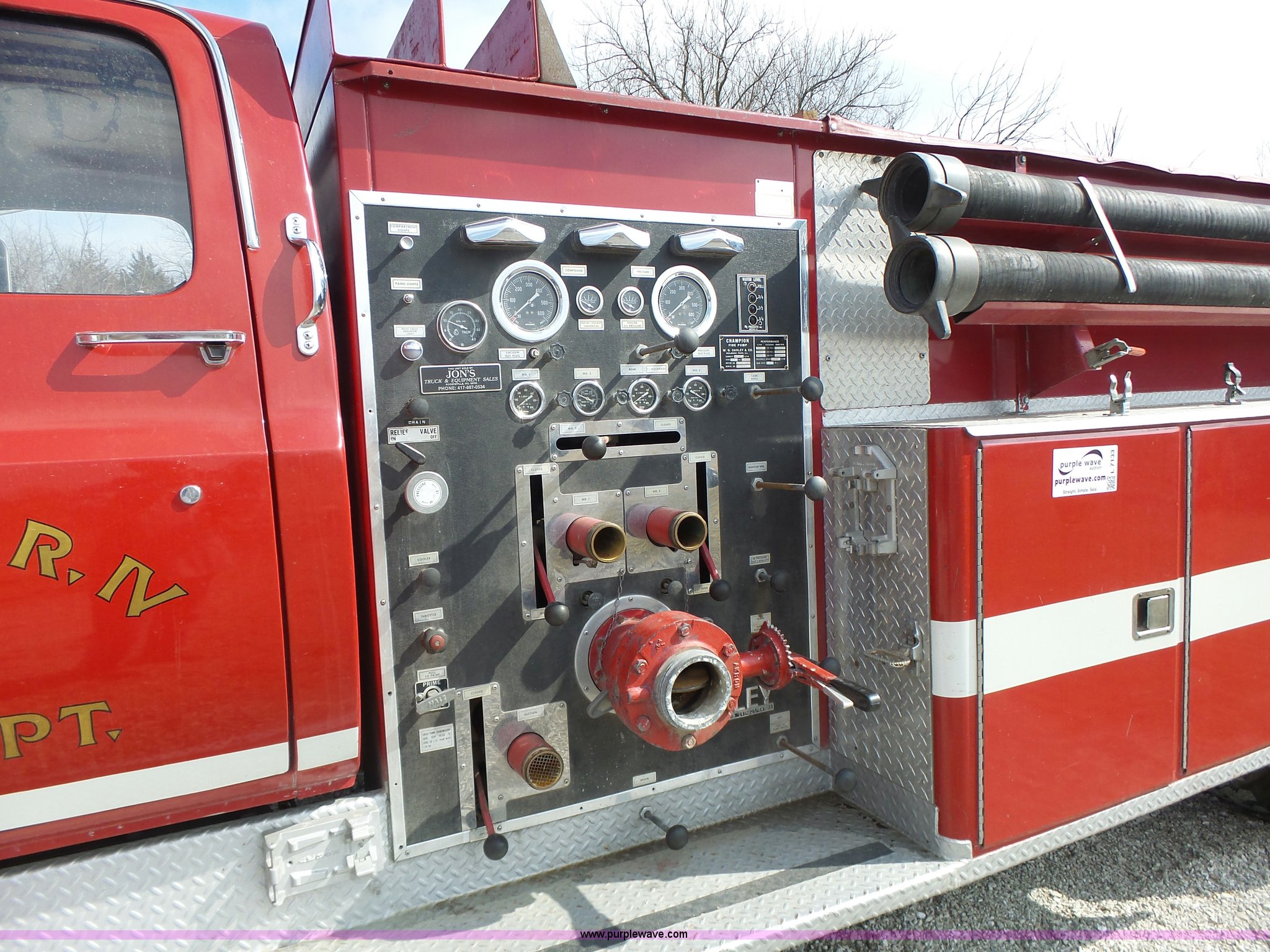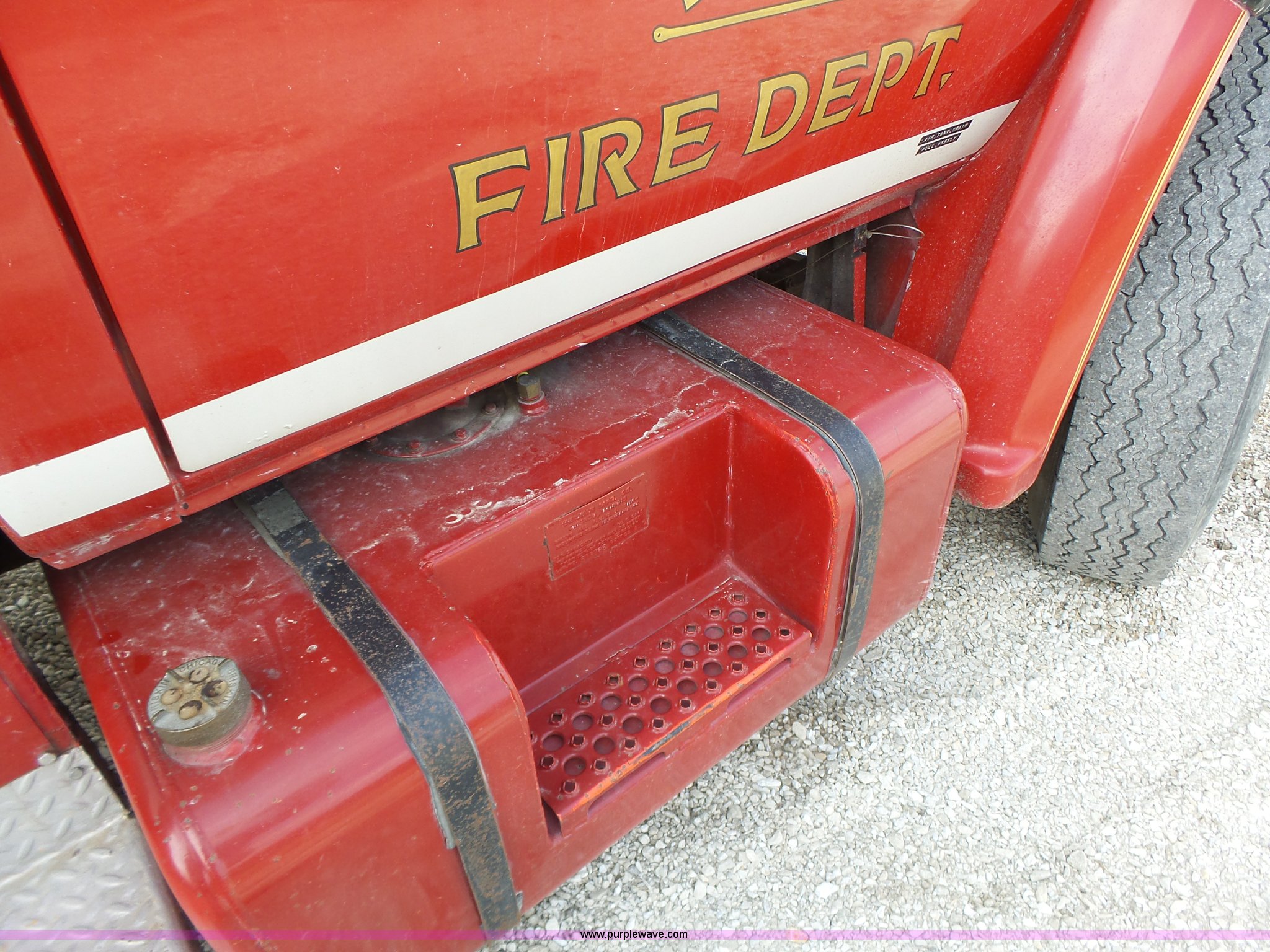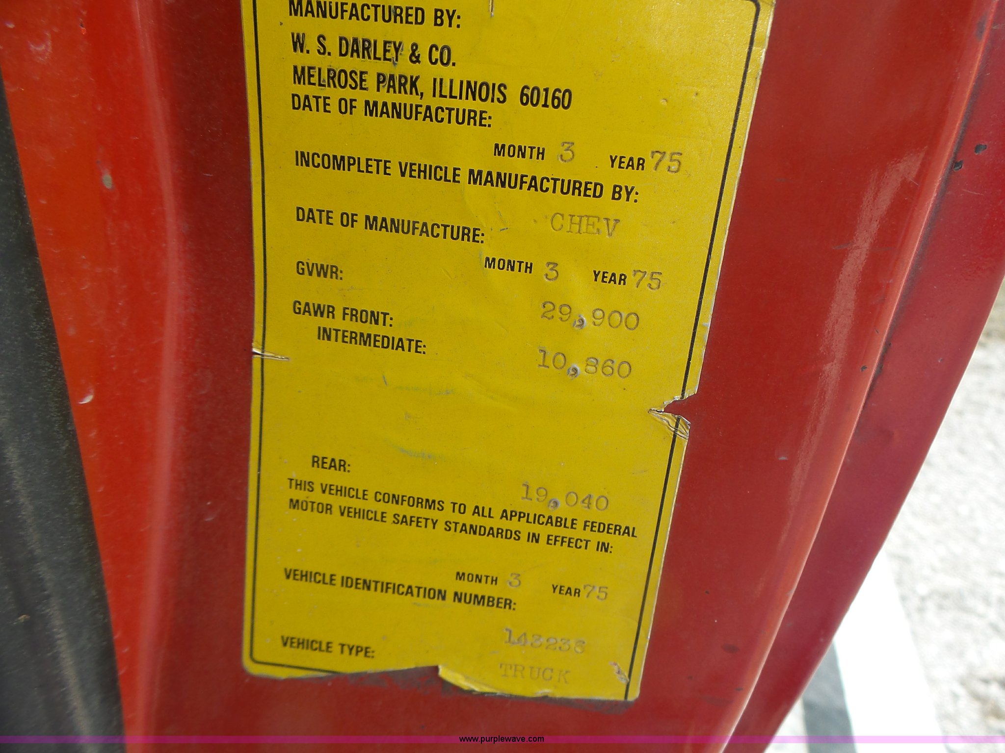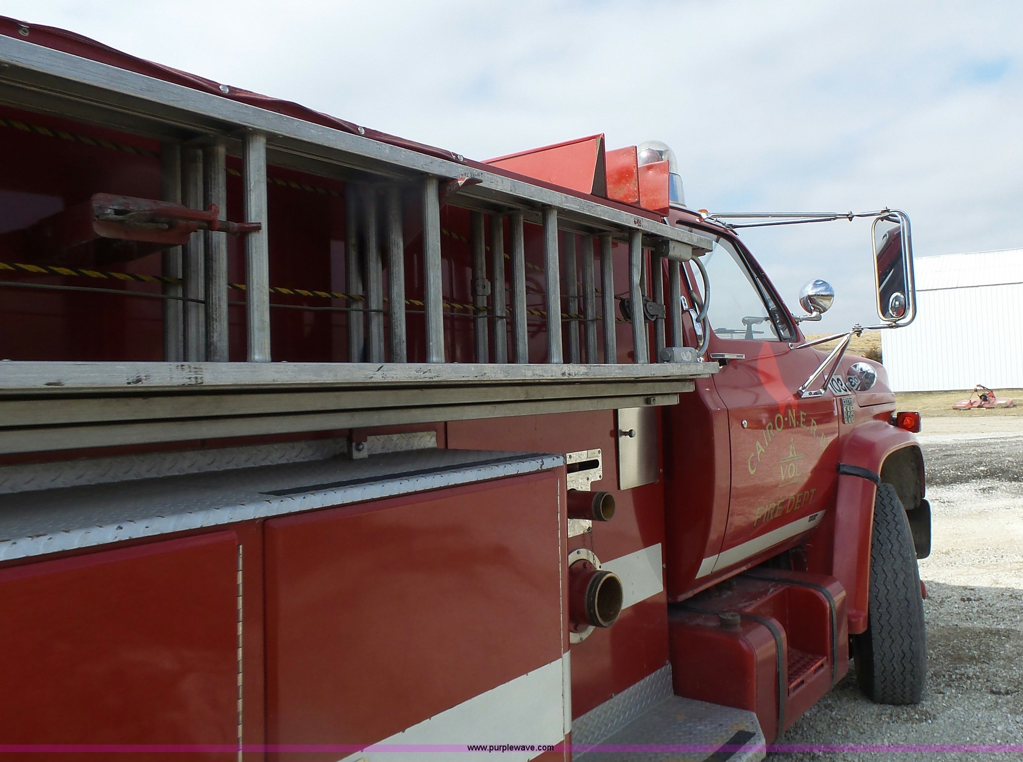 Purple Wave is selling a used Fire Truck or Emergency Vehicle in Missouri. This item is a 1975 Chevrolet C65 fire truck with the following: 21,337 miles on odometer, Eight cylinder gas engine, Five speed manual transmission, Two speed rear end, Single axle, Heat, Suspension seat, Champion 81289 platform, 750 gpm pump, Water gun, Work lights, Hose, Ladder, 10.00-20 tires