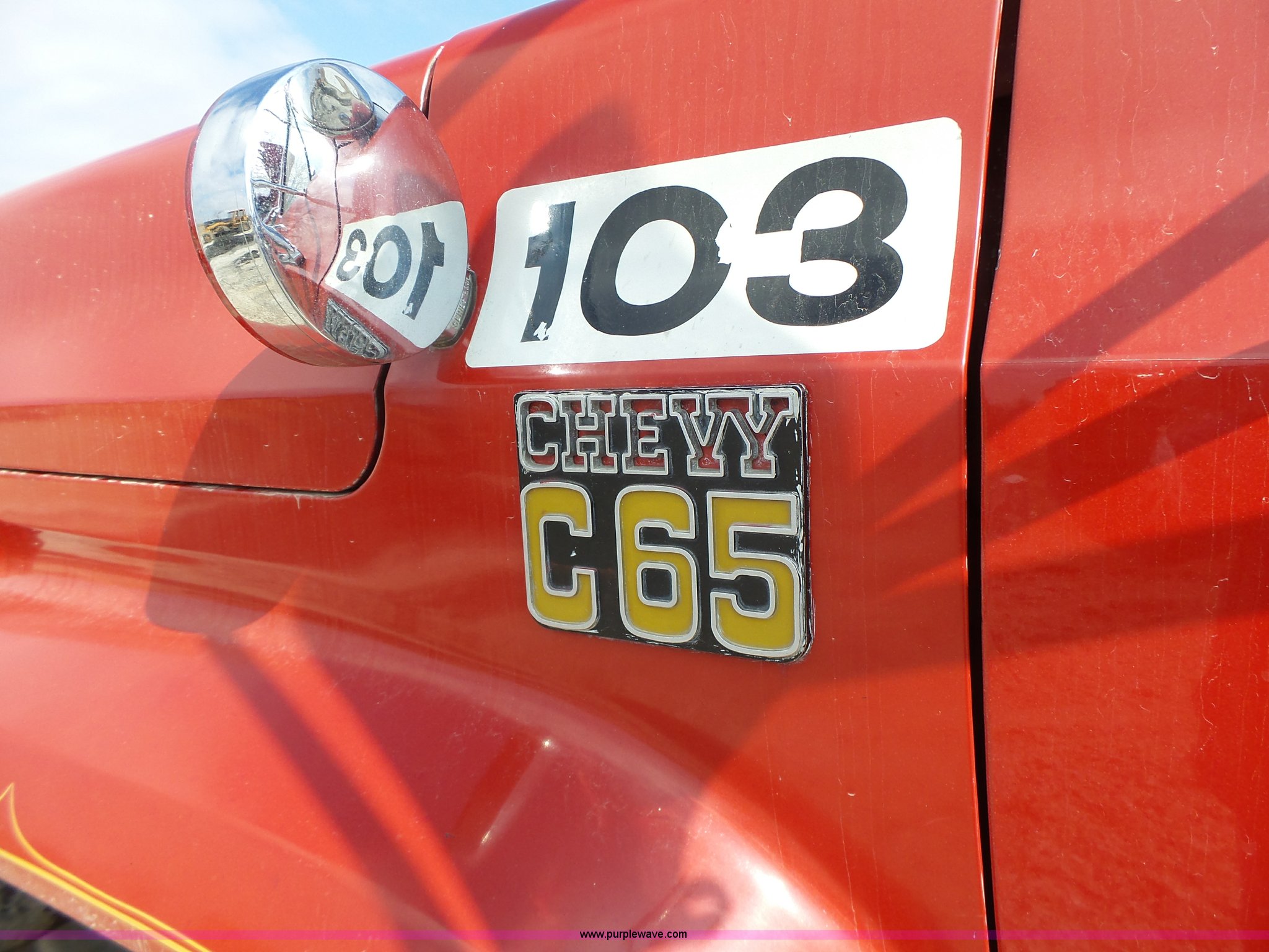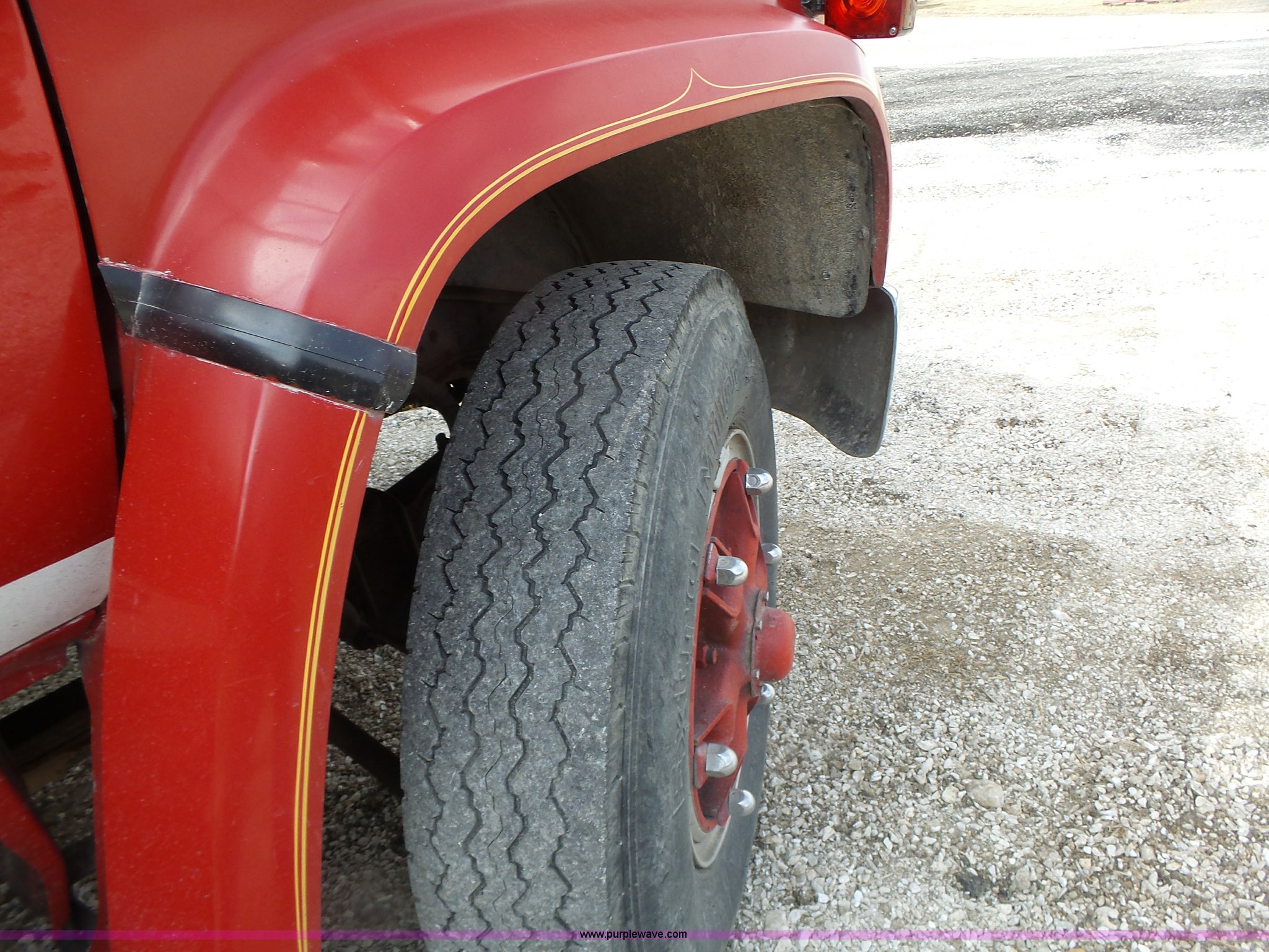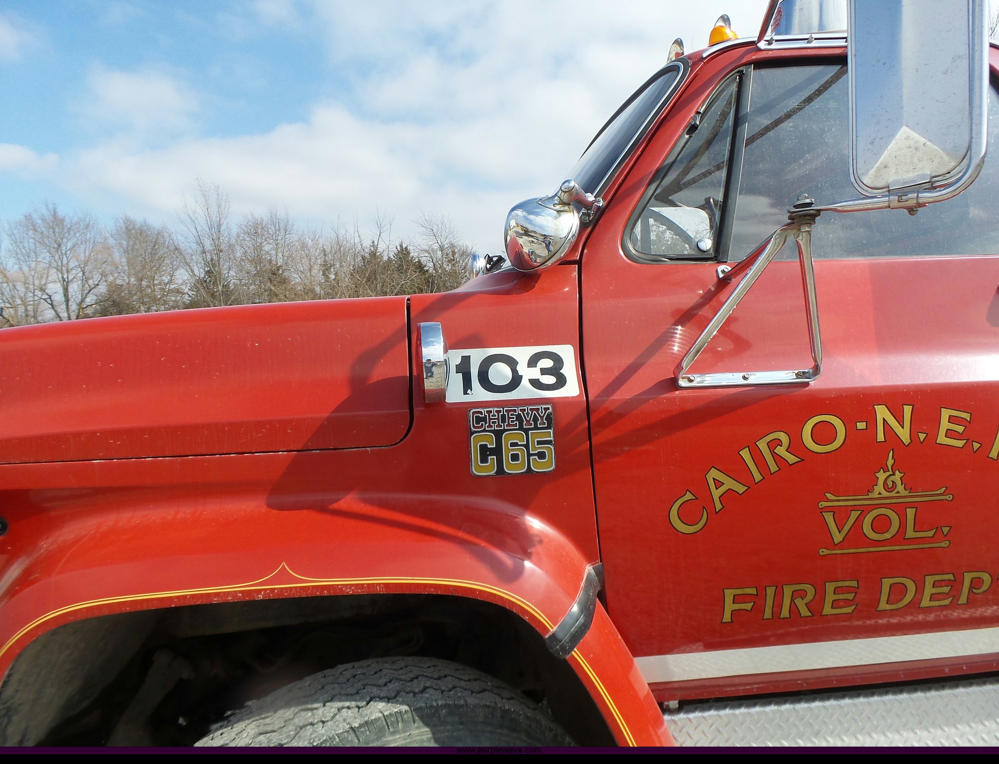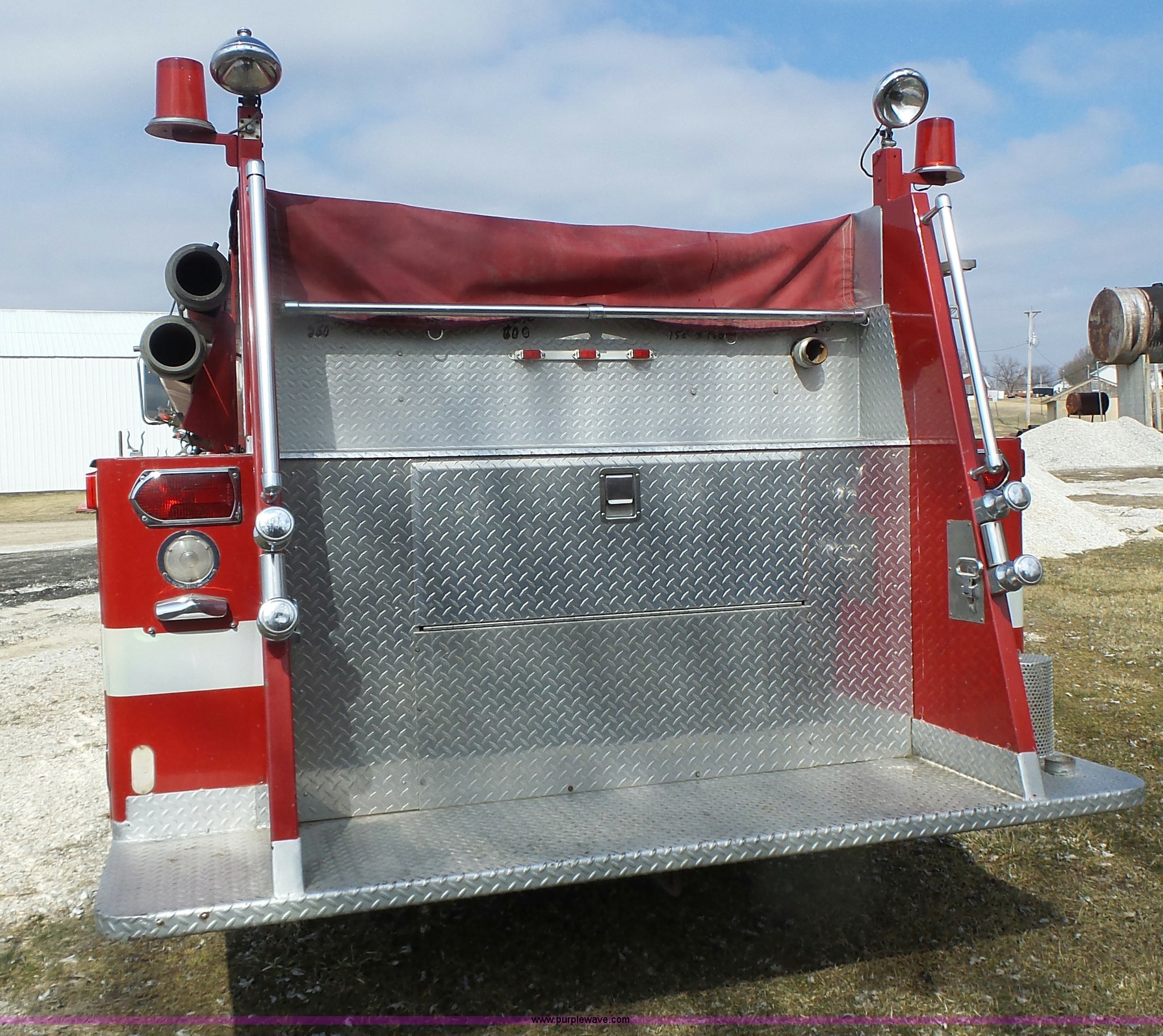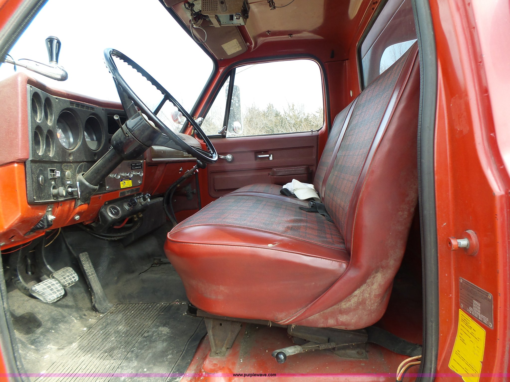 Purple Wave is selling a used Fire Truck or Emergency Vehicle in Missouri. This item is a 1975 Chevrolet C65 fire truck with the following: 21,337 miles on odometer, Eight cylinder gas engine, Five speed manual transmission, Two speed rear end, Single axle, Heat, Suspension seat, Champion 81289 platform, 750 gpm pump, Water gun, Work lights, Hose, Ladder, 10.00-20 tires