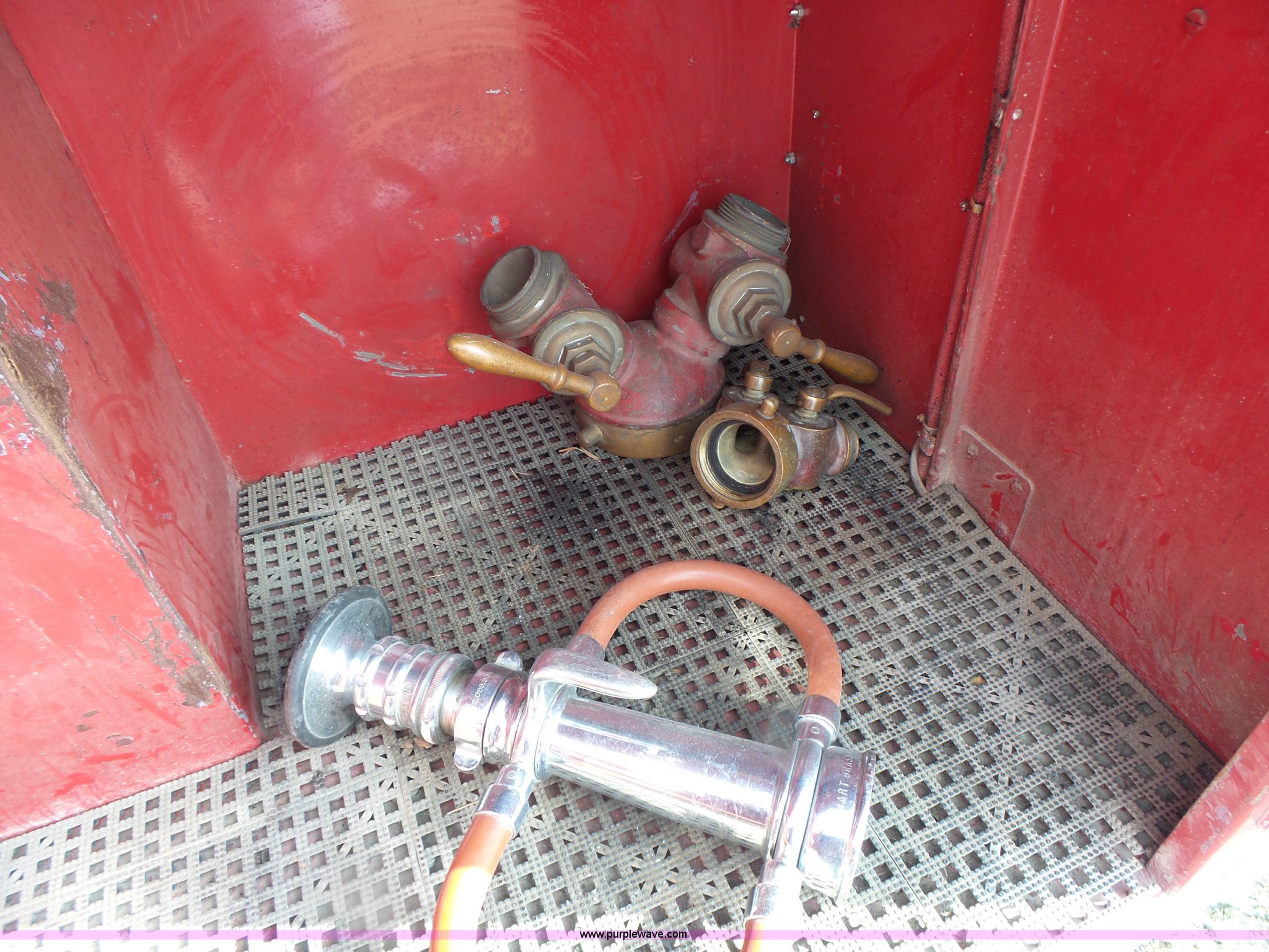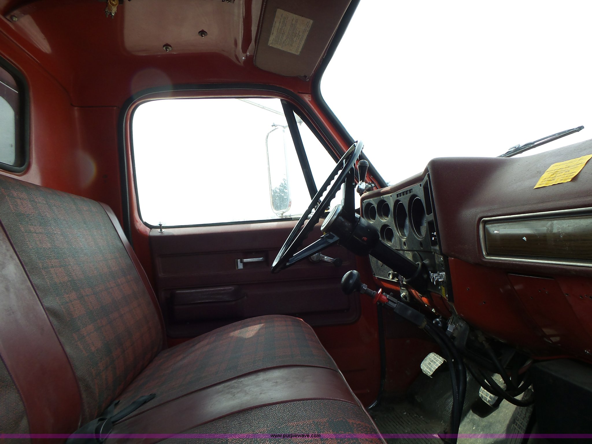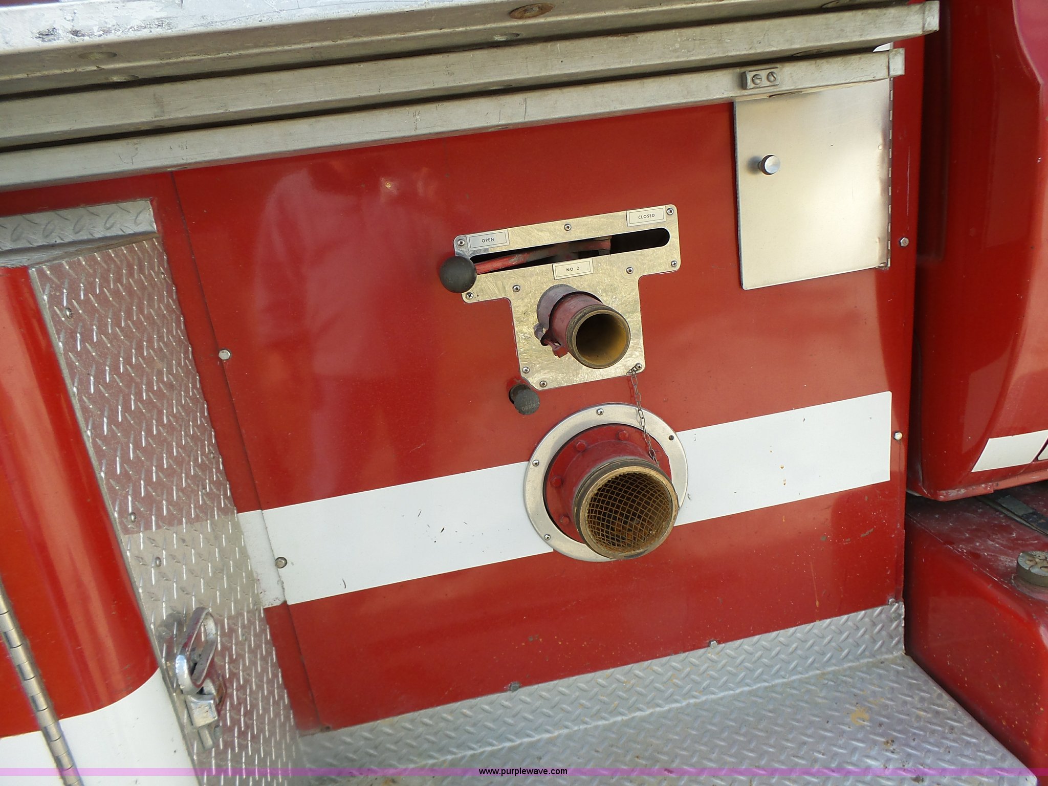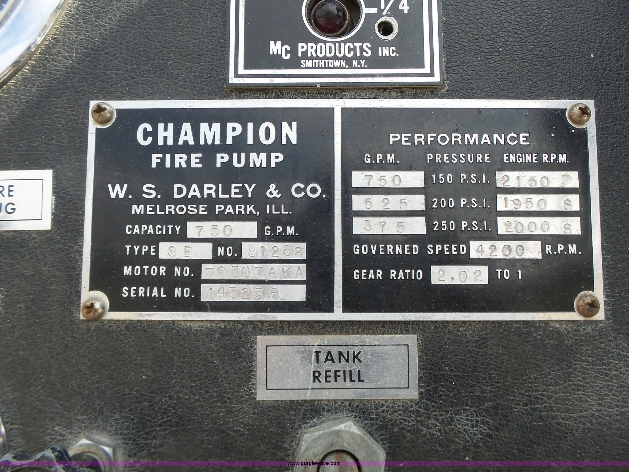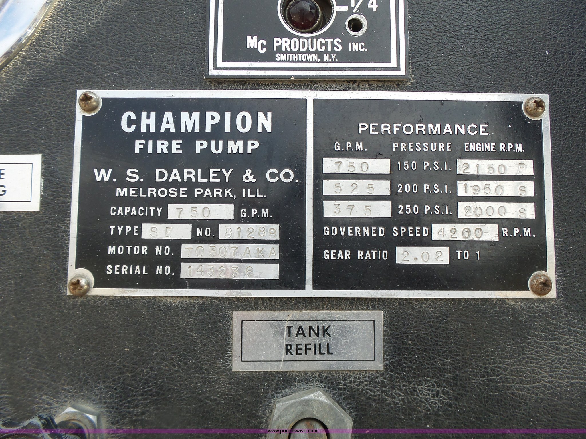 Purple Wave is selling a used Fire Truck or Emergency Vehicle in Missouri. This item is a 1975 Chevrolet C65 fire truck with the following: 21,337 miles on odometer, Eight cylinder gas engine, Five speed manual transmission, Two speed rear end, Single axle, Heat, Suspension seat, Champion 81289 platform, 750 gpm pump, Water gun, Work lights, Hose, Ladder, 10.00-20 tires