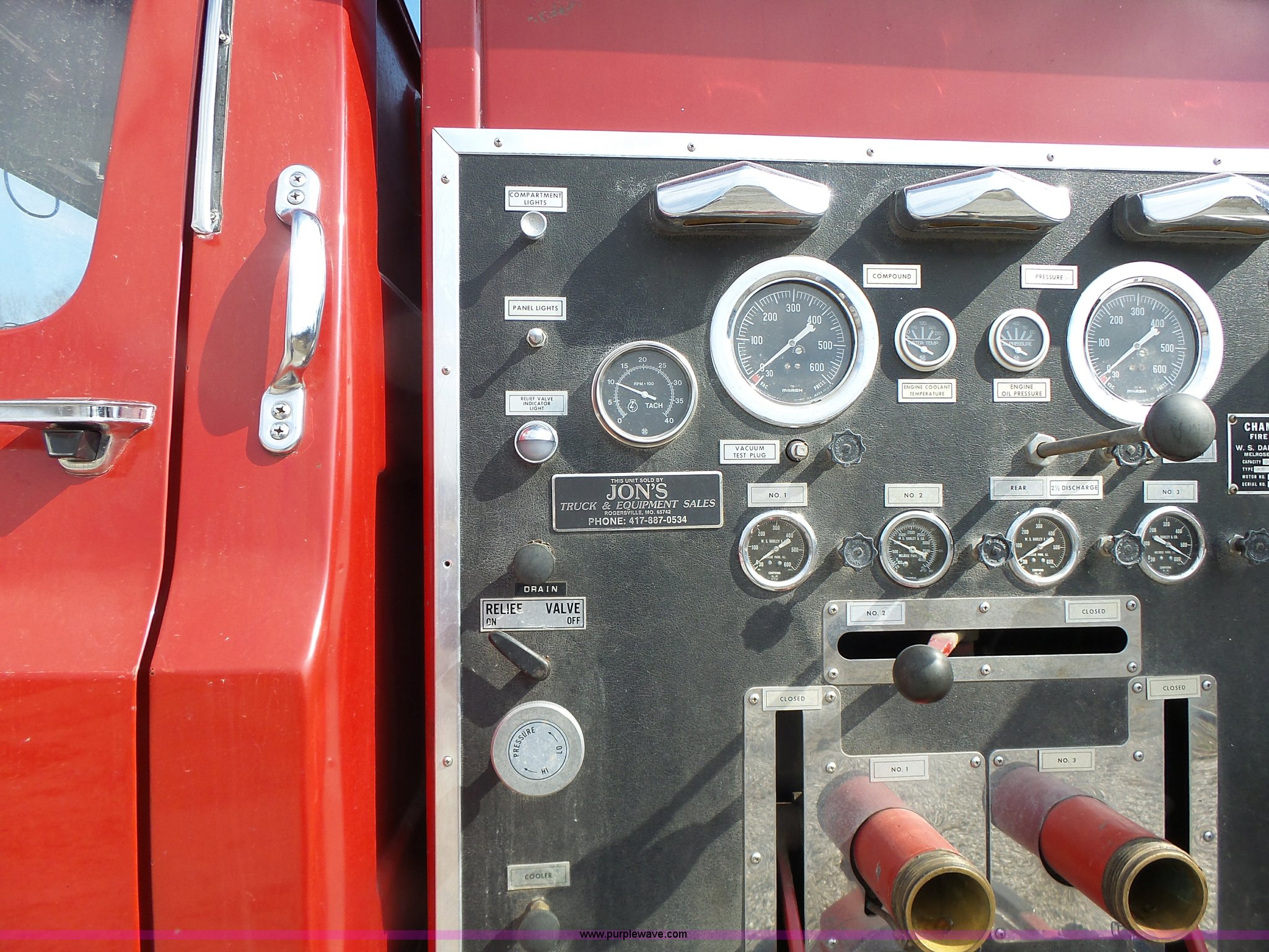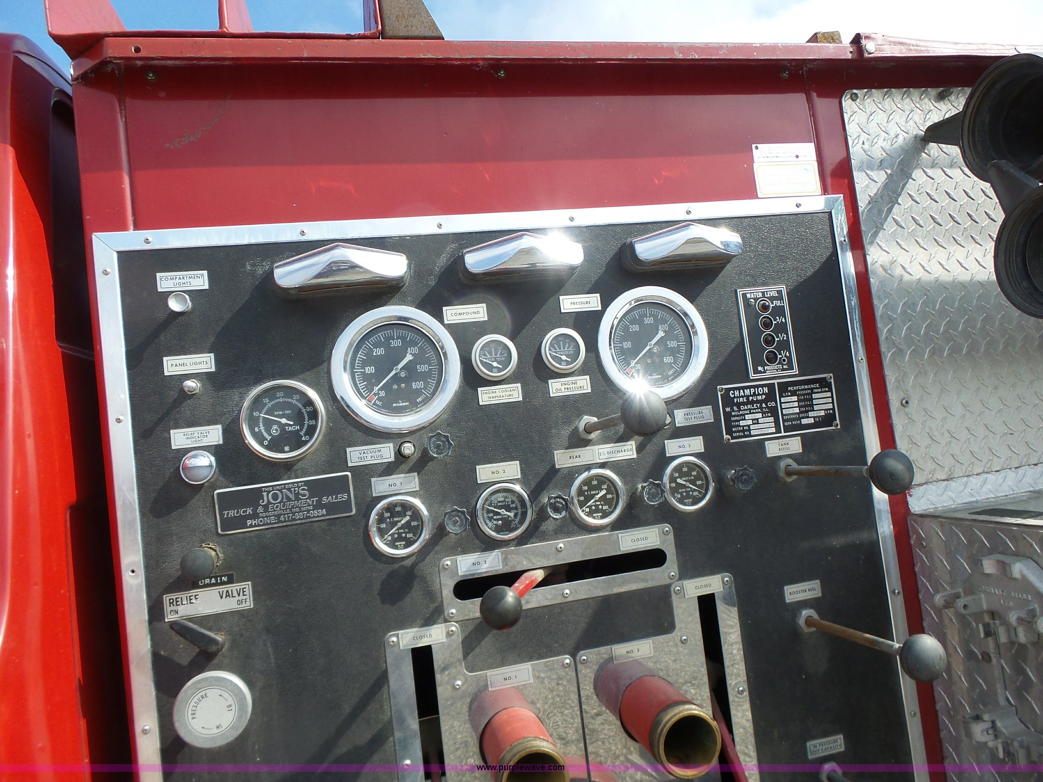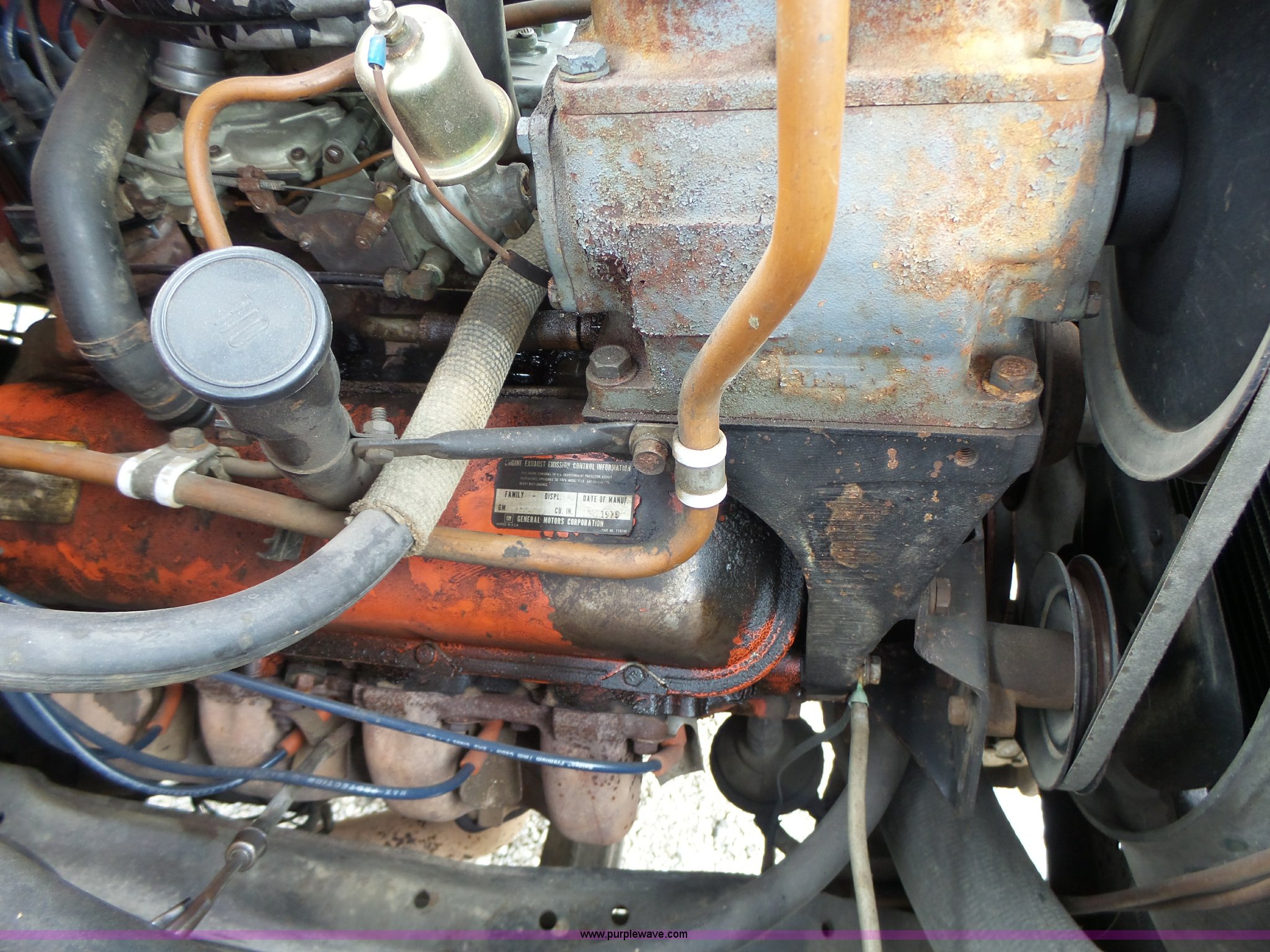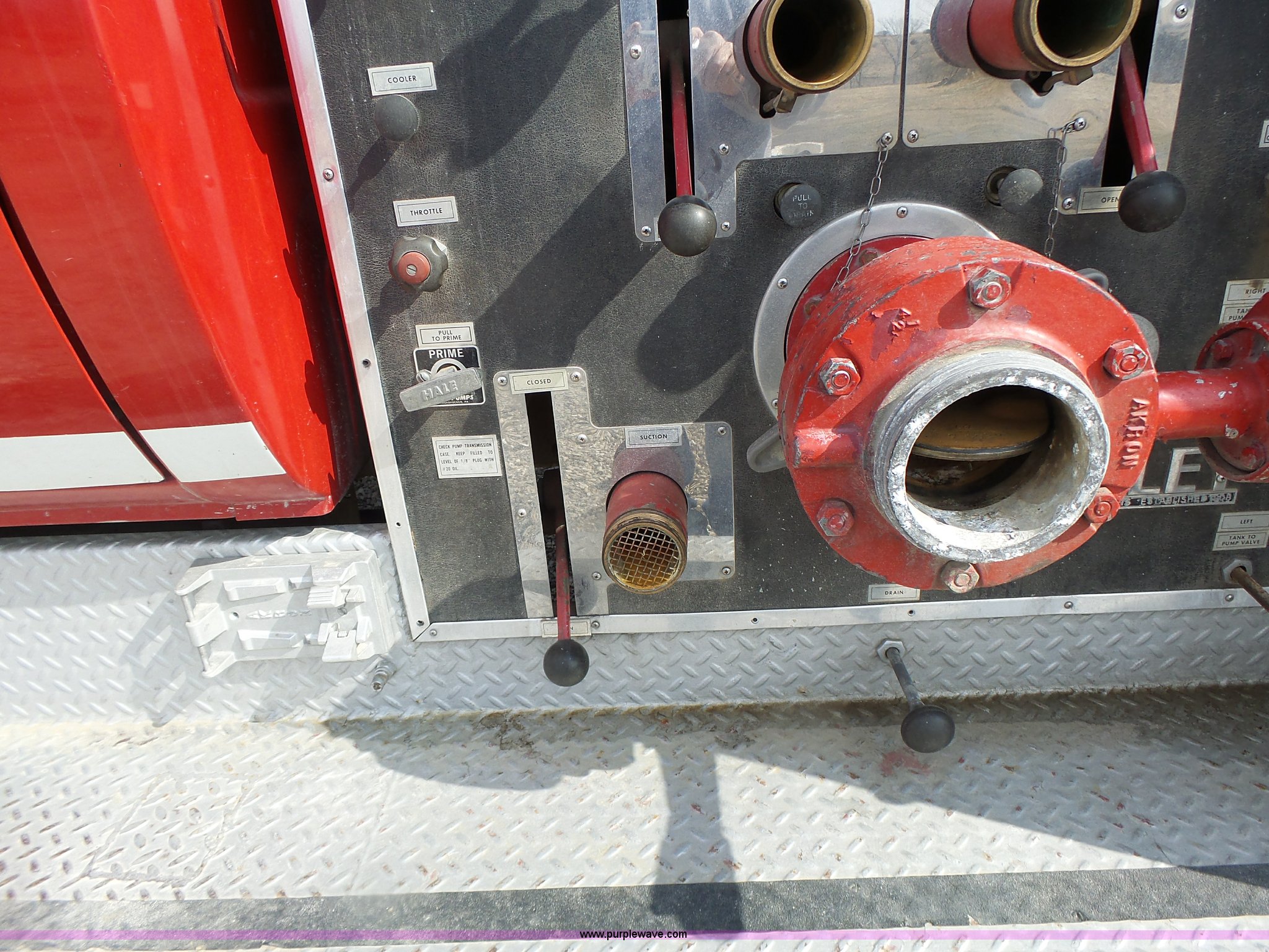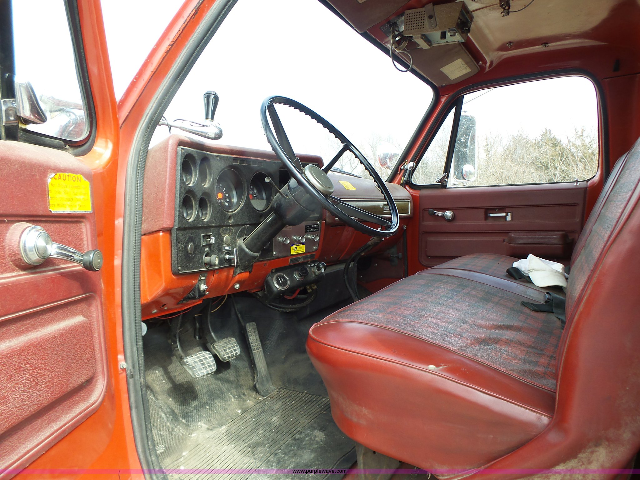 Purple Wave is selling a used Fire Truck or Emergency Vehicle in Missouri. This item is a 1975 Chevrolet C65 fire truck with the following: 21,337 miles on odometer, Eight cylinder gas engine, Five speed manual transmission, Two speed rear end, Single axle, Heat, Suspension seat, Champion 81289 platform, 750 gpm pump, Water gun, Work lights, Hose, Ladder, 10.00-20 tires