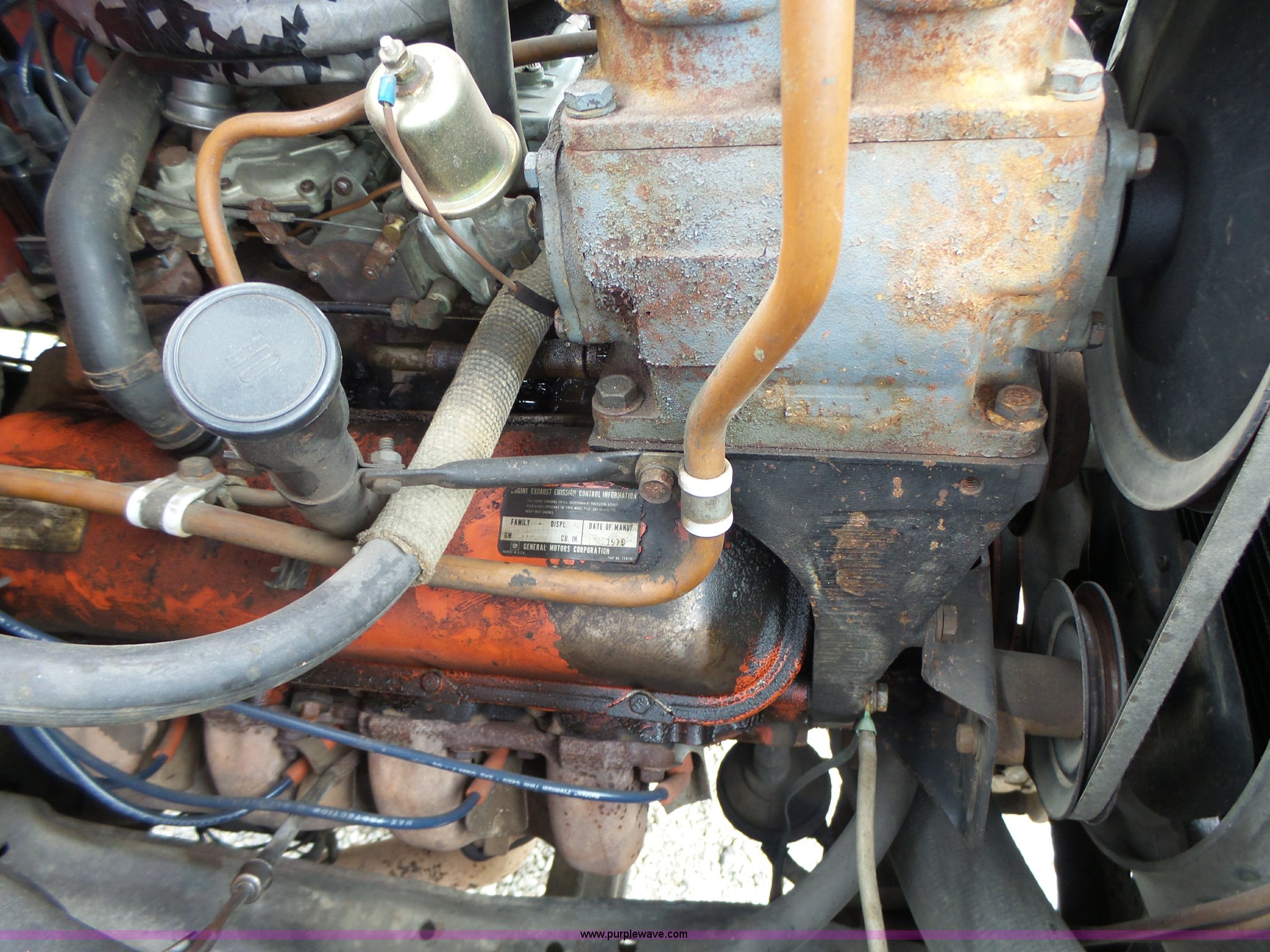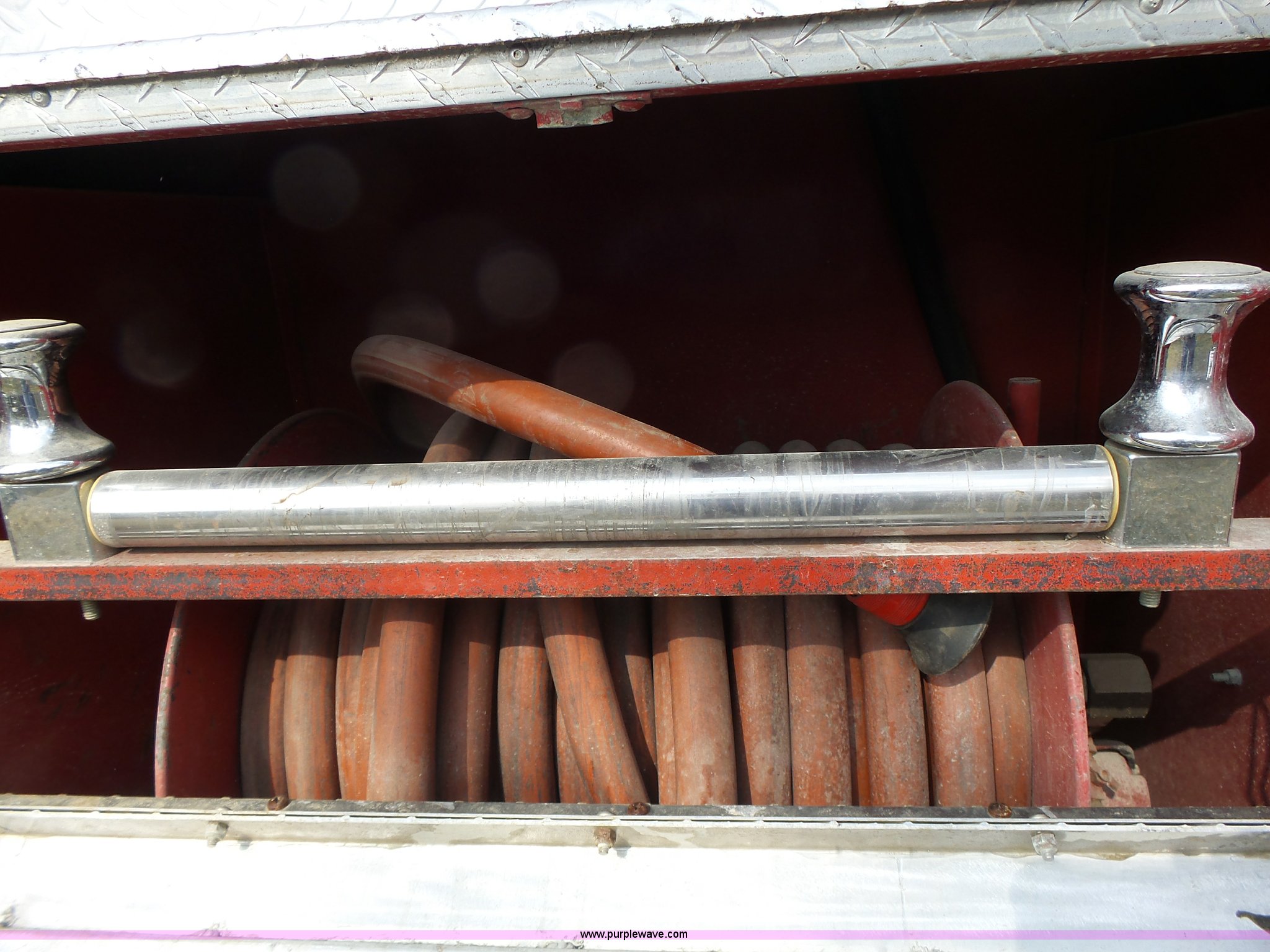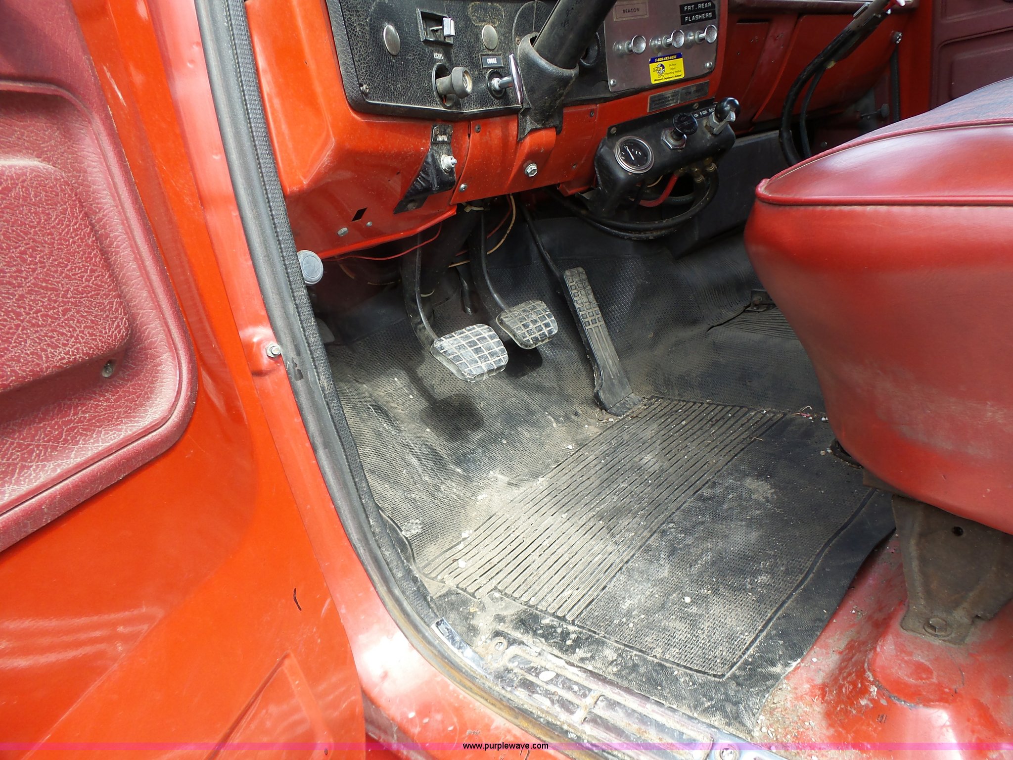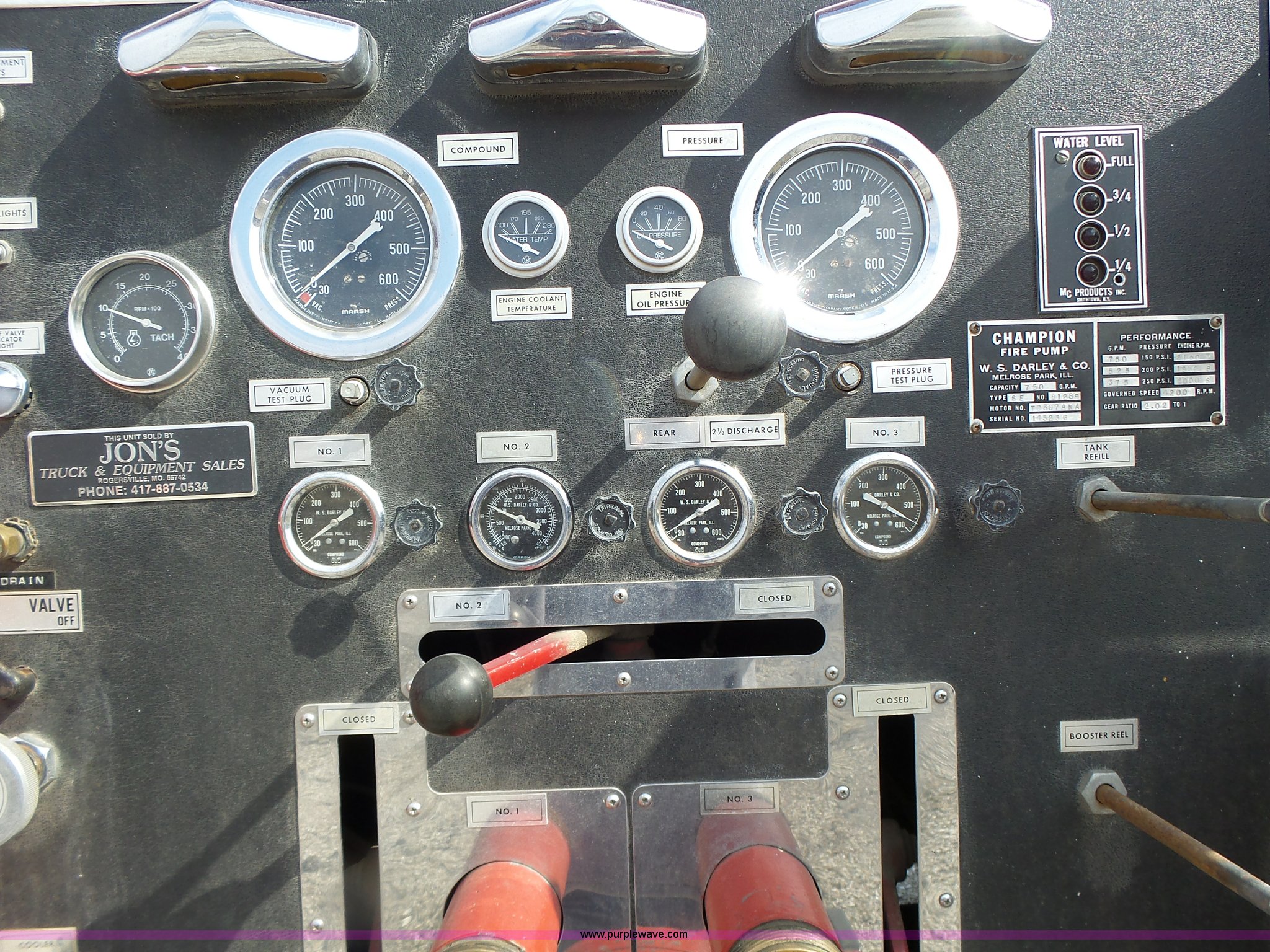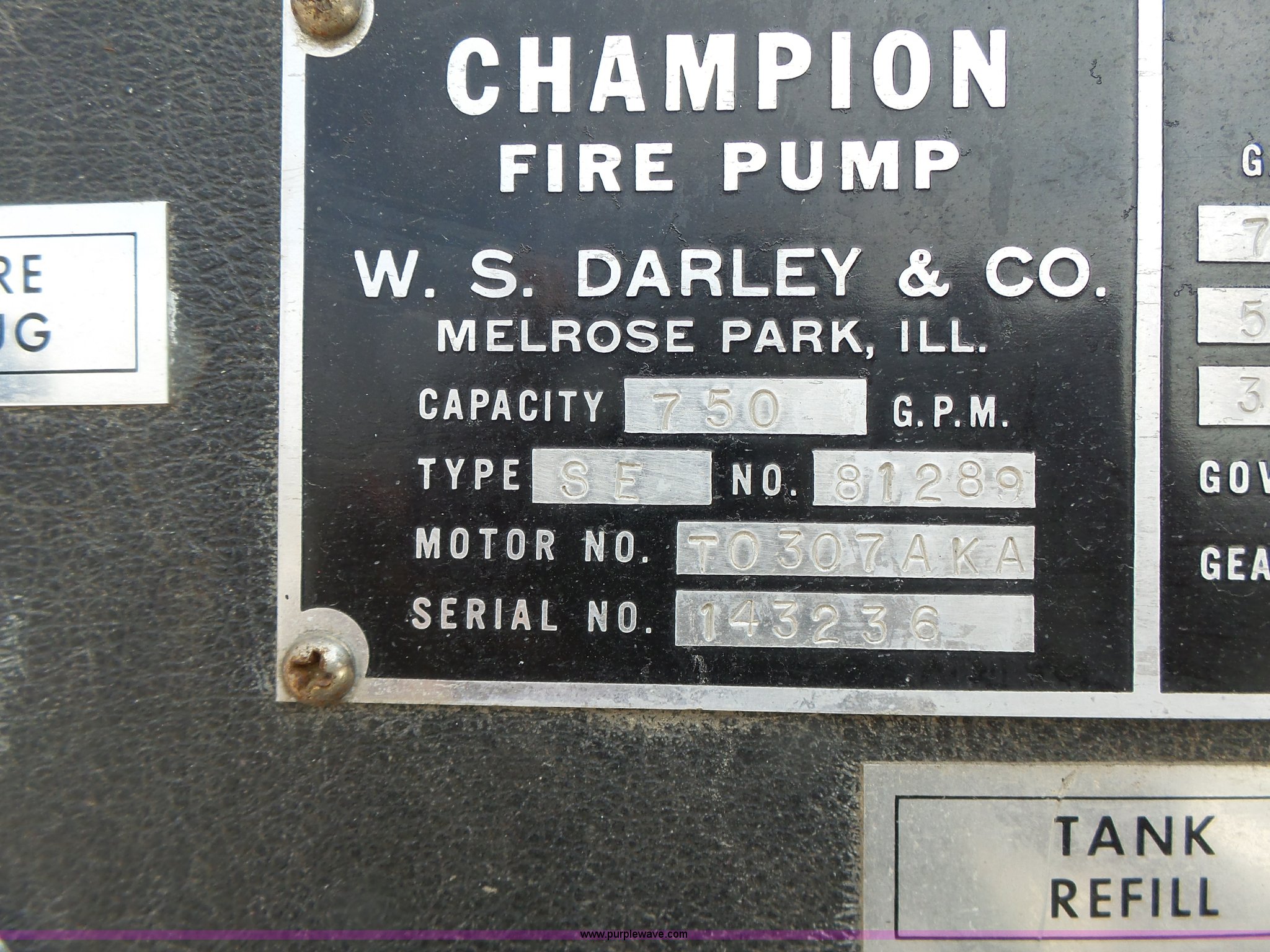Purple Wave is selling a used Fire Truck or Emergency Vehicle in Missouri. This item is a 1975 Chevrolet C65 fire truck with the following: 21,337 miles on odometer, Eight cylinder gas engine, Five speed manual transmission, Two speed rear end, Single axle, Heat, Suspension seat, Champion 81289 platform, 750 gpm pump, Water gun, Work lights, Hose, Ladder, 10.00-20 tires
