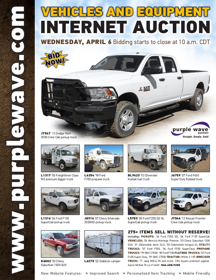 This auction is conducted by Purple Wave, Inc., whose home office is 825 Levee Drive, Manhattan, Kansas. Aaron McKee, Texas auctioneer license # 16401, operates Purple Wave, Inc. Complaints against us may be directed to the Texas Department of Licensing and Regulation, P.O. Box 12157, Austin, Texas 78711, (512) 463-6599. For additional required information, see the attached document.
