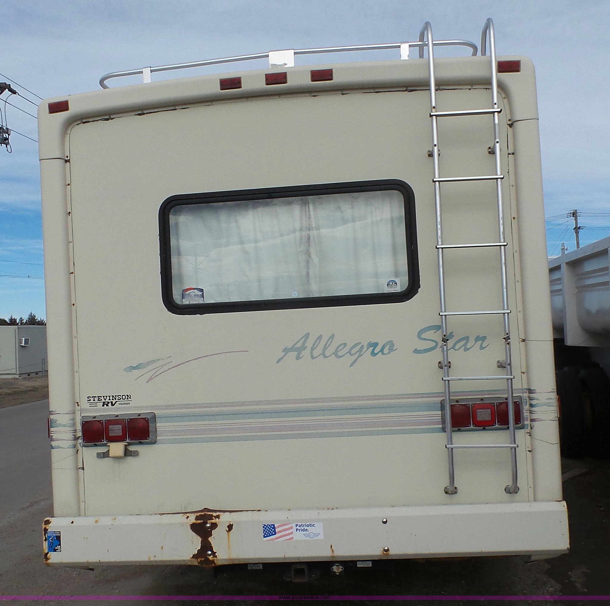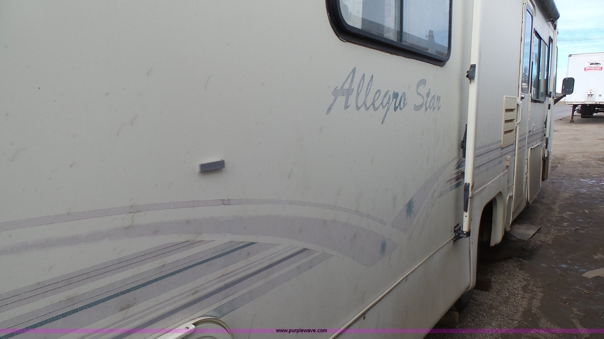 Purple Wave is selling a used RV in Kansas. This item is a 1997 Chevrolet Allegro Star RV with the following: 65,656 miles on odometer, 7.4L V8 OHV 16V gas engine, Automatic transmission, Heat, Television, Oven, Microwave, Awning, 31'L, Generator, 7,290 hours on meter, 225/70R19.5 tires, Interior/exterior cosmetic damage, Non-operational engine, Unknown operating condition