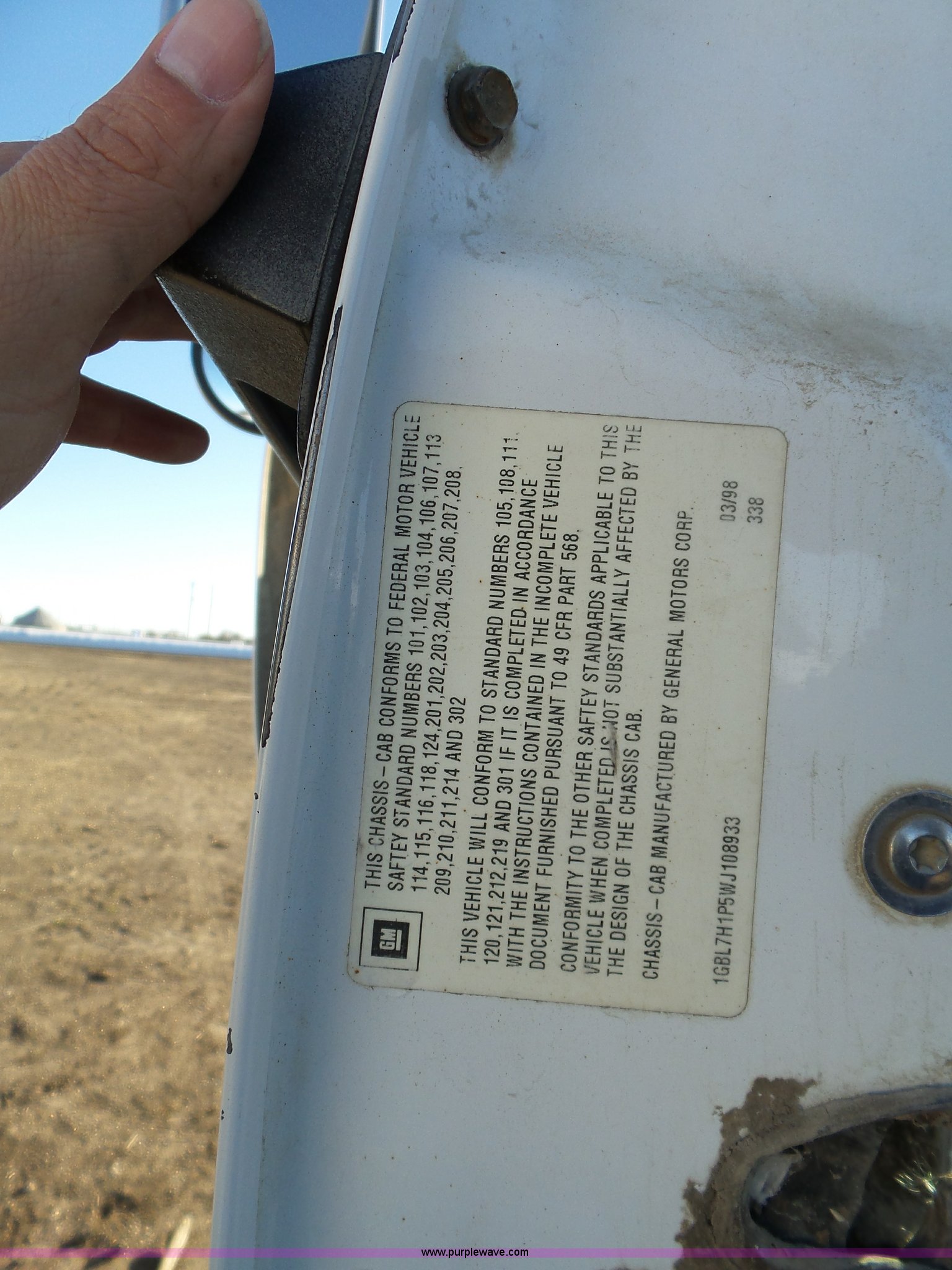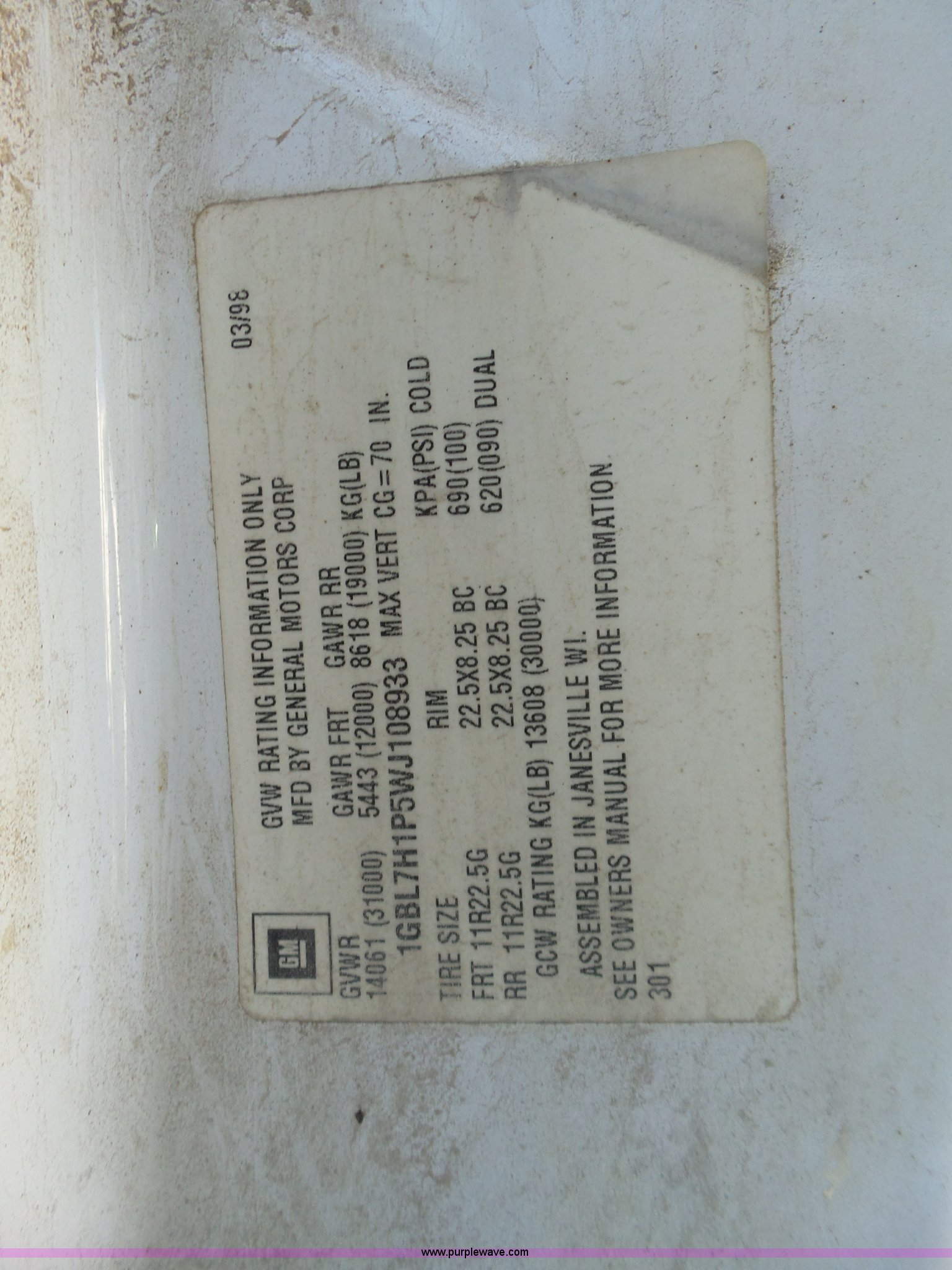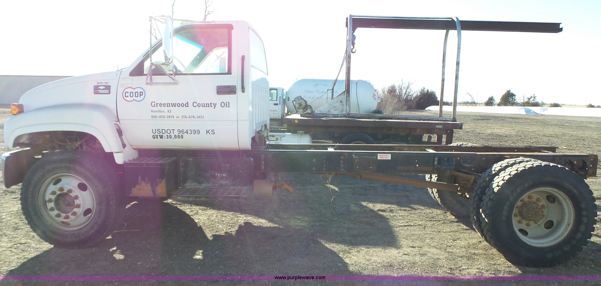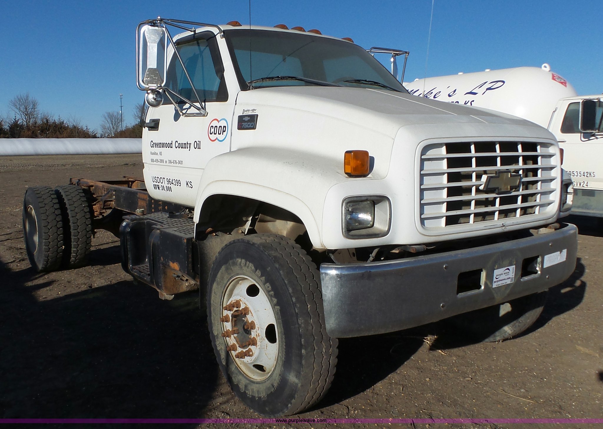 Purple Wave is selling a used Truck Chassis in Kansas. This item is a 1998 Chevrolet C7500 truck cab and chassis with the following: 165,227 miles on odometer, 6.0L V8 gas engine, Five speed manual transmission, Two speed rear end, Heat, AM/FM, Suspension seat, Spring suspension, Hydraulic brakes, 11R22.5 tires, GVWR 31,000 lbs, FAWR 12,000 lbs, RAWR 19,000 lbs