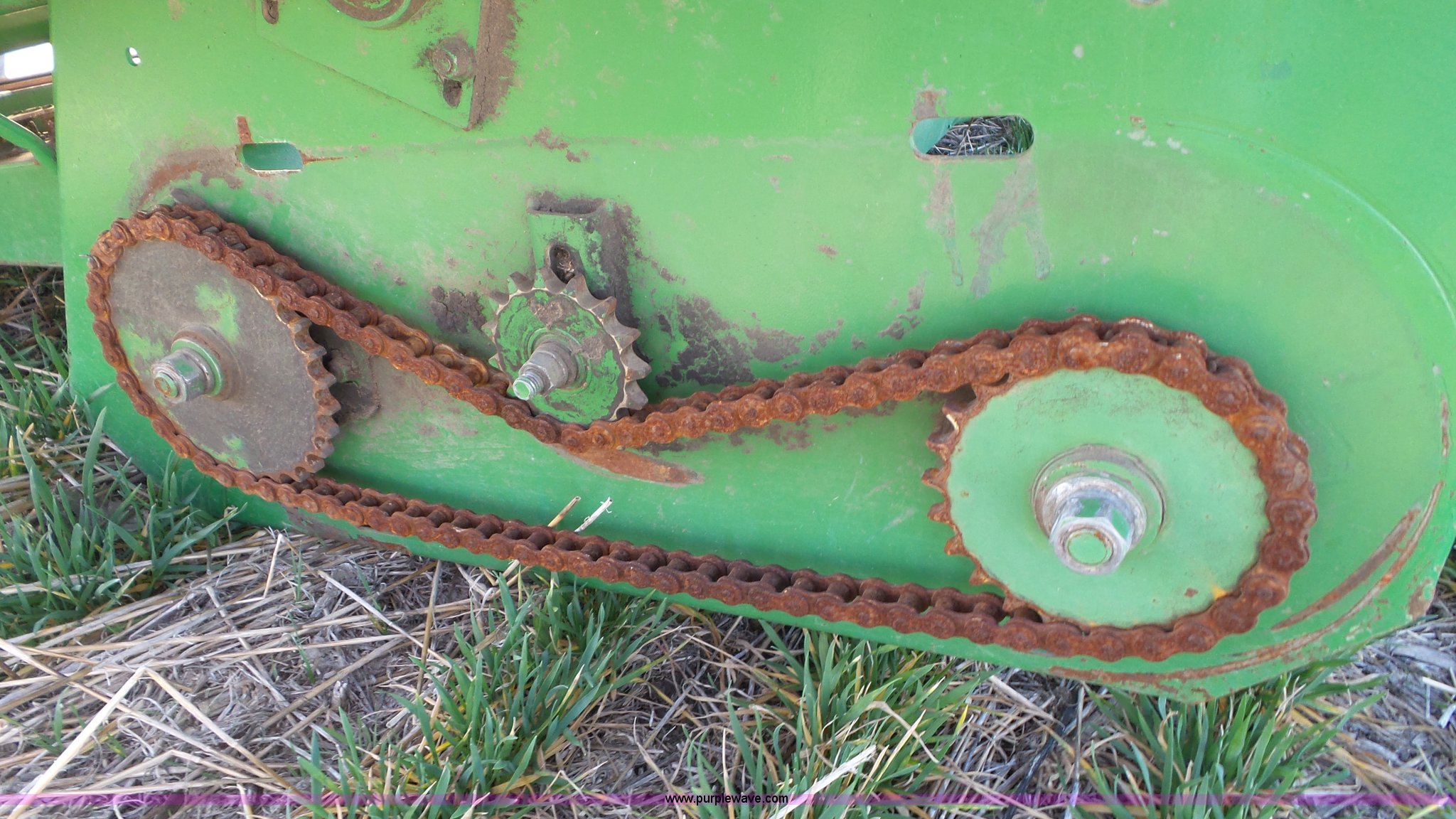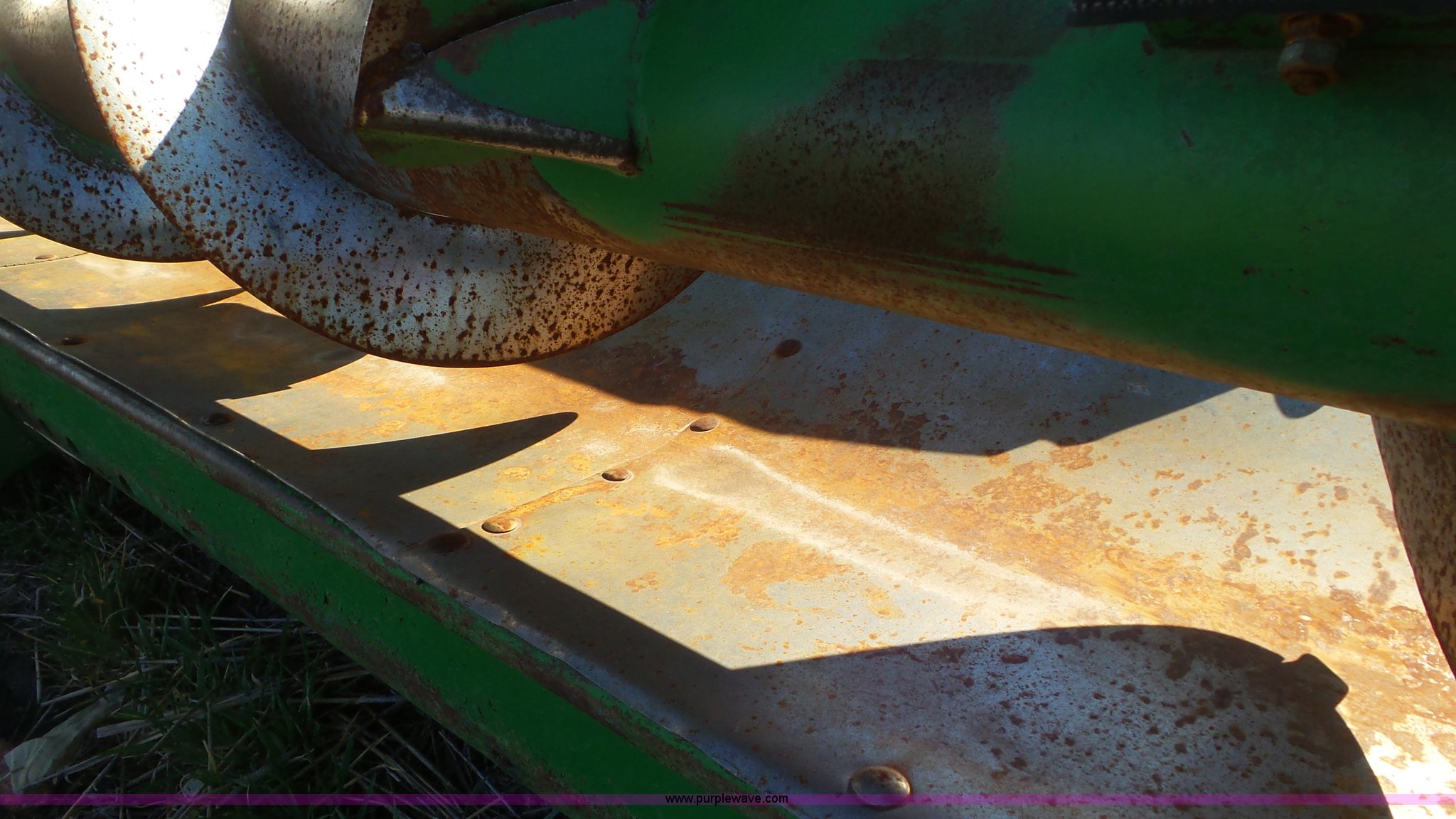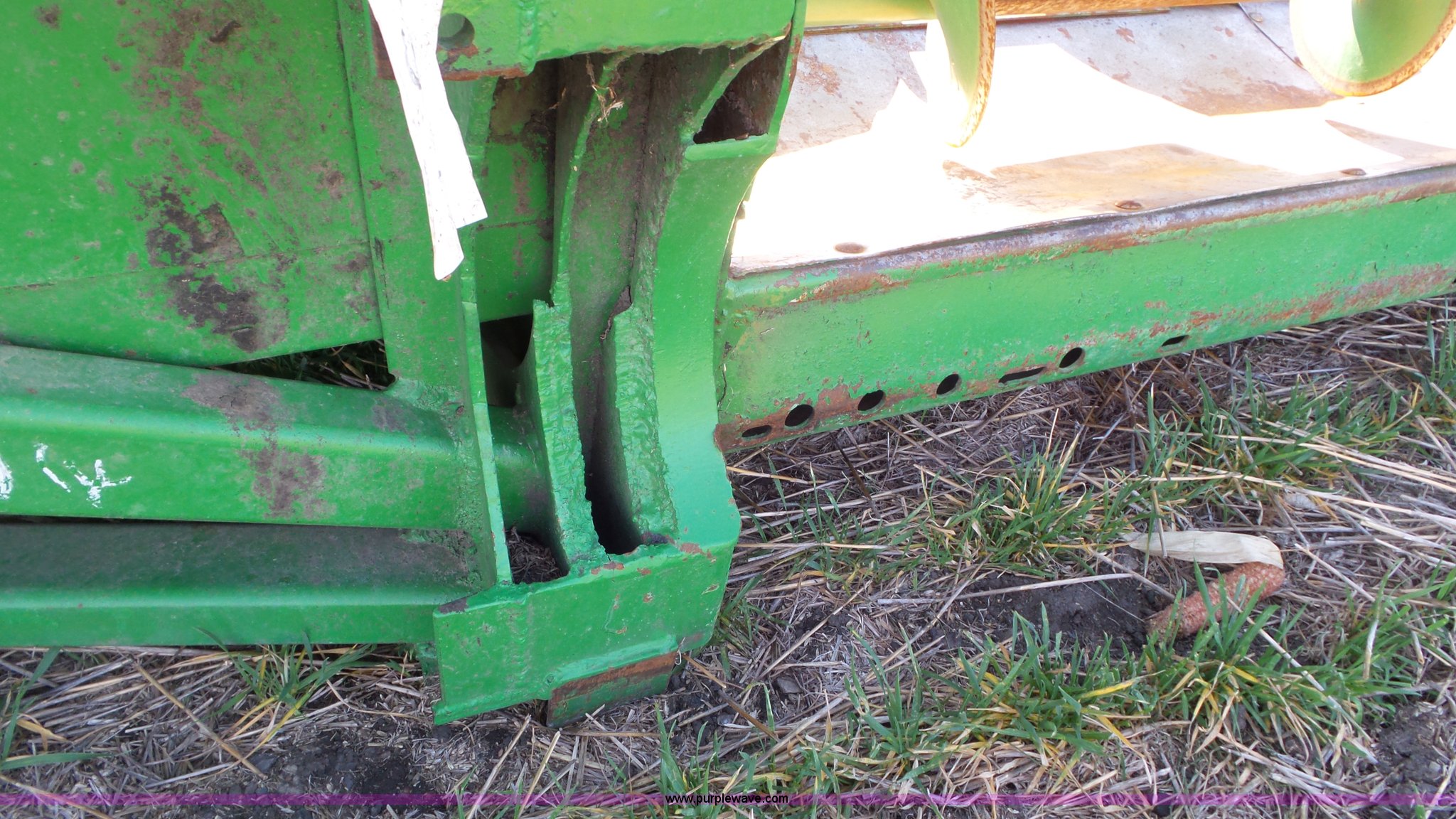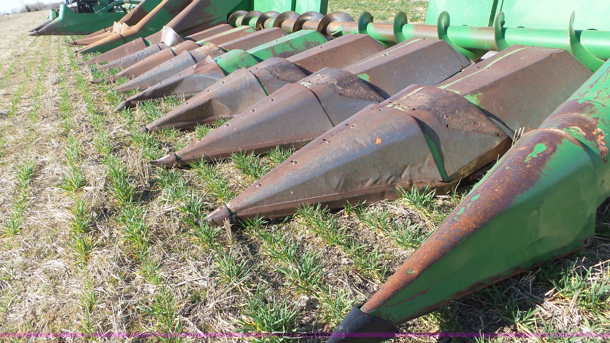 Purple Wave is selling a used Corn or Row Head in Kansas. This item is a John Deere 843 corn head with the following: Eight row, Metal snouts, Dual drivelines