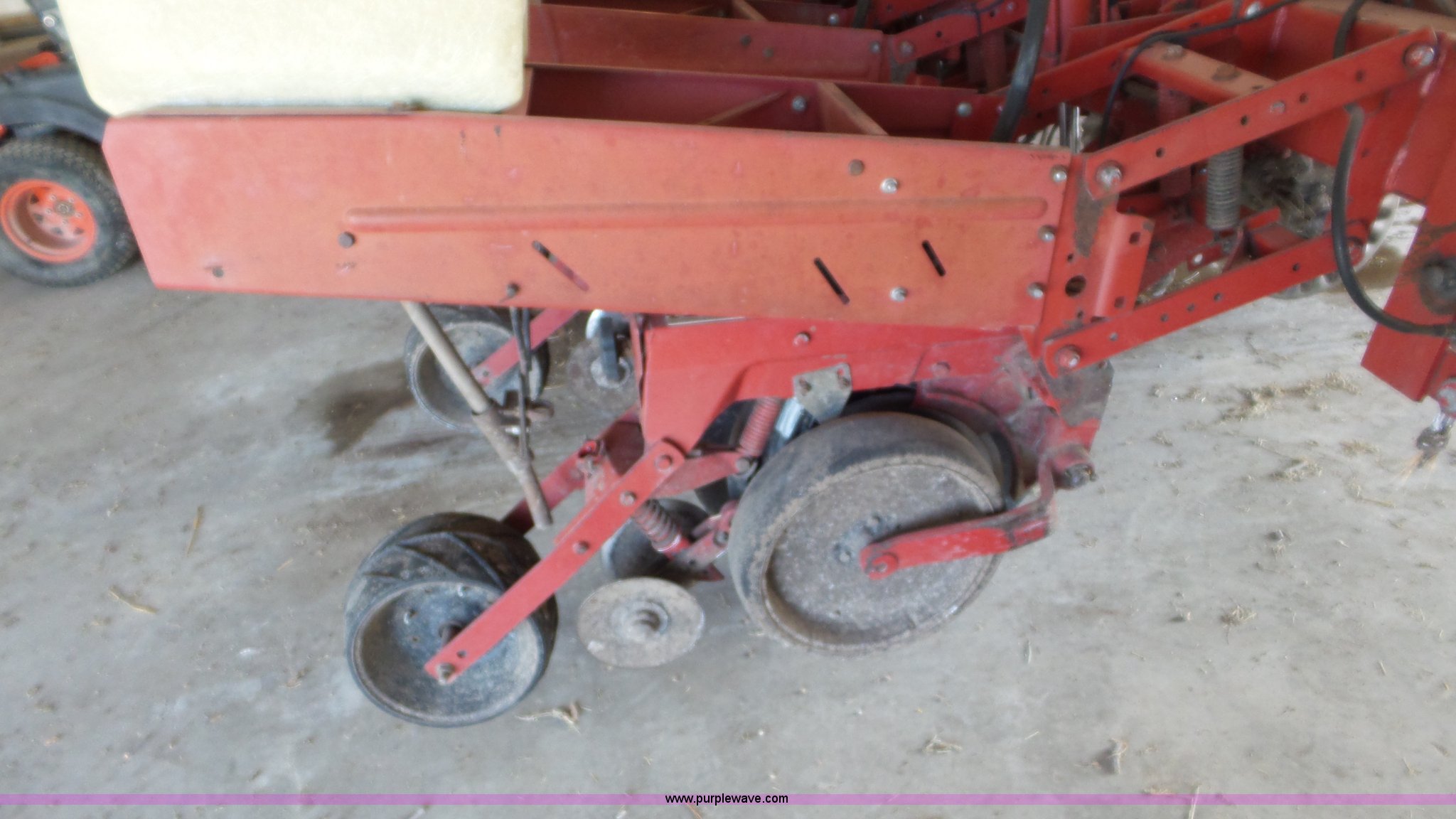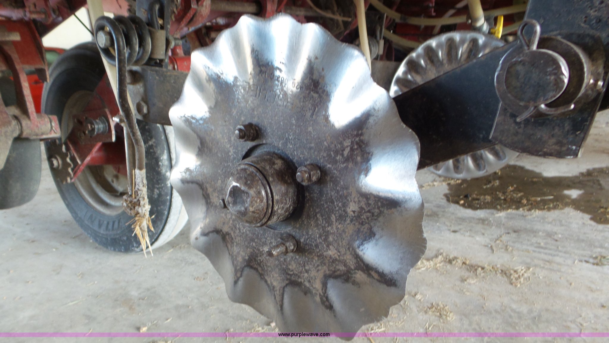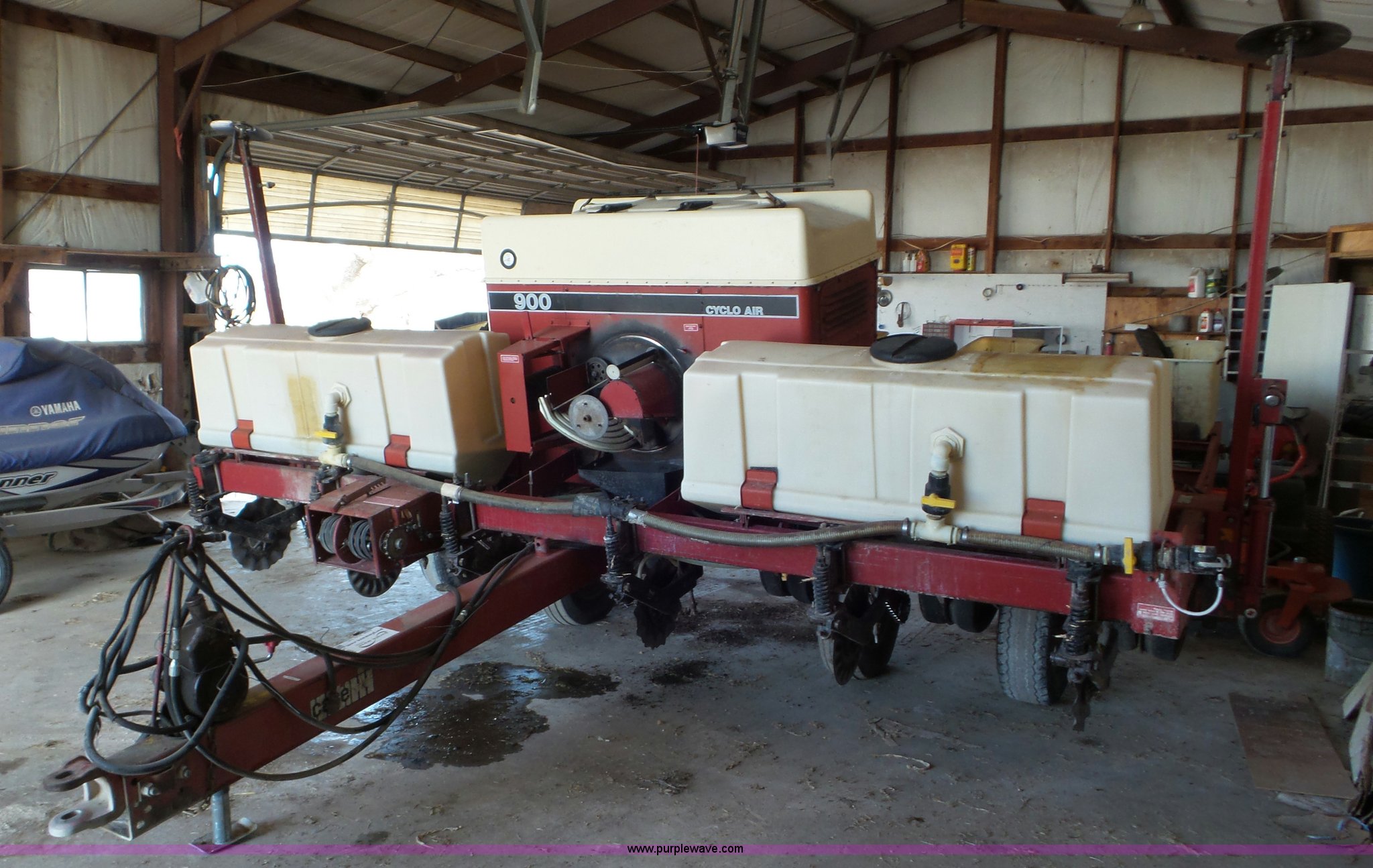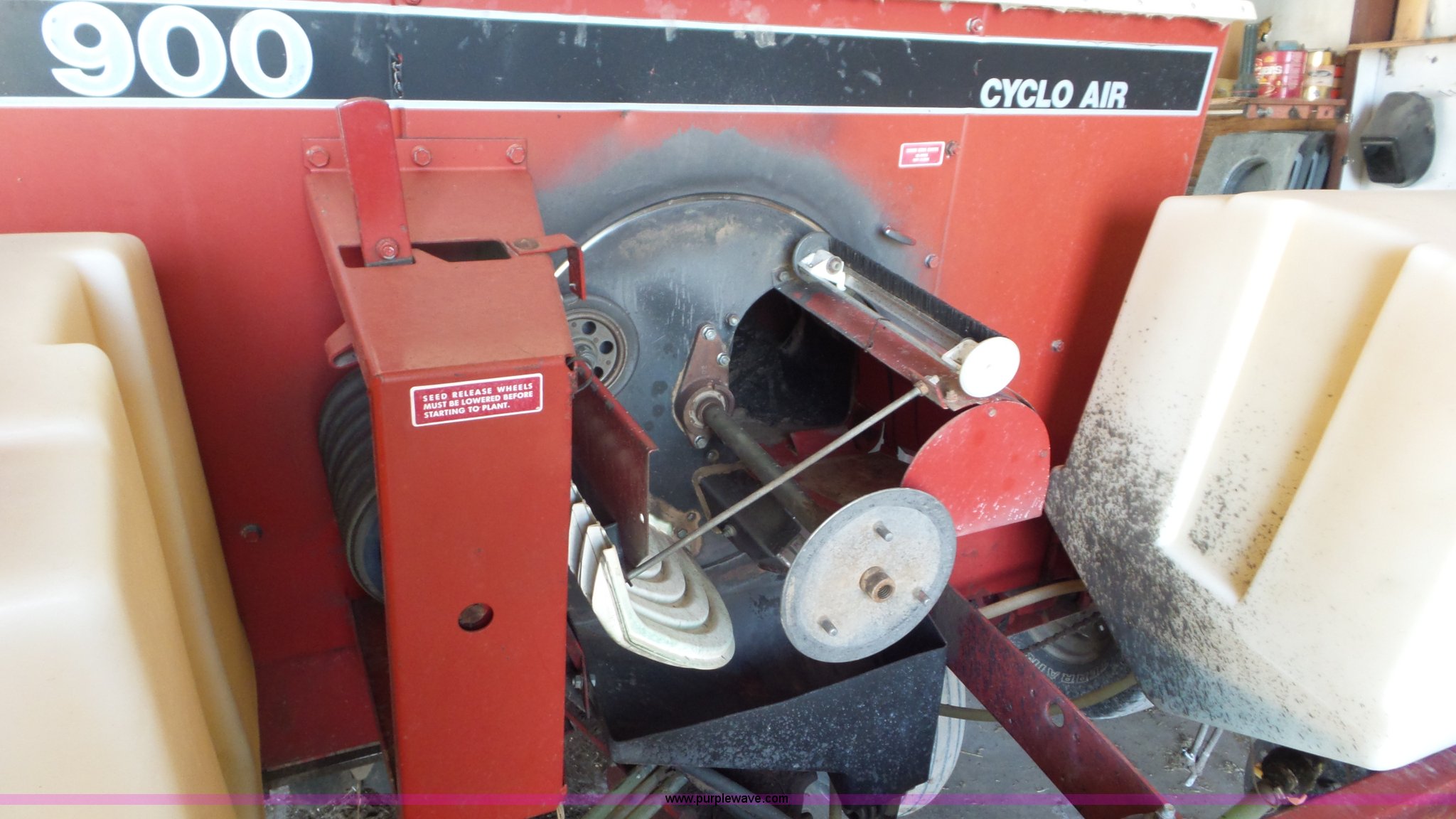 Purple Wave is selling a used Planter in Kansas. This item is a Case IH 900 Cyclo Air planter with the following: 14'W, Six rows, 30" row spacing, Hydraulic fold marker arms, Bulk fill system, Air delivery, Ground meter drive, HD spring down pressure, No-till coulters, Double disk openers, Double gauge wheels, Single rubber closing system, (2) 100 gallon liquid fertilizer tanks, Dry fertilizer individual row hopper, (4) 7.60-15 transport tires, Corn, Milo, and Soybean drums, Serial JJC0023379