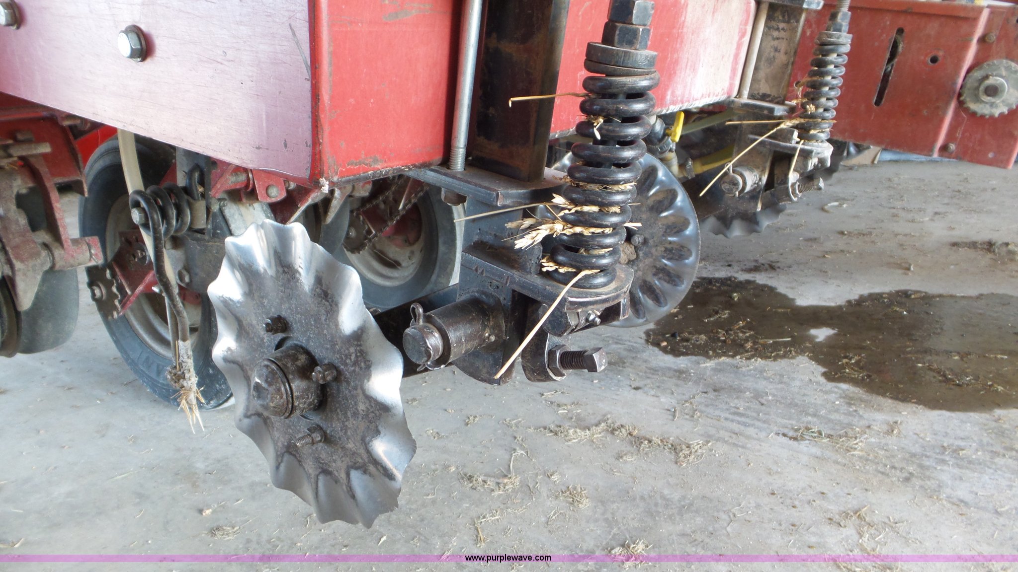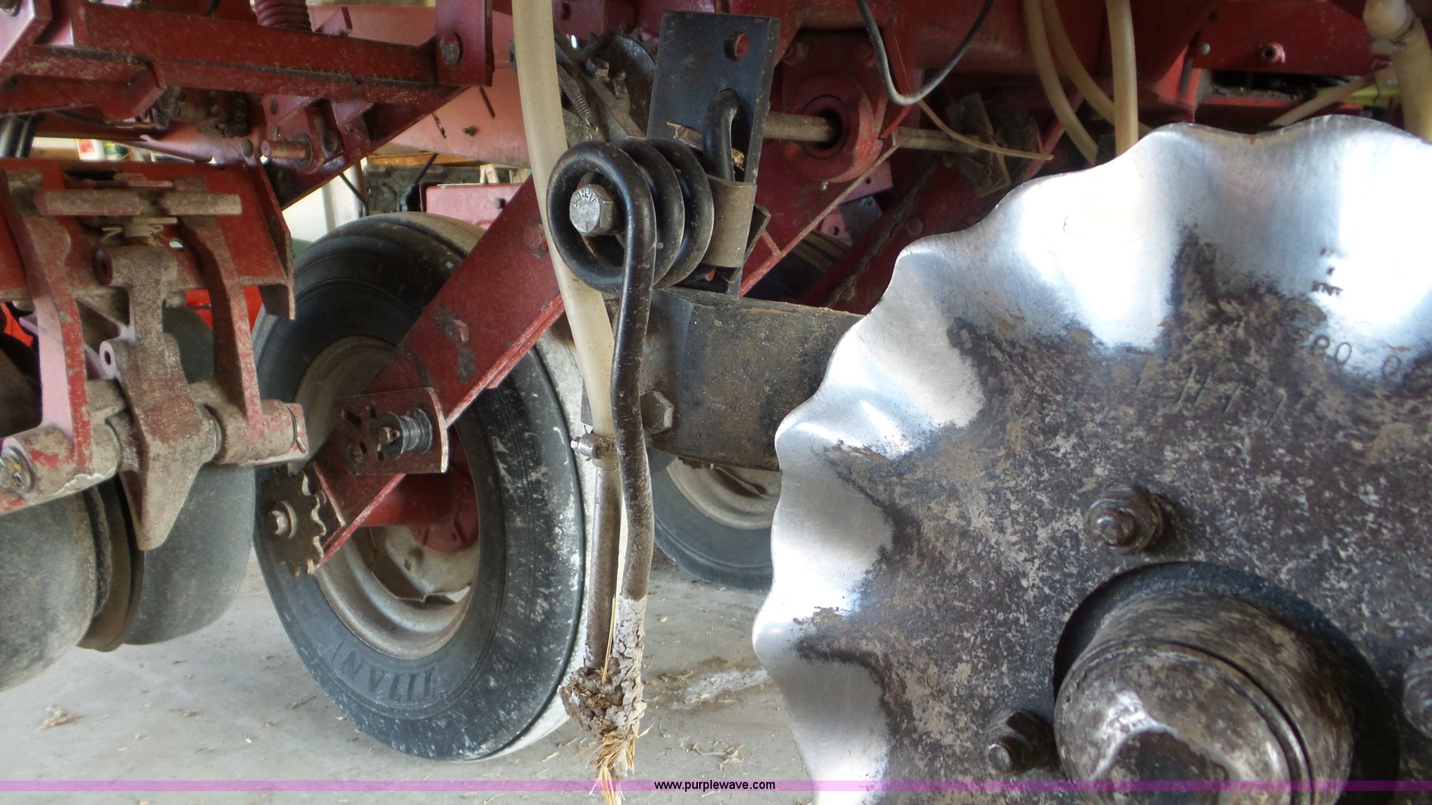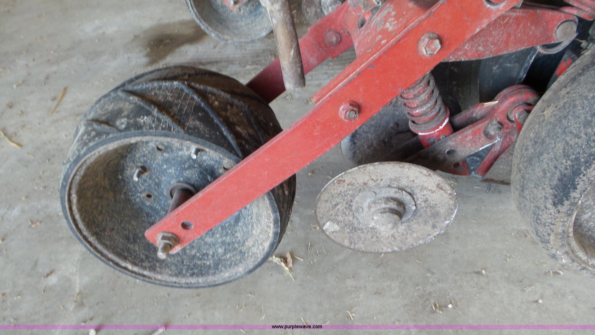 Purple Wave is selling a used Planter in Kansas. This item is a Case IH 900 Cyclo Air planter with the following: 14'W, Six rows, 30" row spacing, Hydraulic fold marker arms, Bulk fill system, Air delivery, Ground meter drive, HD spring down pressure, No-till coulters, Double disk openers, Double gauge wheels, Single rubber closing system, (2) 100 gallon liquid fertilizer tanks, Dry fertilizer individual row hopper, (4) 7.60-15 transport tires, Corn, Milo, and Soybean drums, Serial JJC0023379