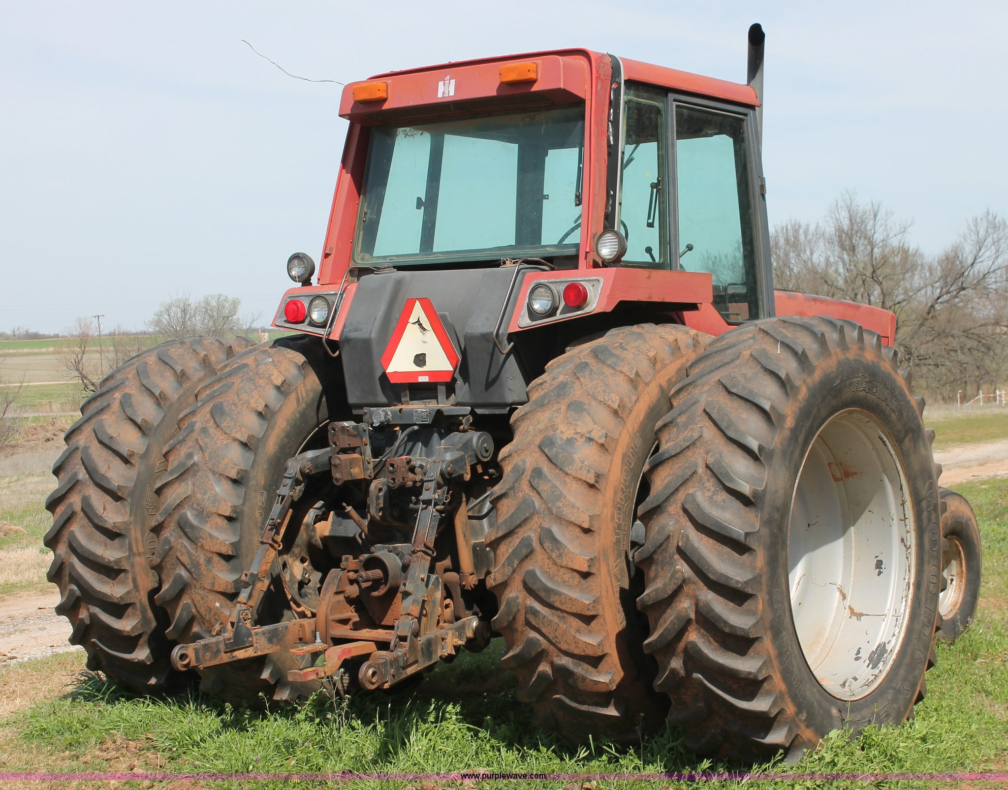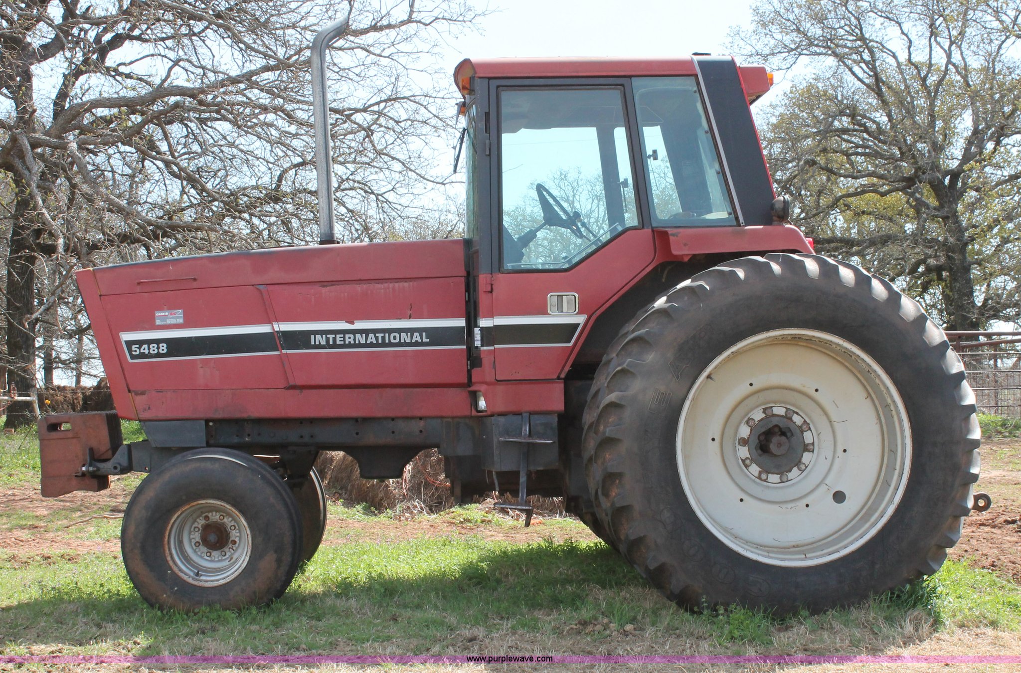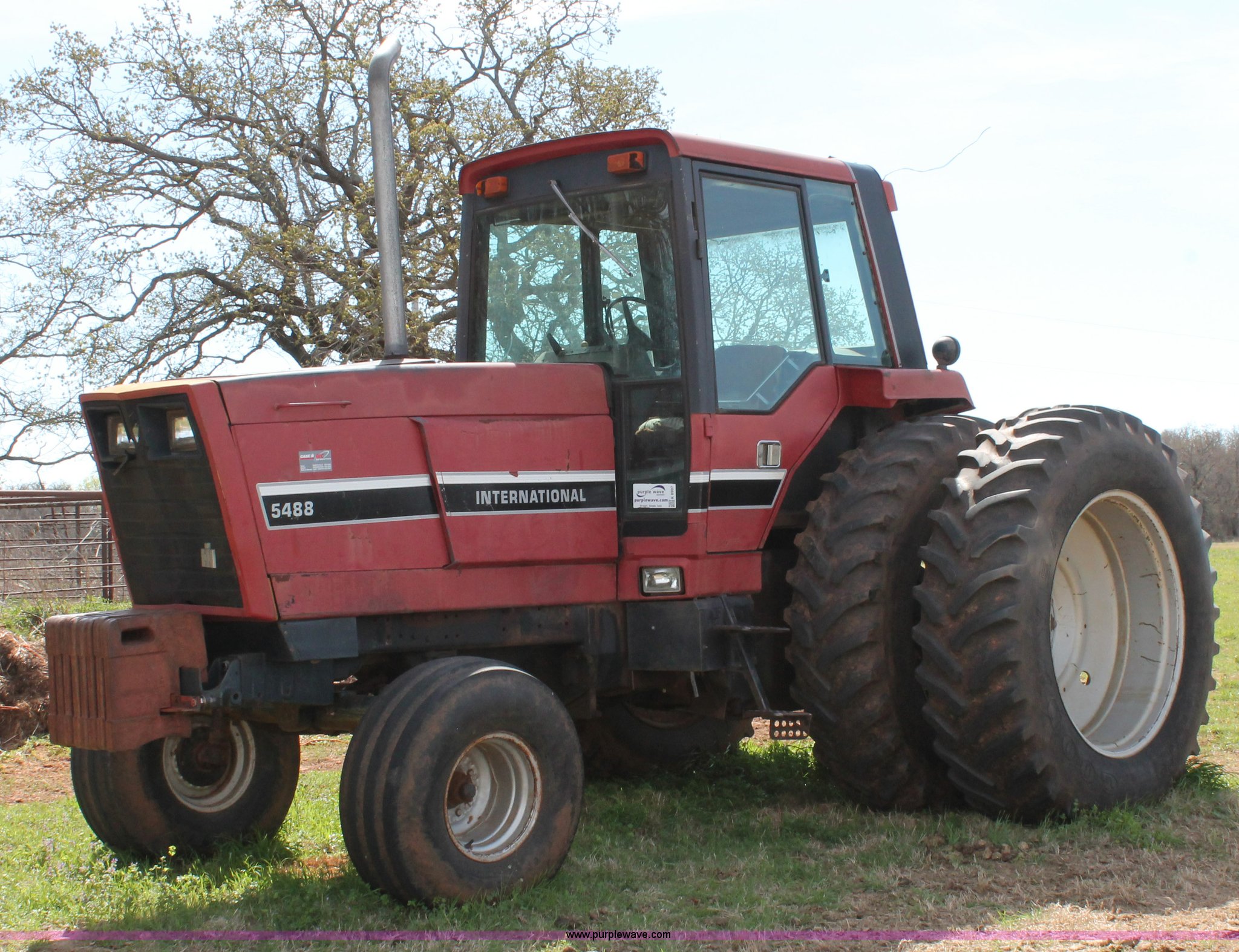 Purple Wave is selling a used Tractor in Oklahoma. This item is a International 5488 tractor with the following: 203 hours on meter, International DTI-466B 7.6L six cylinder turbo diesel engine, 185 HP, Synchro Tri-Six transmission, 18F-6R gears, AC and heat, Tilt steering wheel, AM/FM, Three point, Seven pin outlet, 1000 PTO, Draw bar, (3) rear hydraulic remote sets, (8) suitcase weights, 112" wheelbase, 14L-16.1 front tires, 18.4R42 dual rear tires, Weak master clutch, Recently replaced fuel pump, Serial 20916