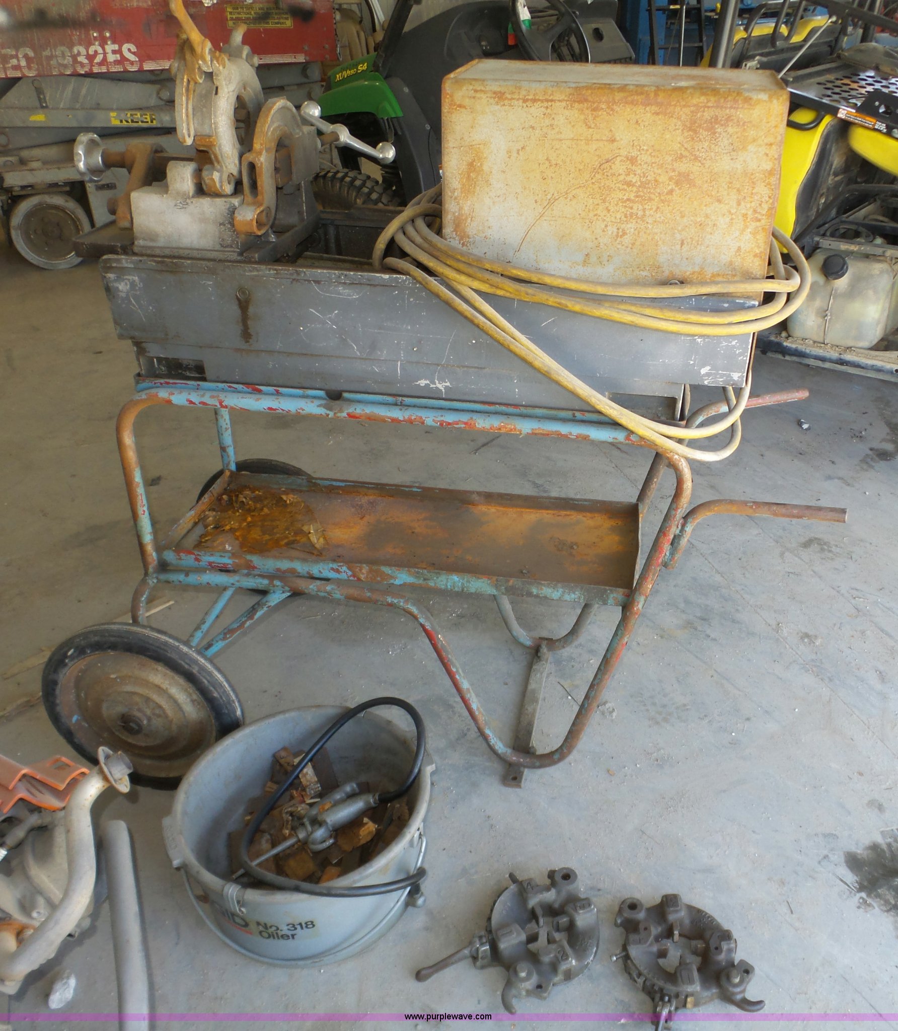 Purple Wave is selling a used Tools in Nebraska. This item is a Oster pipe threader with the following: Approximately 52"L x 28"W x 48"H, 110V, 2" pipe reamer, Pipe cutter, Rigid oiler, (3) adjustable die heads, Replacement dies included, 14" wheels
