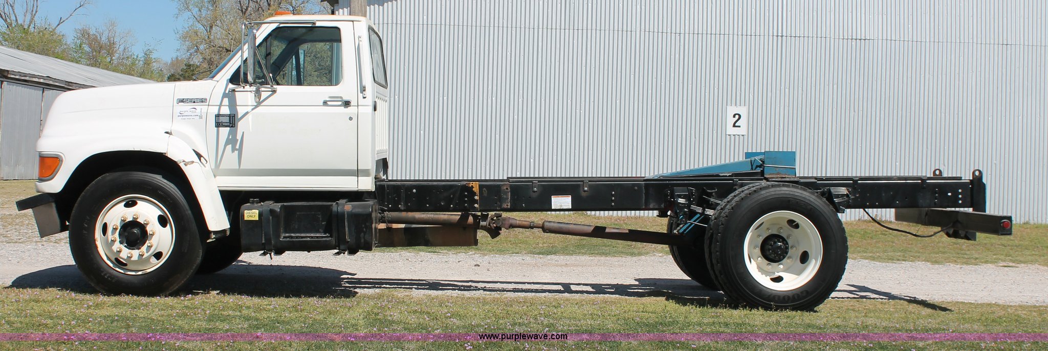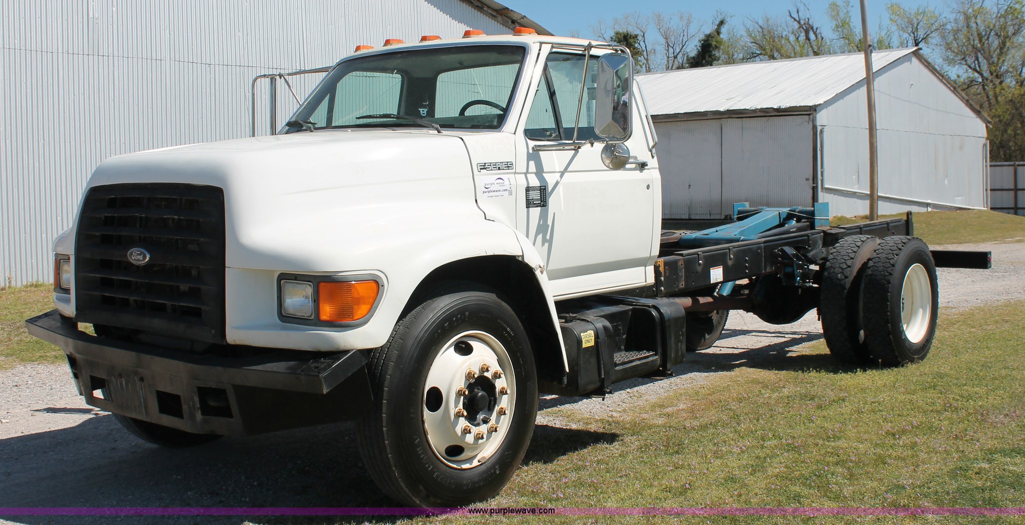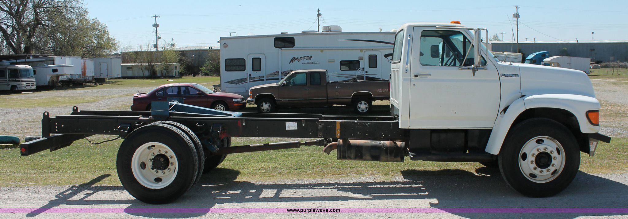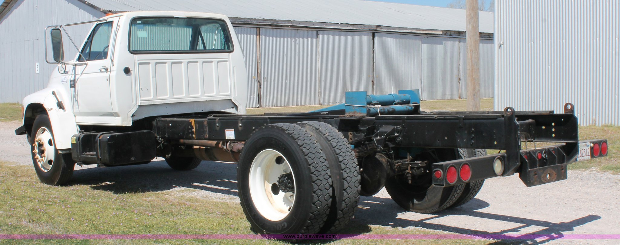 Purple Wave is selling a used Truck Chassis in Oklahoma. This item is a 1998 Ford F800 truck cab and chassis with the following: 152,135 miles on odometer, Cummins B5.9 5.9L L6 diesel engine, 210 HP, Serial 563904D6, Six speed manual transmission, Single axle, AC and heat, Dual PTO, Single pump, Harsh RL-E50 rigid-lift hydraulic hoist, Dual ram cylinders, Electric over hydraulic brakes, 225" wheelbase, 10R22.5 tires, GVWR 28,000 lbs