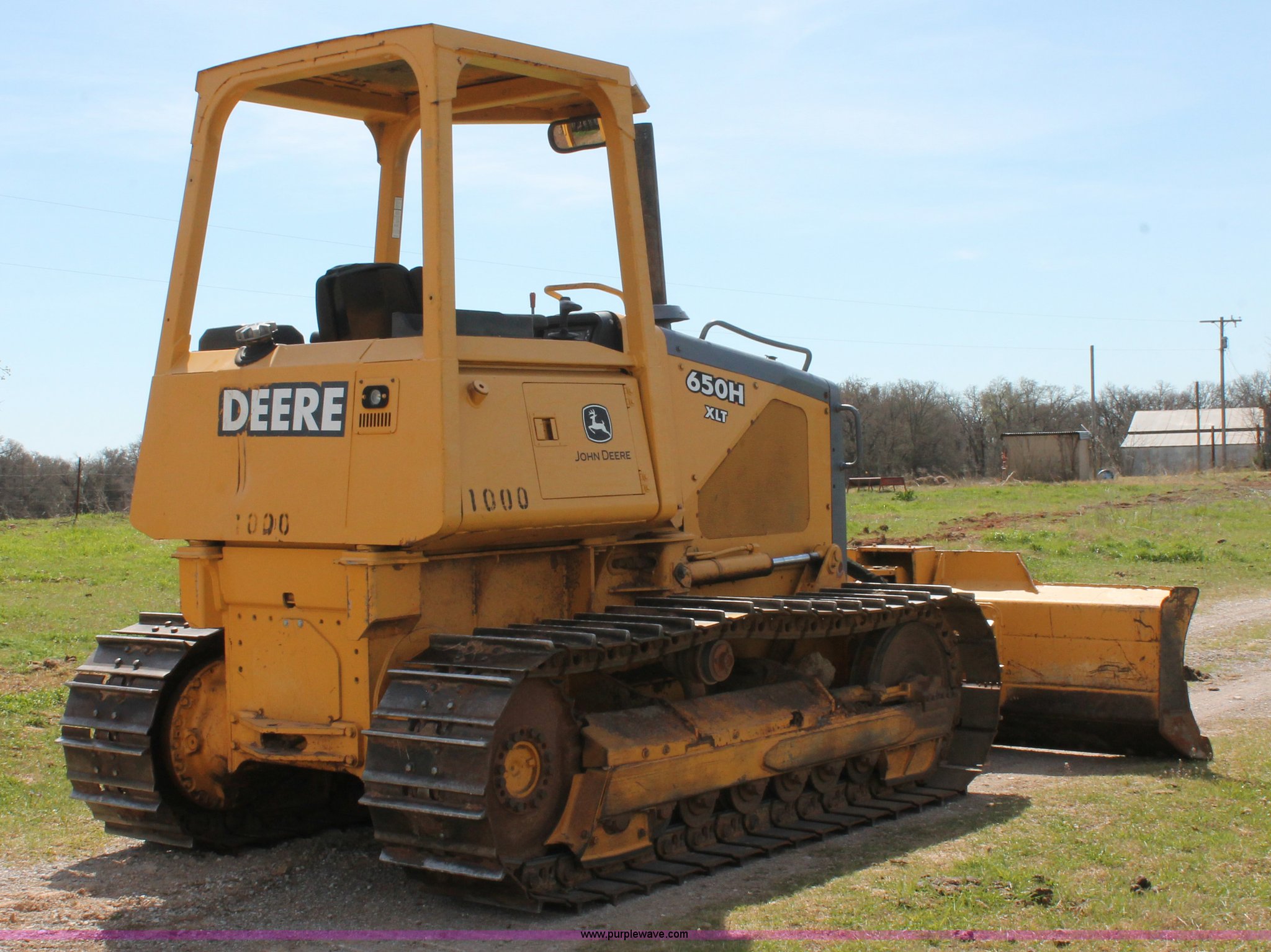 Purple Wave is selling a used Crawler Dozer in Oklahoma. This item is a 2004 John Deere 650H XLT dozer with the following: 6,424 hours on meter, John Deere 4045T 4.5L four cylinder turbo diesel engine, 90 HP, Hydrostatic transmission, Canopy, Suspension seat, Front work lights, 120" six-way dozer blade, Seven bottom rollers, 20"W tracks, 18,600 lbs. base operating weight