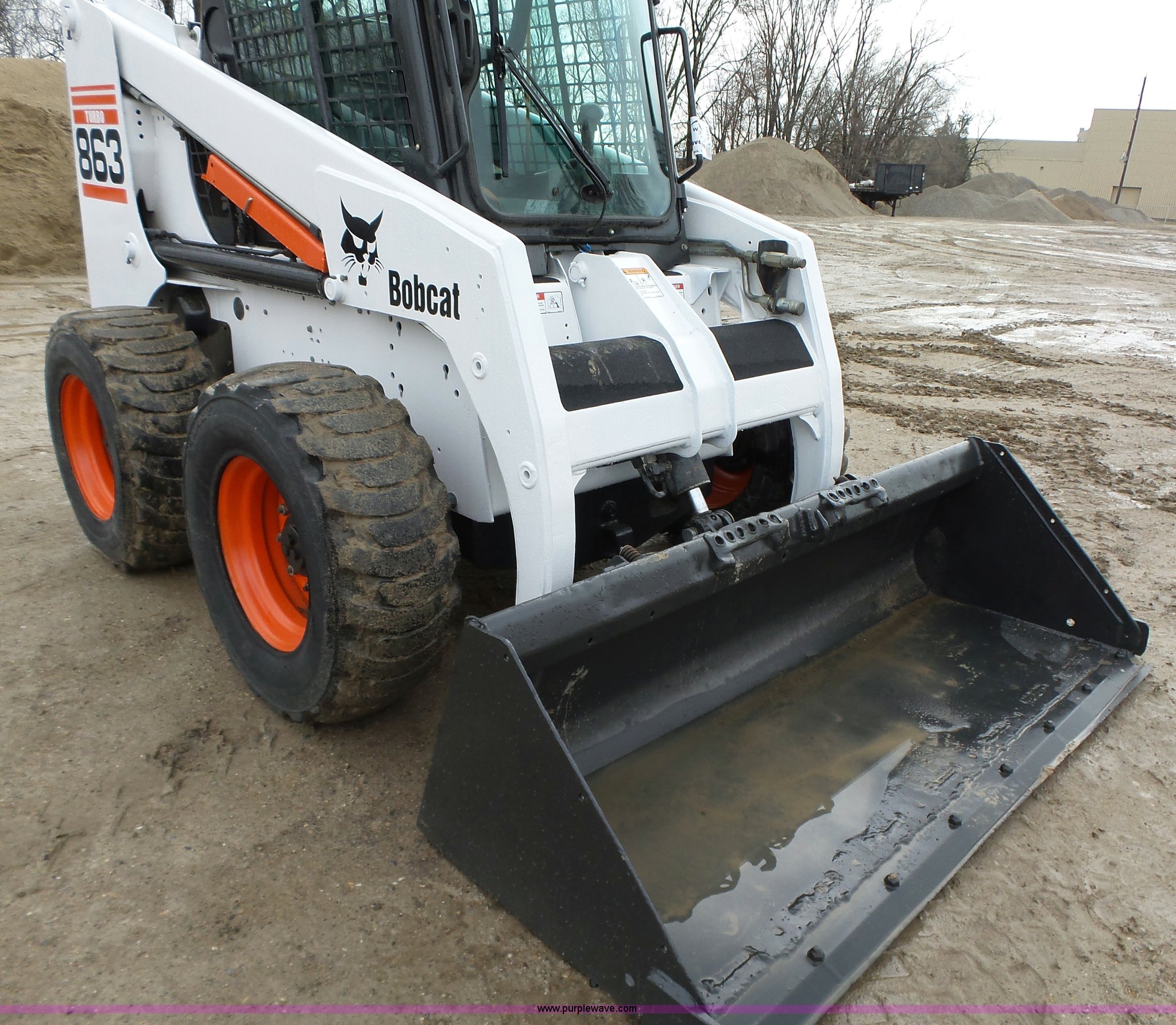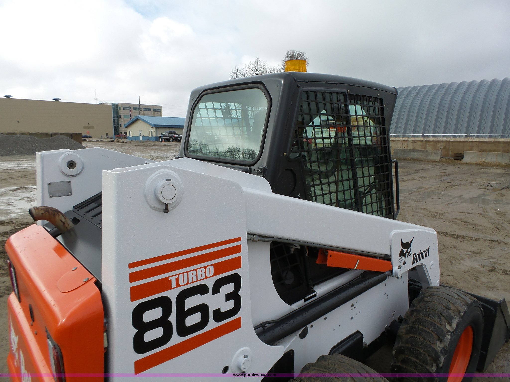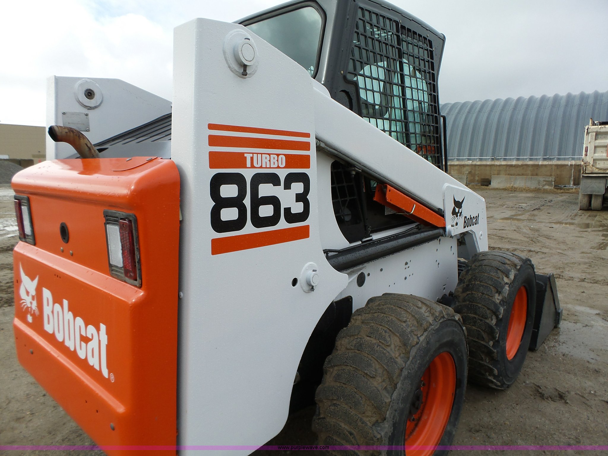 Purple Wave is selling a used Skid Steer Loader in Iowa. This item is a 2001 Bobcat 863 Turbo skid steer with the following: 4,664 hours on meter, Four cylinder turbo diesel engine, Hydrostatic transmission, Enclosed cab, Joystick controls, Spring suspension seat, Wipers, Backup alarm, 73"W bucket, Bolt-on cutting edge, Manual quick coupler, Auxiliary hydraulics, Beacon light, Front work lights, 12 x 16.5 NHS tires, Additional Loeger 15"W tracks, Unattached, 7,045 lbs. base operating weight, Serial 514448327