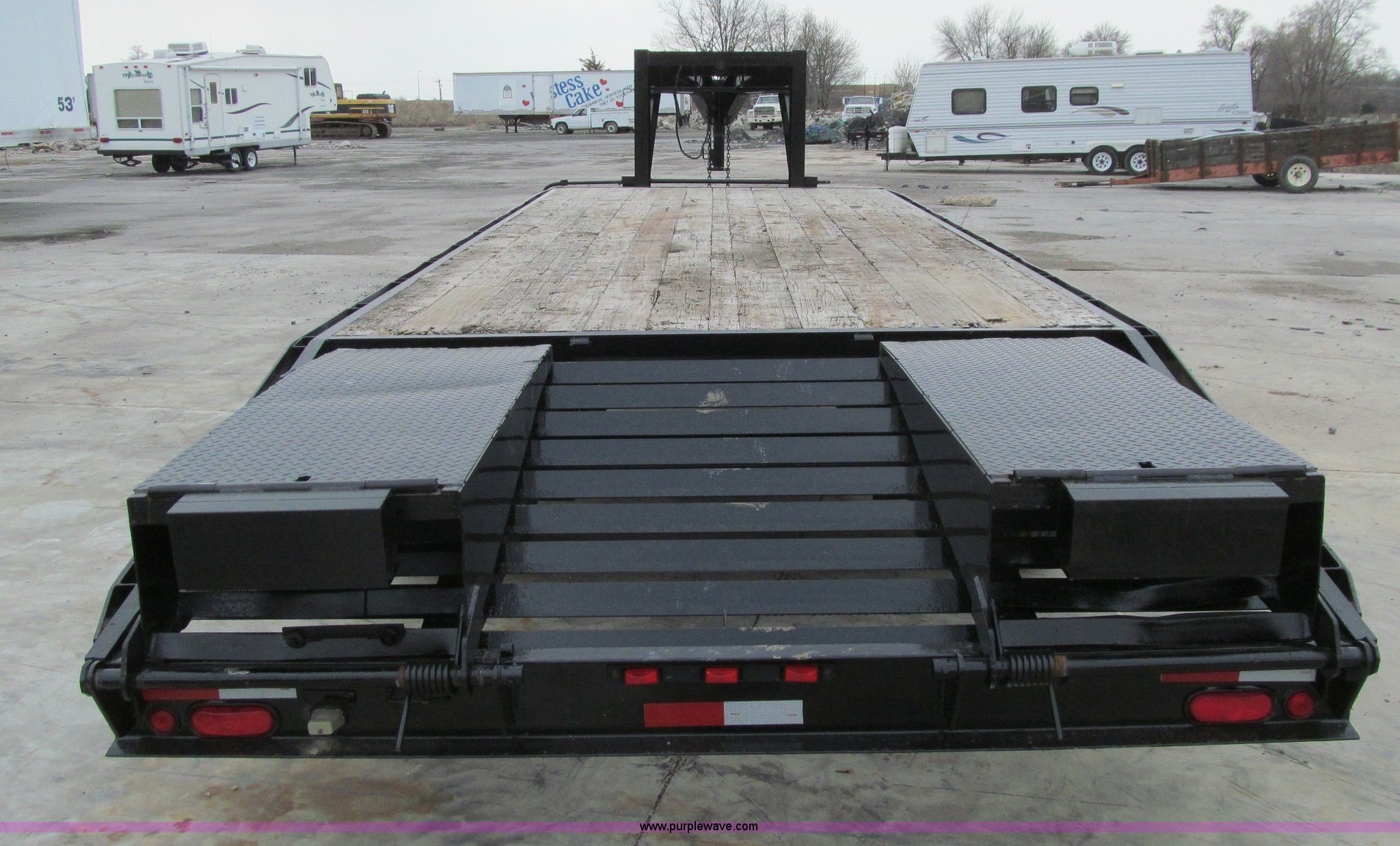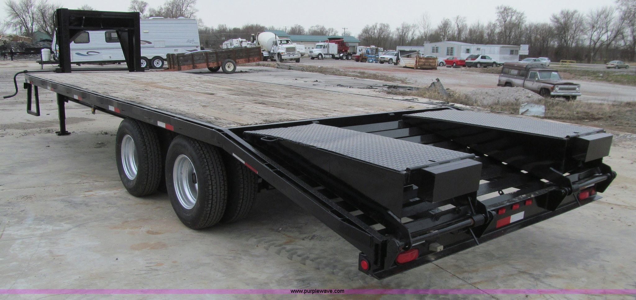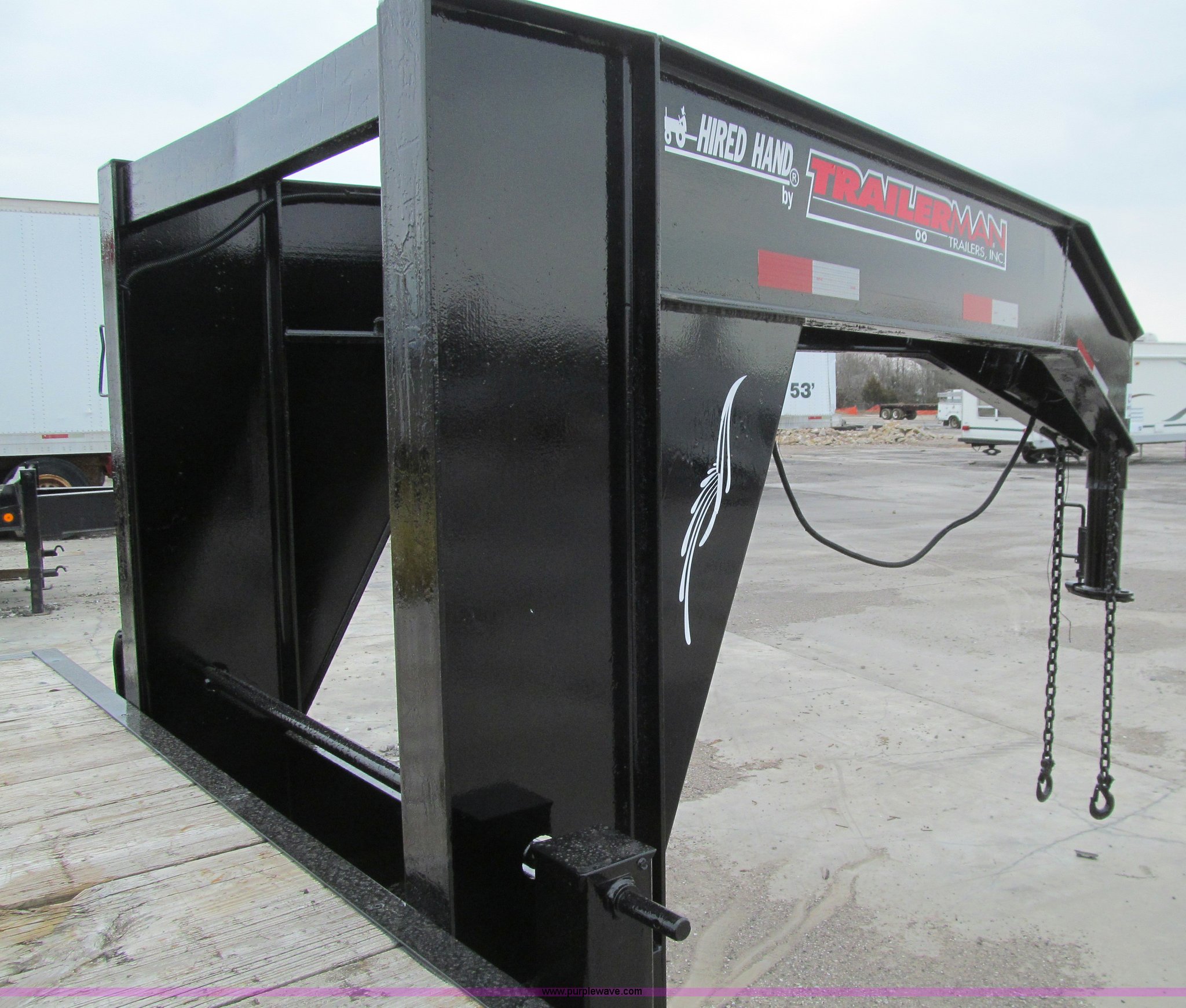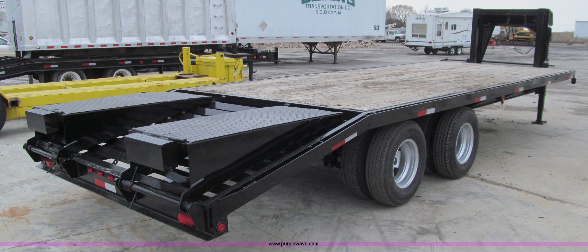 Purple Wave is selling a used Equip. Trailer in Iowa. This item is a 2005 Trailerman equipment trailer with the following: 34.5'L overall, 39.5" floor height, 20'L deck, 5'L beavertail, Wood deck, Stake pockets, 5'L ramps, Gooseneck hitch, Dual leg landing gear, Spring suspension, Electric brakes, Tandem axle, Steel wheels, Recently replaced Double King ST235/80R16 tires, 10 ton capacity, GVWR 20,000 lbs, GAWR 10,000 lbs