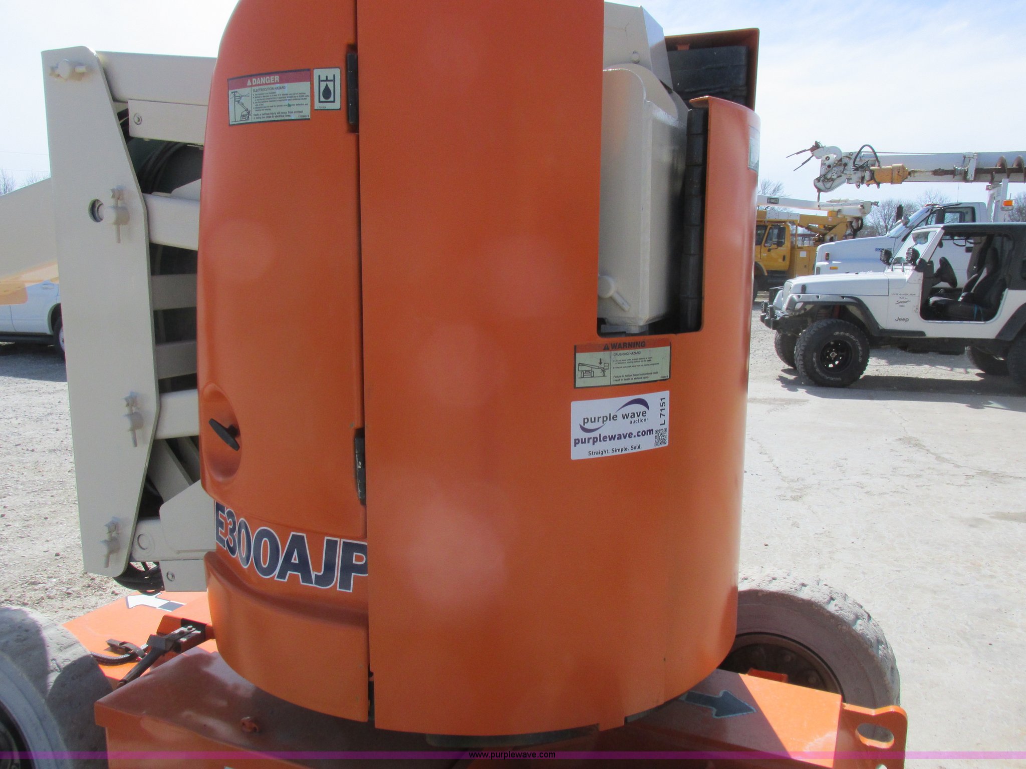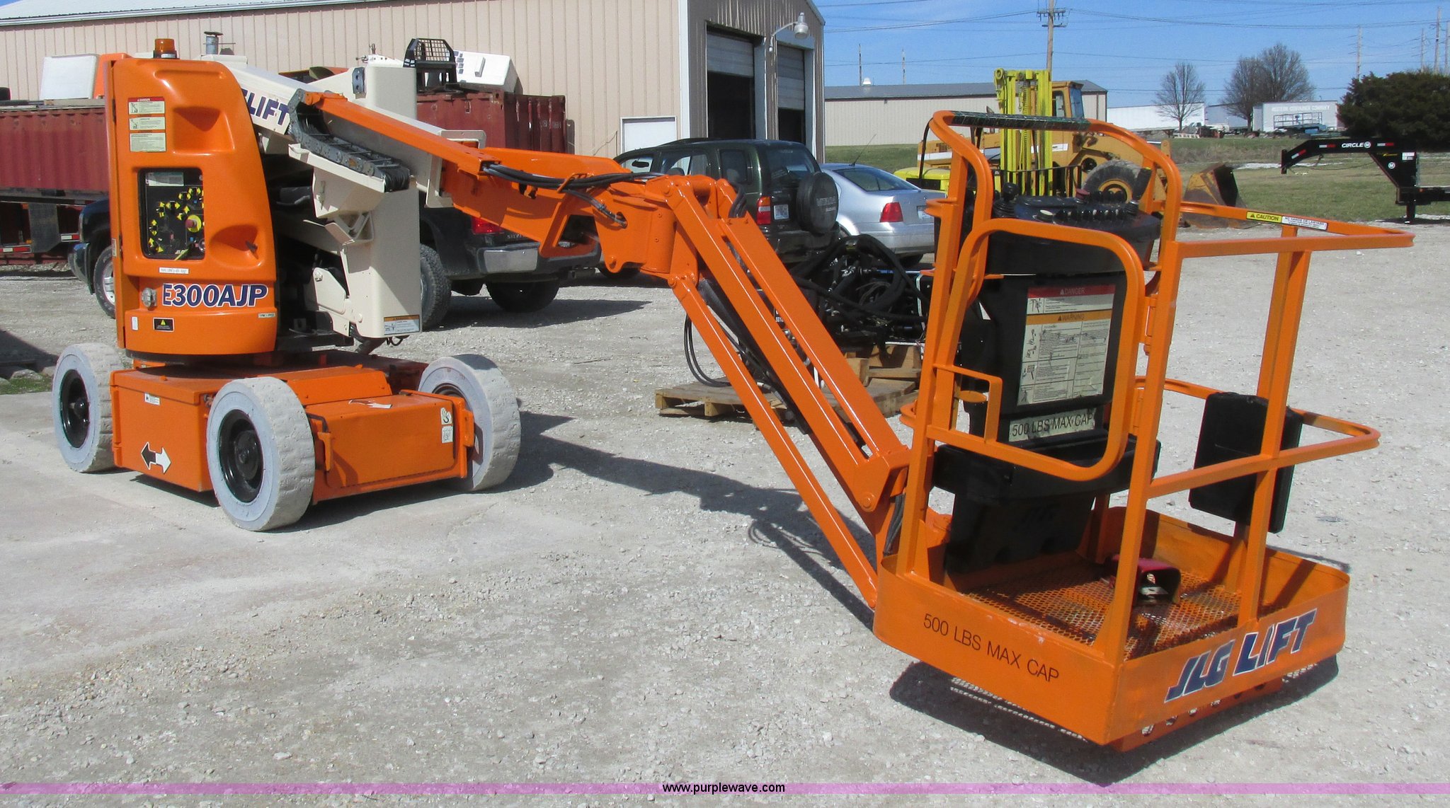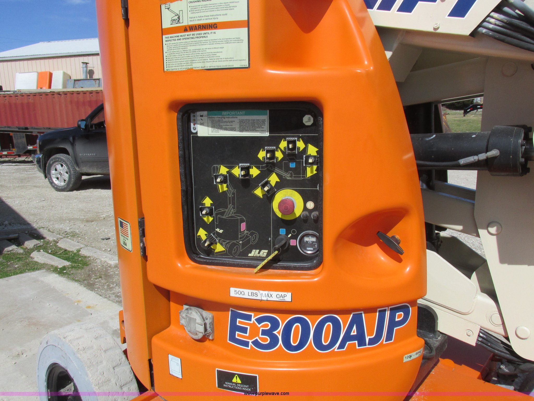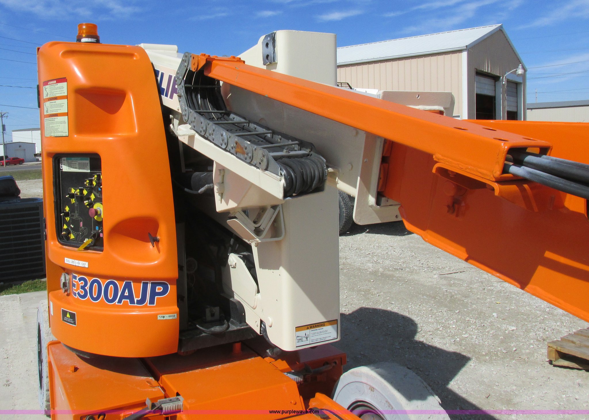 Purple Wave is selling a used Boom Lift in Missouri. This item is a 2006 JLG E300AJP boom lift with the following: 1,092 hours on meter, Electric operation, Hydrostatic transmission, 500 lbs maximum lift capacity, 30' maximum lift height, Articulating boom, 30"L x 48"W platform, AC power outlet, Platform and ground controls, Safety alarm, 25 x 7-12 solid tires, Serial 0300092605