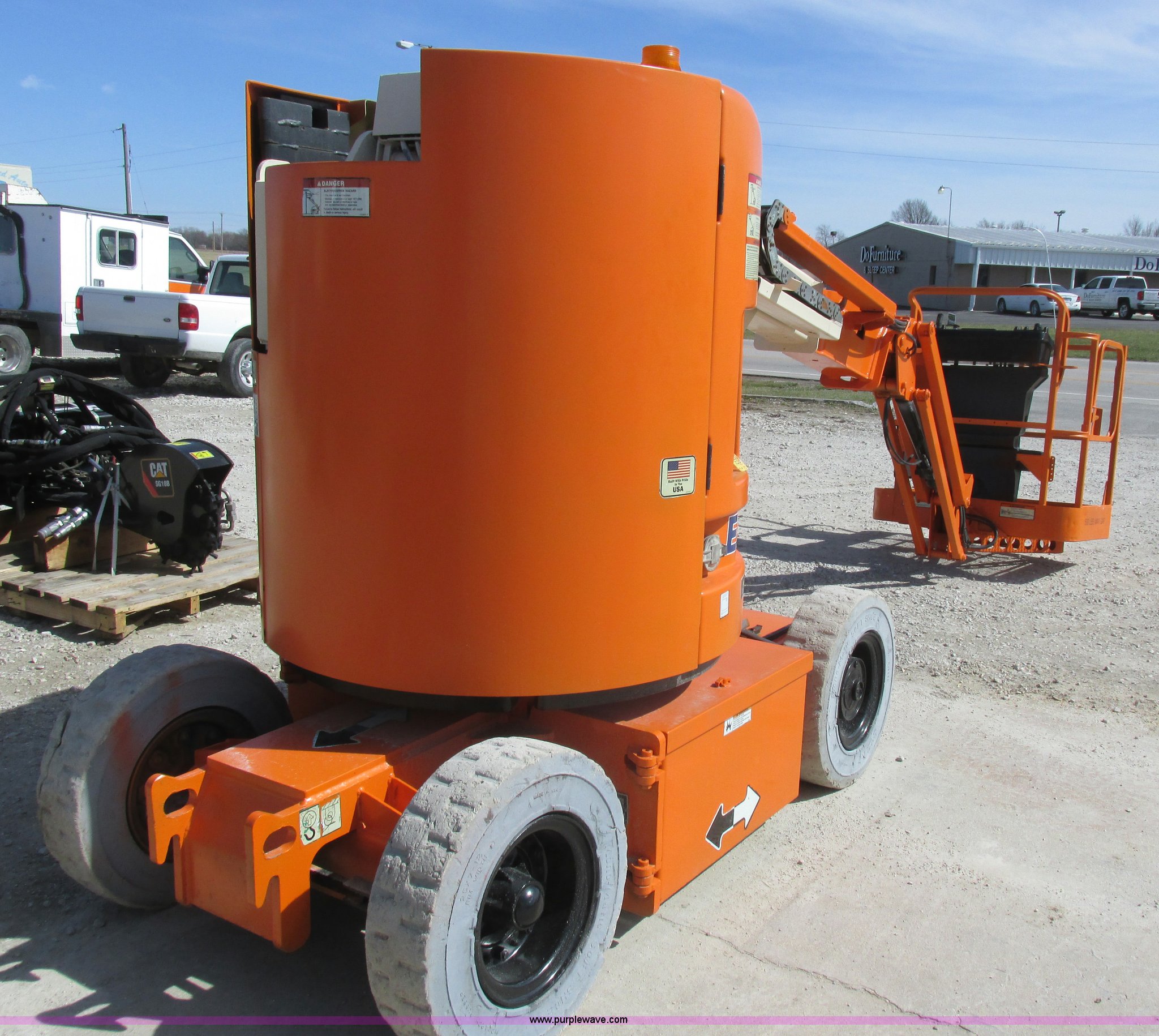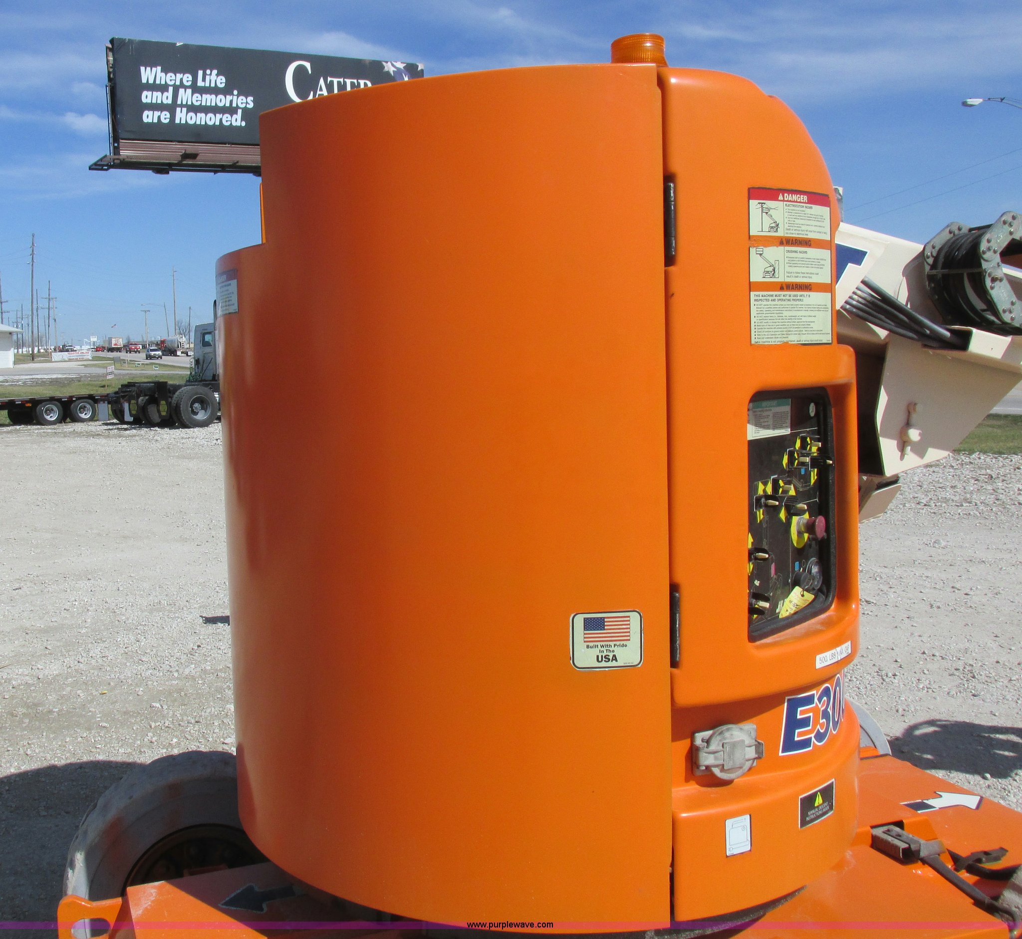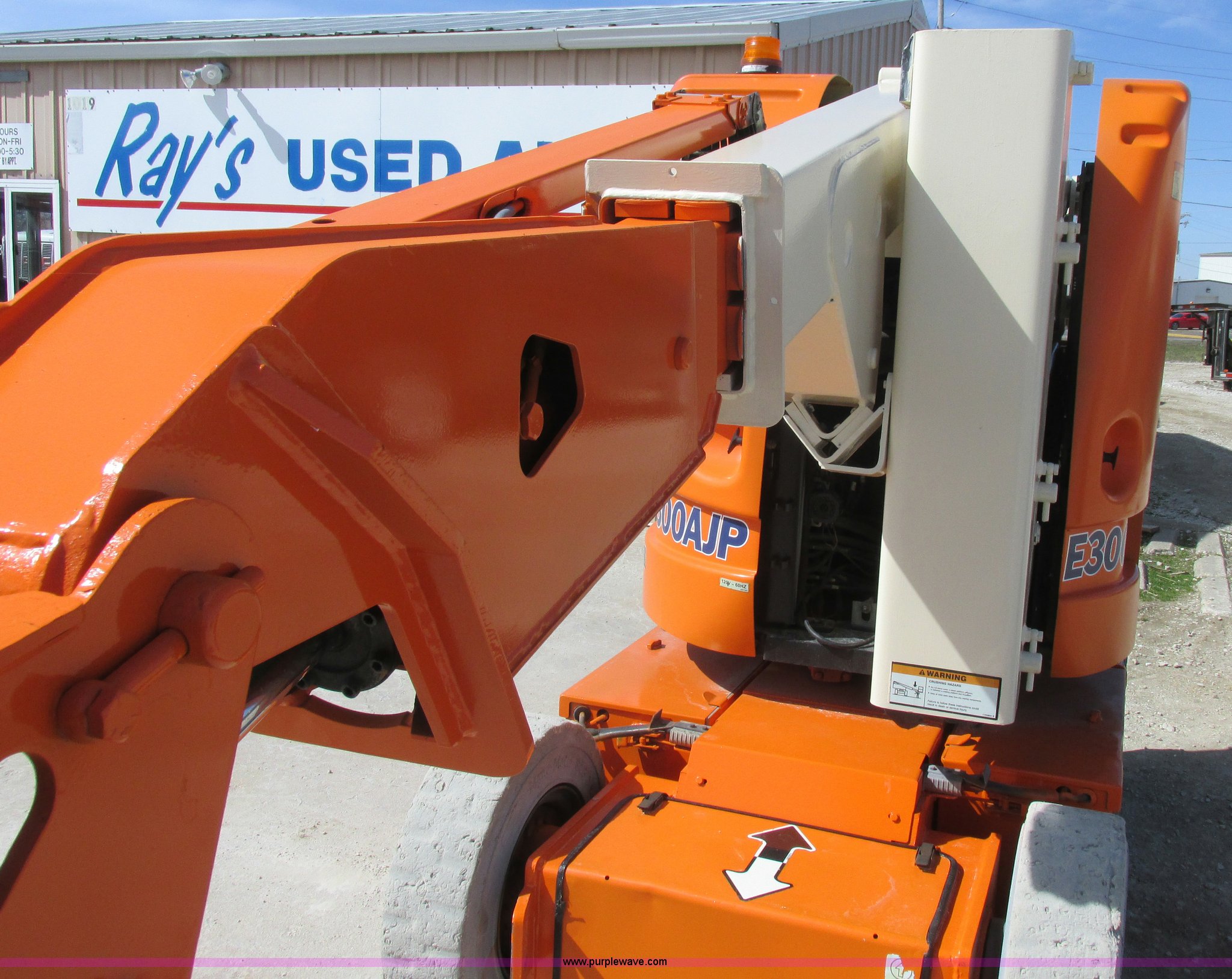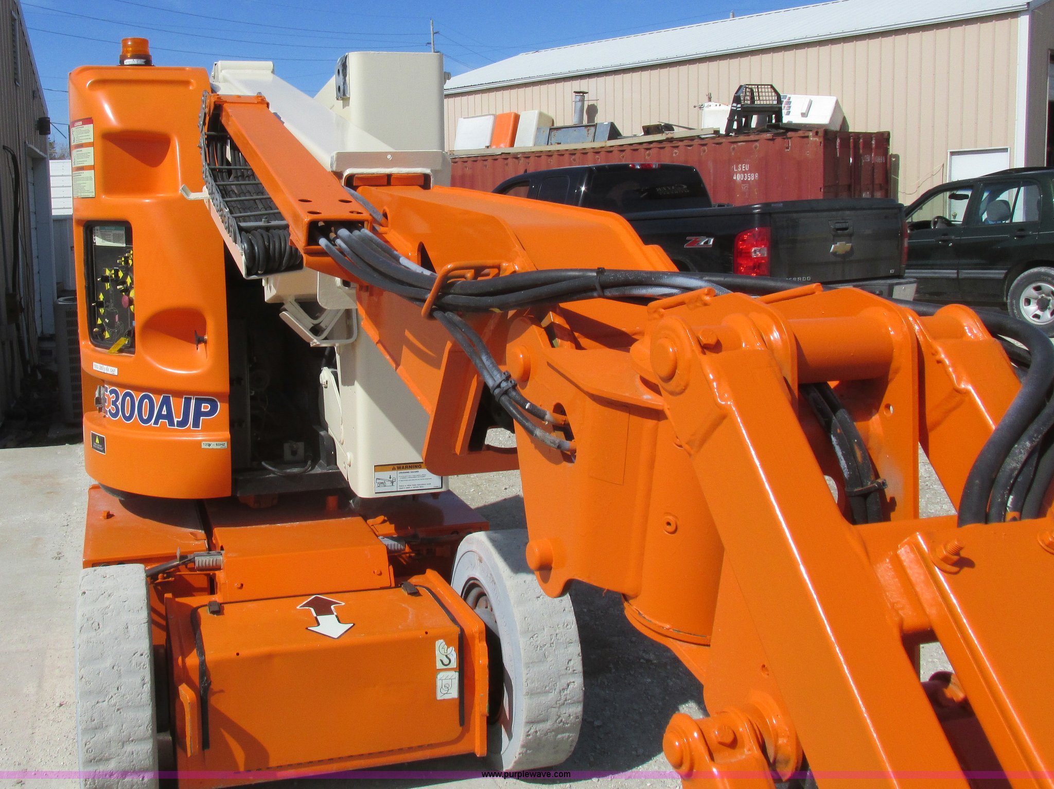 Purple Wave is selling a used Boom Lift in Missouri. This item is a 2006 JLG E300AJP boom lift with the following: 1,092 hours on meter, Electric operation, Hydrostatic transmission, 500 lbs maximum lift capacity, 30' maximum lift height, Articulating boom, 30"L x 48"W platform, AC power outlet, Platform and ground controls, Safety alarm, 25 x 7-12 solid tires, Serial 0300092605