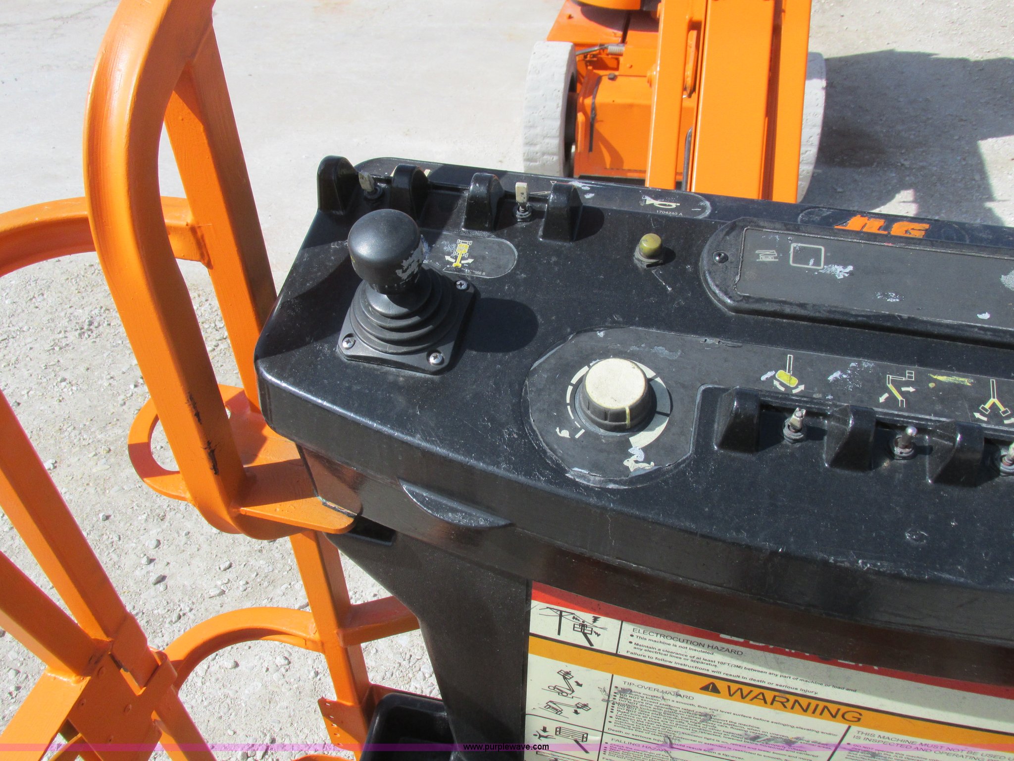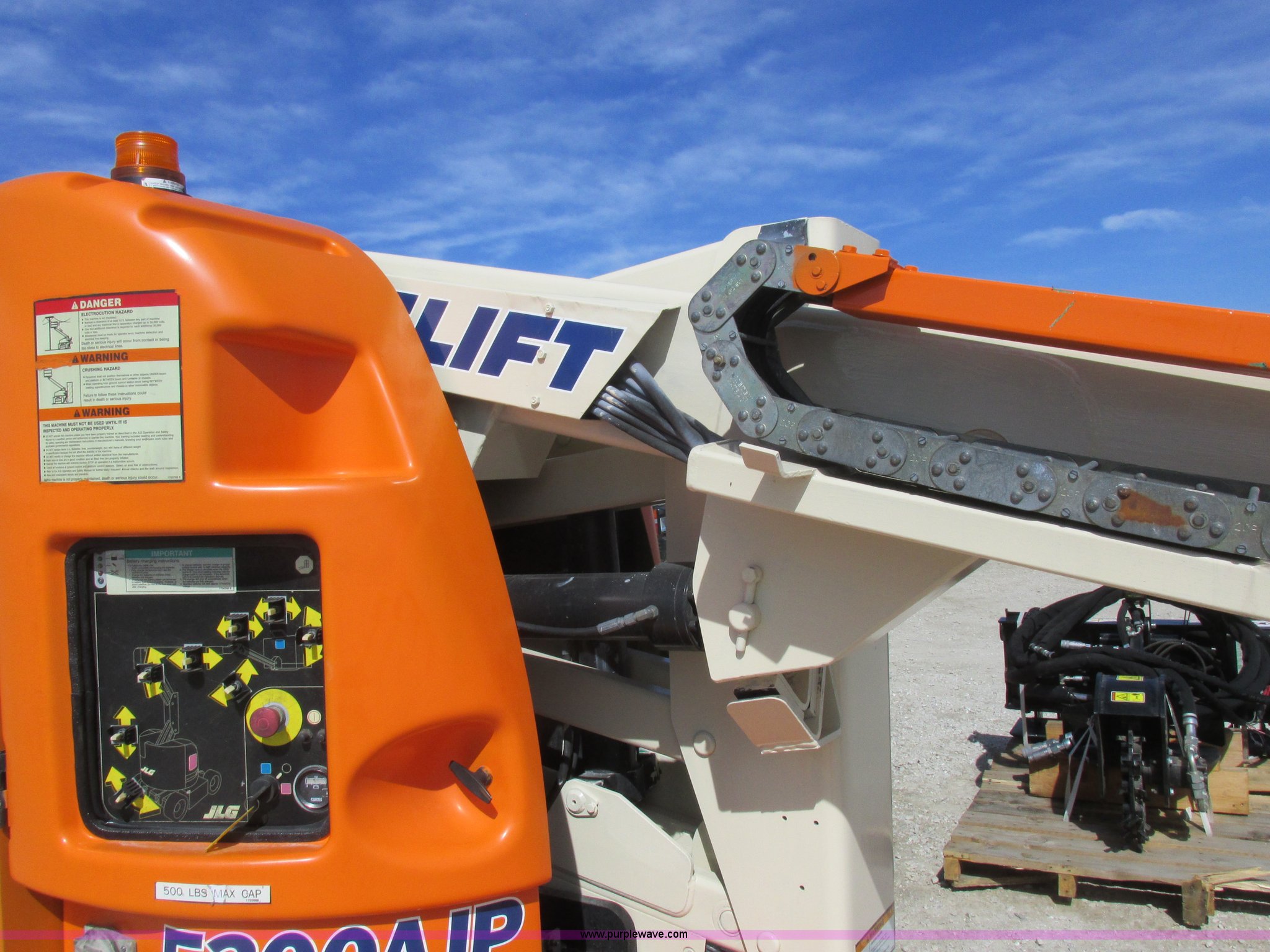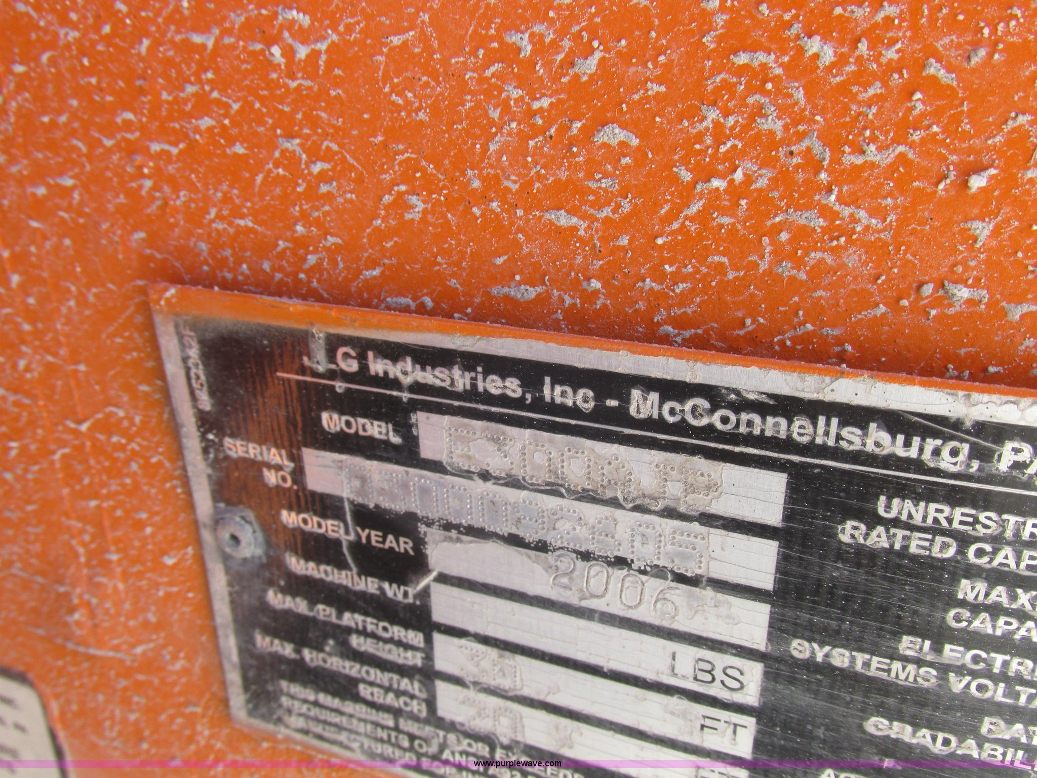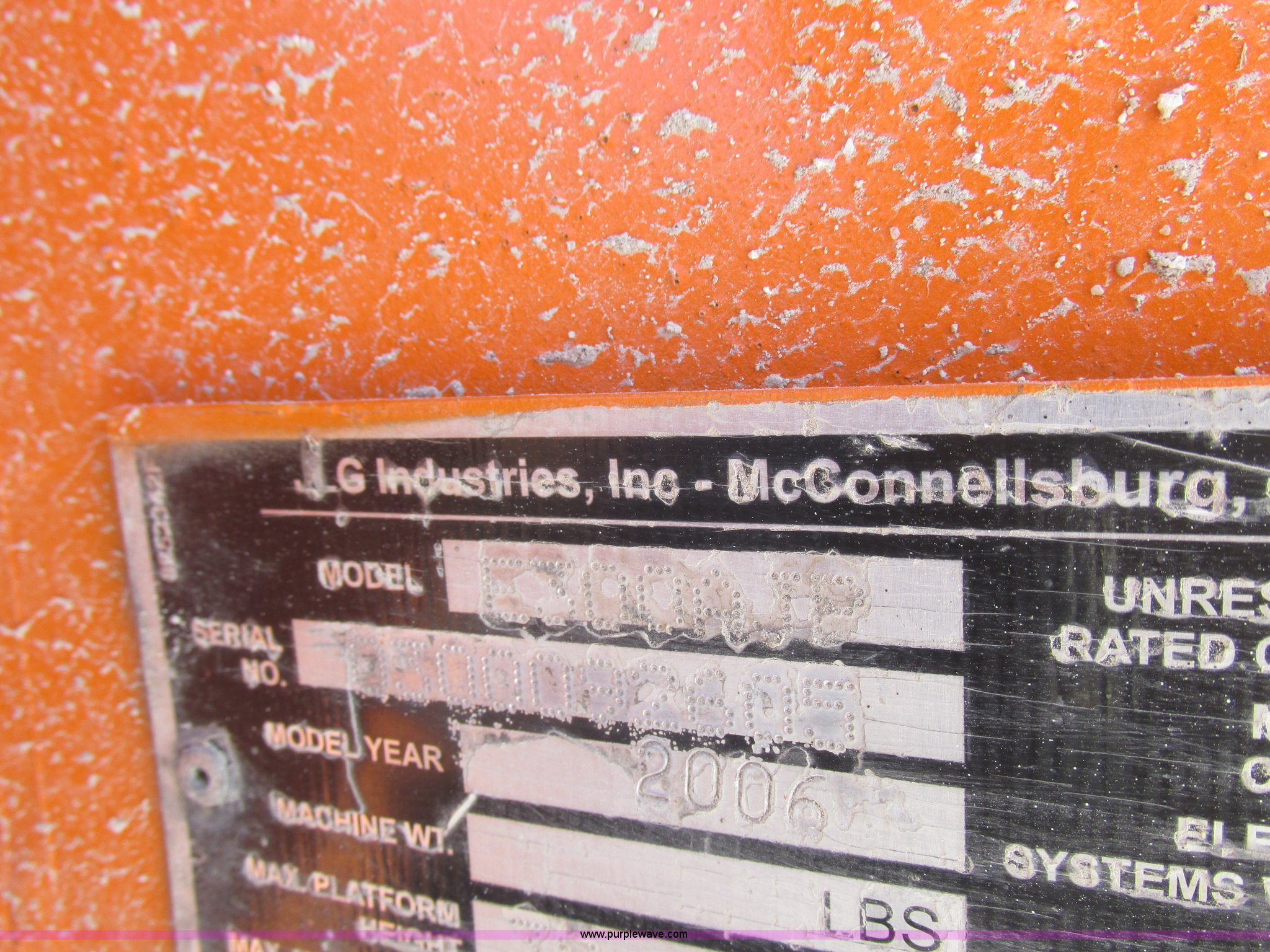 Purple Wave is selling a used Boom Lift in Missouri. This item is a 2006 JLG E300AJP boom lift with the following: 1,092 hours on meter, Electric operation, Hydrostatic transmission, 500 lbs maximum lift capacity, 30' maximum lift height, Articulating boom, 30"L x 48"W platform, AC power outlet, Platform and ground controls, Safety alarm, 25 x 7-12 solid tires, Serial 0300092605