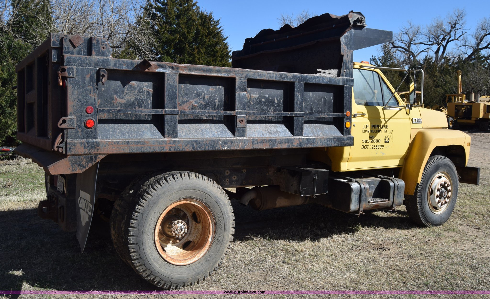 Purple Wave is selling a used Construction Dump Truck in Kansas. This item is a 1993 Ford F700 dump truck with the following: 72,260 miles on odometer, Cummins ISB 5.9L L6 diesel engine, Five speed manual transmission, Single axle, Heat, Spring suspension seat, Rogers steel dump bed, 10'L x 8'W, 30" side height, Manual operated end gate, 153" wheelbase, Spring suspension, Hydraulic brakes, 10.00-20 tires, GVWR 28,000 lbs