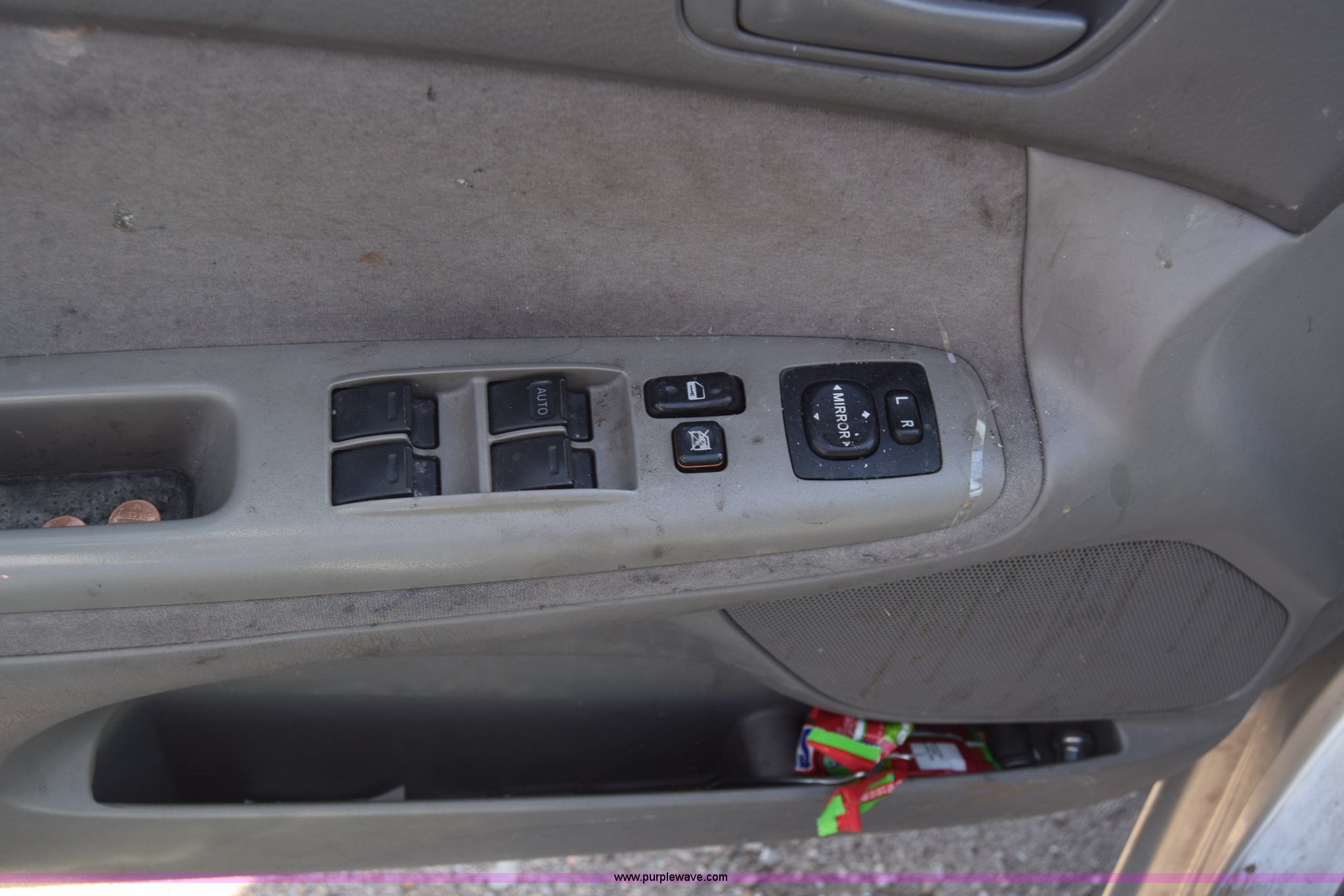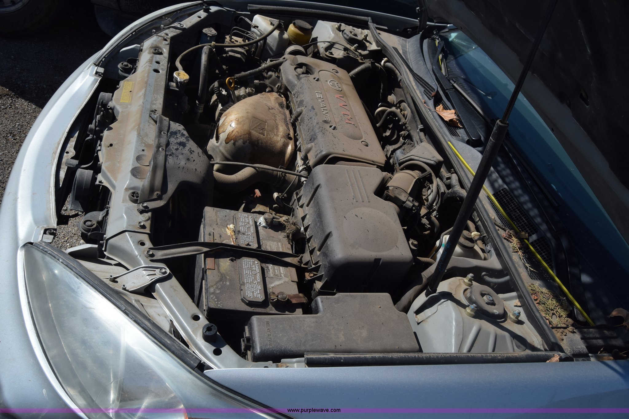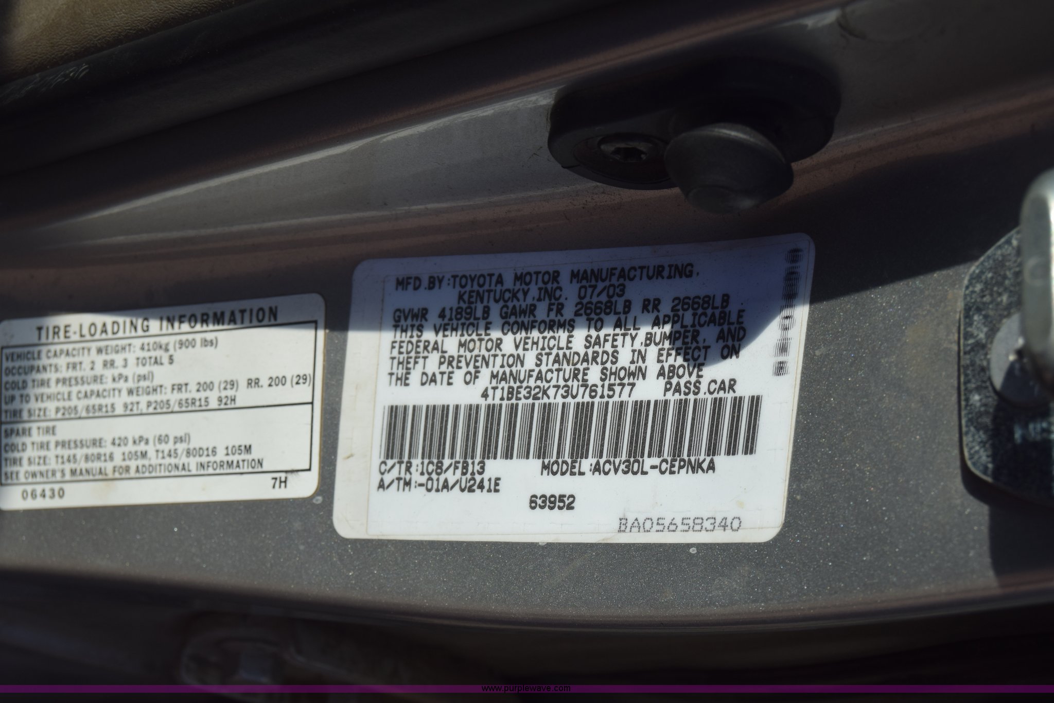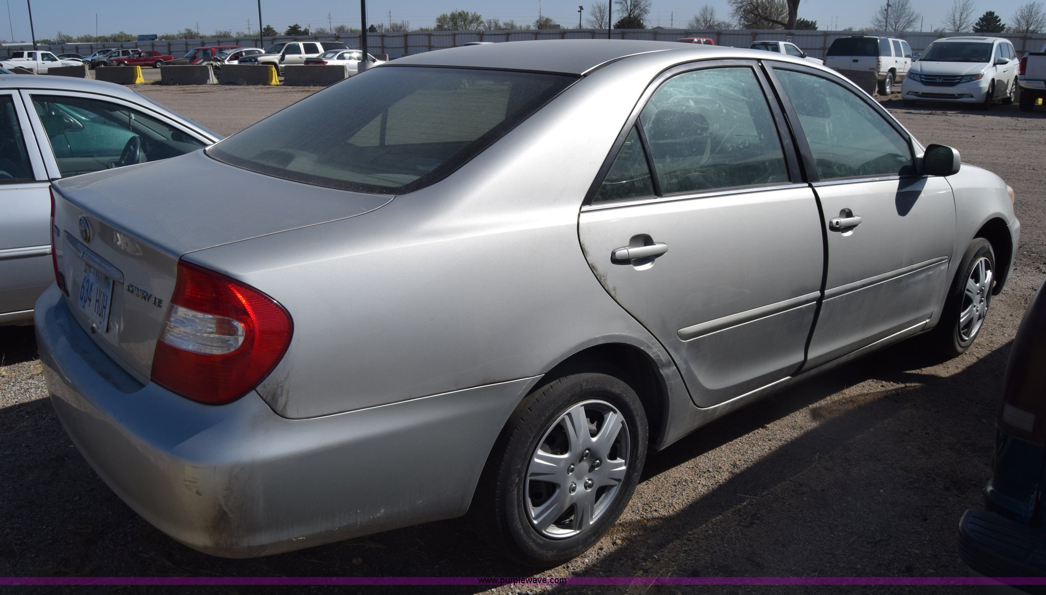 Purple Wave is selling a used Passenger Vehicle in Kansas. This item is a 2003 Toyota Camry with the following: Unknown miles on odometer, 2.4L L4 DOHC 16V gas engine, Automatic transmission, AC and heat, AM/FM/CD, Power windows, locks, and mirrors, Cloth interior, 205/70R15 tires, Interior/exterior cosmetic damage, Dents, Scratches, Cracked windshield, Case# 16C022314