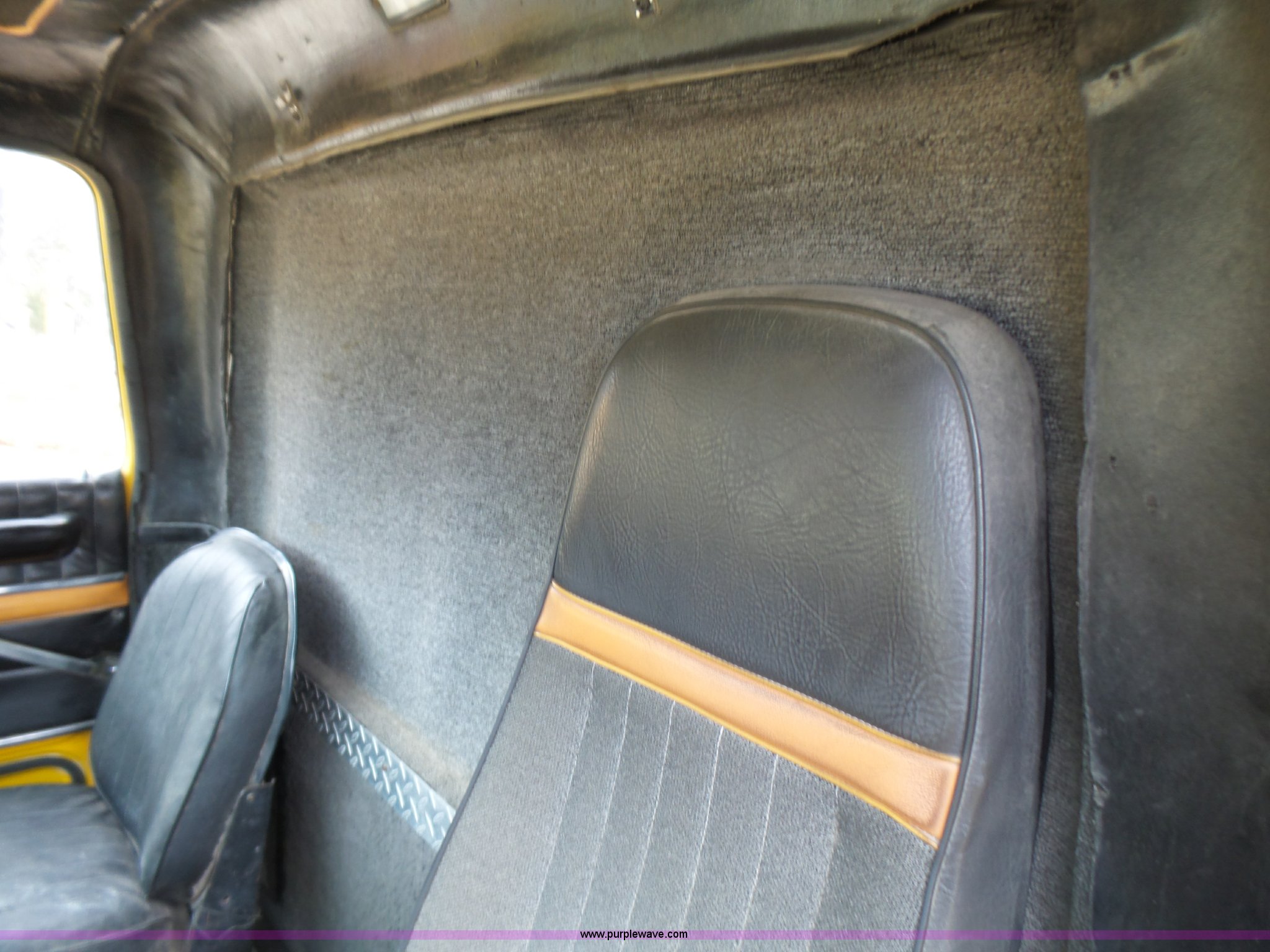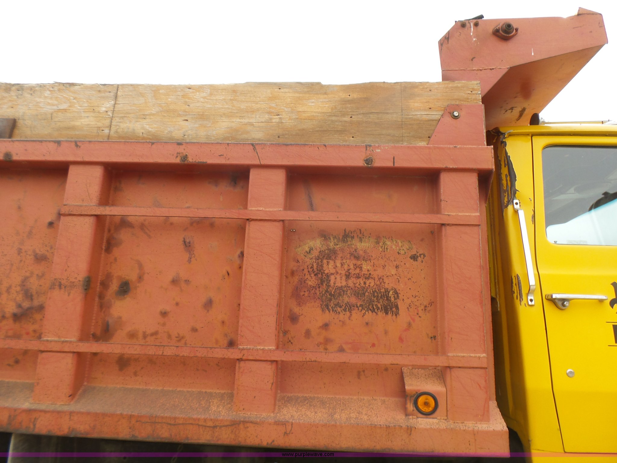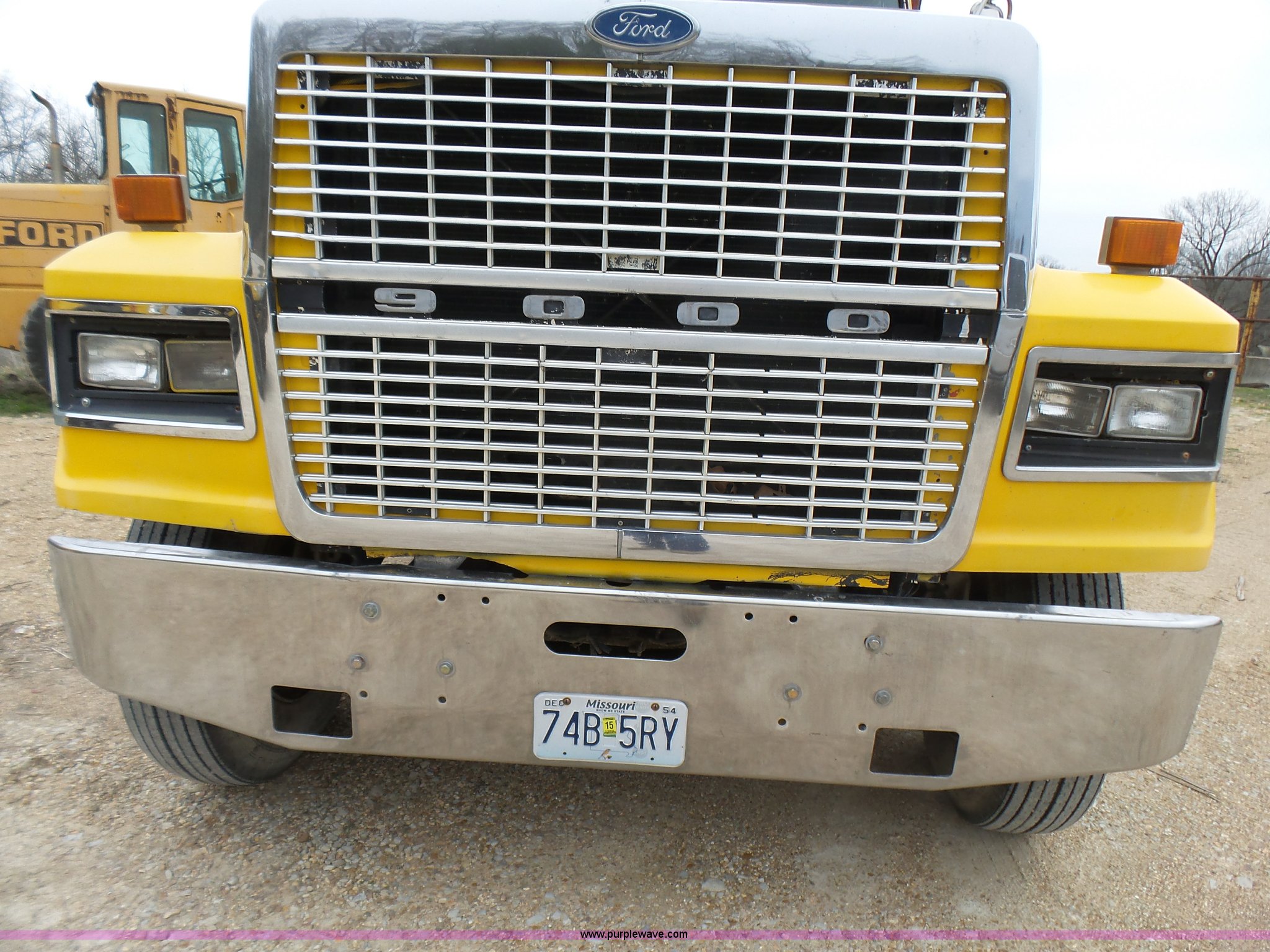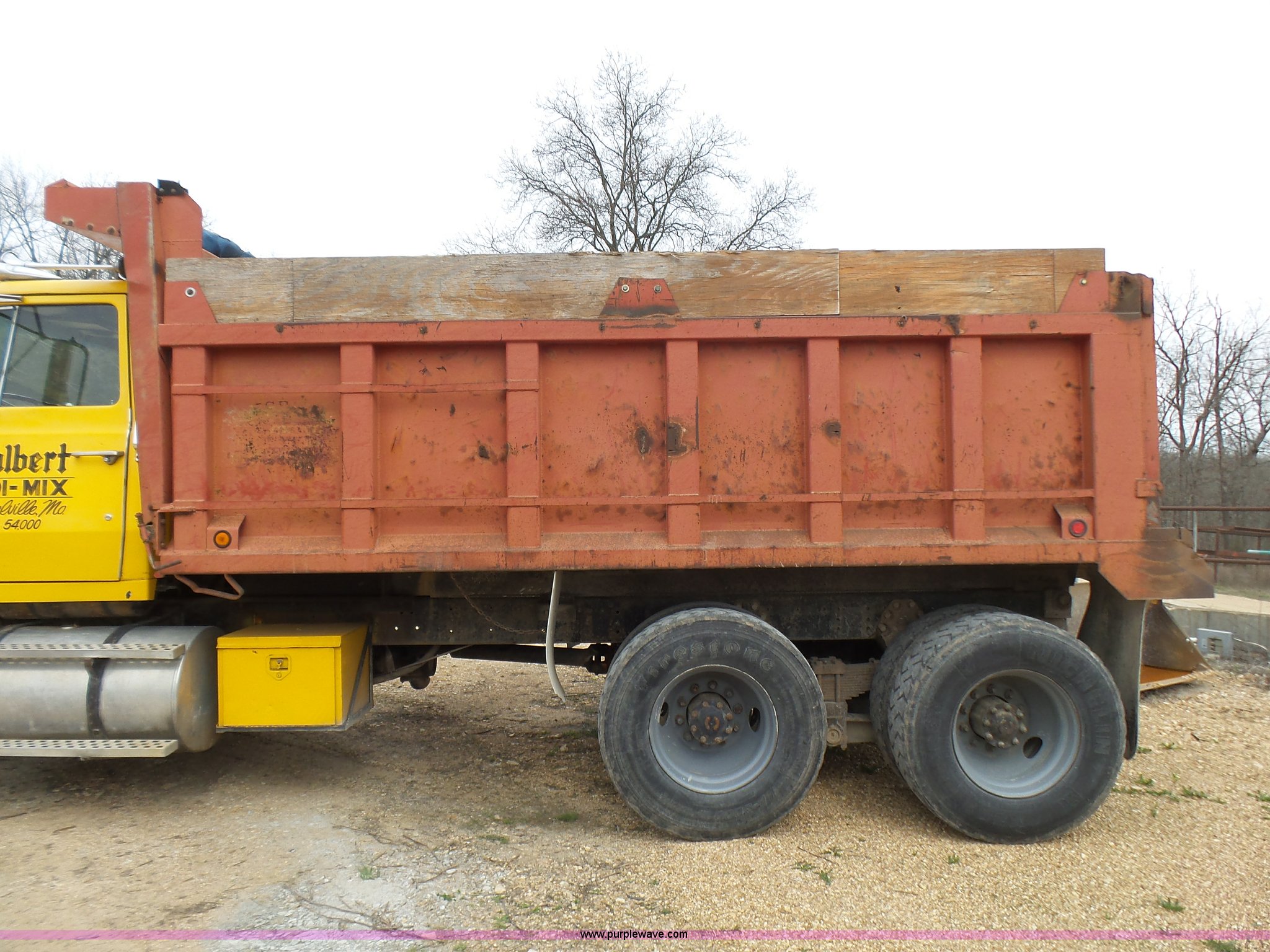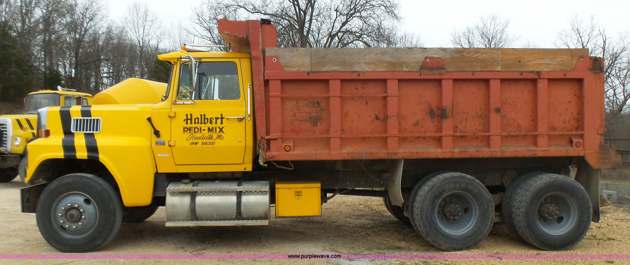 Purple Wave is selling a used Construction Dump Truck in Missouri. This item is a 1984 Ford LTL9000 dump truck with the following: 188,320 miles on odometer, Cummins 400 six cylinder turbo diesel engine, Eaton Fuller 7LL seven speed manual transmission, Tandem axle, Inter-axle differential lock, Heat, AM/FM/Cd, Air suspension seat, Chrome bumper, Toolbox, PTO, Ox Bodies steel dump bed, 15'L x 96"W, 45" side height, 12" sideboard height, 14 to 16 yard capacity, Single ram hoist, Air operated end gate, Pintle hitch, Spring suspension, Air brakes, 11R22.5 front tires, 315/80R22.5 rear tires, GVWR 54,000 lbs, Rust, Passenger side fuel tank has a hole in it, No cap