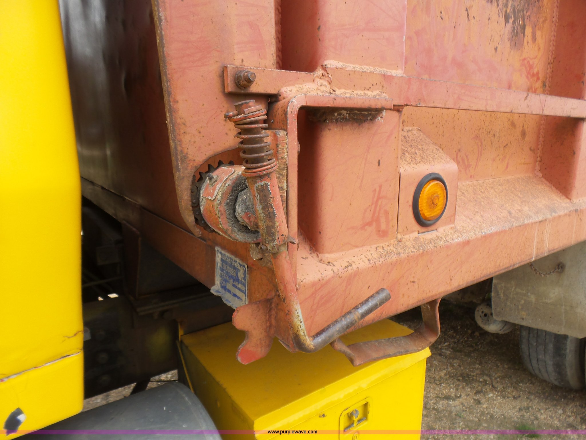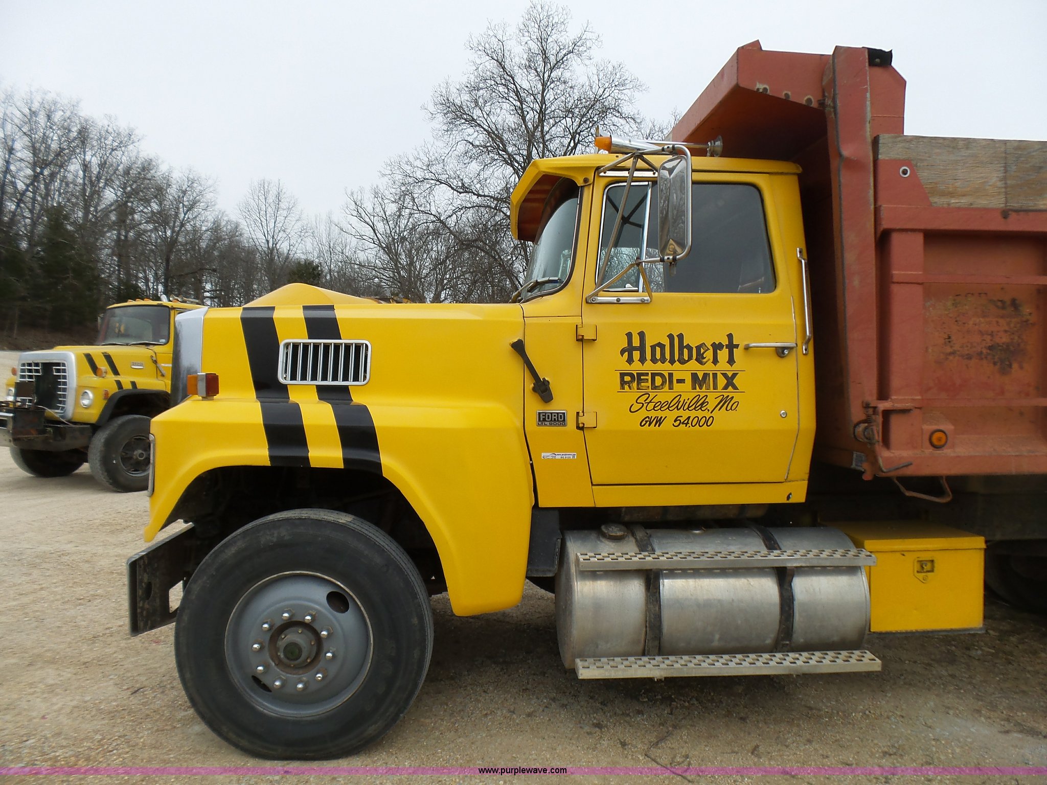 1984 Ford LTL9000 dump truck. 188,320 miles on odometer, Cummins 400 six cylinder turbo diesel engine, Eaton Fuller 7LL seven speed manual transmission, Tandem axle, Inter-axle differential lock, Heat, AM/FM/Cd, Air suspension seat, Chrome bumper, Toolbox, PTO, Ox Bodies steel dump bed 15'L x 96"W, 45" side height, 12" sideboard height, 14 to 16 yard capacity, Single ram hoist, Air operated end gate, Pintle hitch, Spring suspension, Air brakes, 11R22.5 front tires, 315/80R22.5 rear tires, GVWR 54,000 lbs, Rust, Passenger side fuel tank has a hole in it No cap. Missouri title. 1FDYA92W3EVA09979. Halbert Redi-Mix. 843 Becker Rd. Steelville, MO 65565