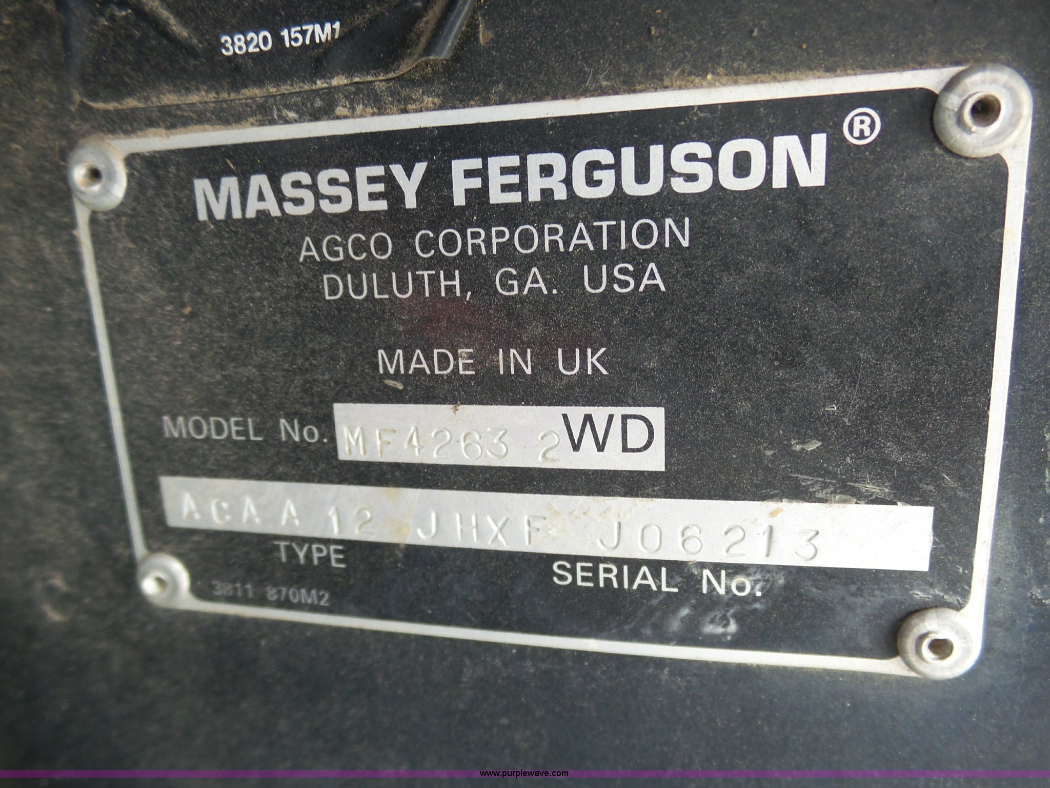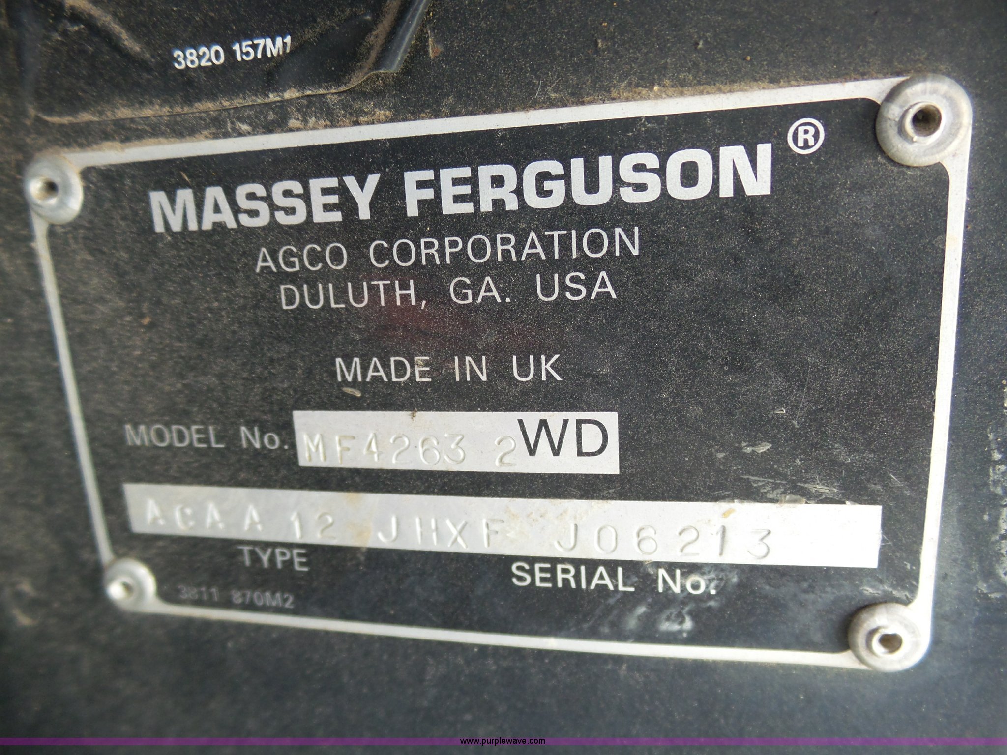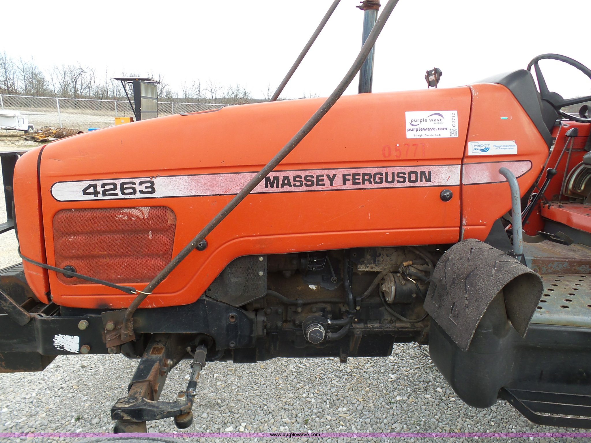 Purple Wave is selling a used Tractor in Missouri. This item is a 2000 Massey-Ferguson 4263 tractor with the following: 2,202 hours on meter, Six cylinder diesel engine, 8F-2R gears, 540 PTO, Draw bar, (2) rear hydraulic remote sets, (5) suitcase weights, 7.50R16 front tires, 18.4-30 rear tires, Engine rod knocks, Serial ACAA12KHXFJ06213, MODOT ID 05571