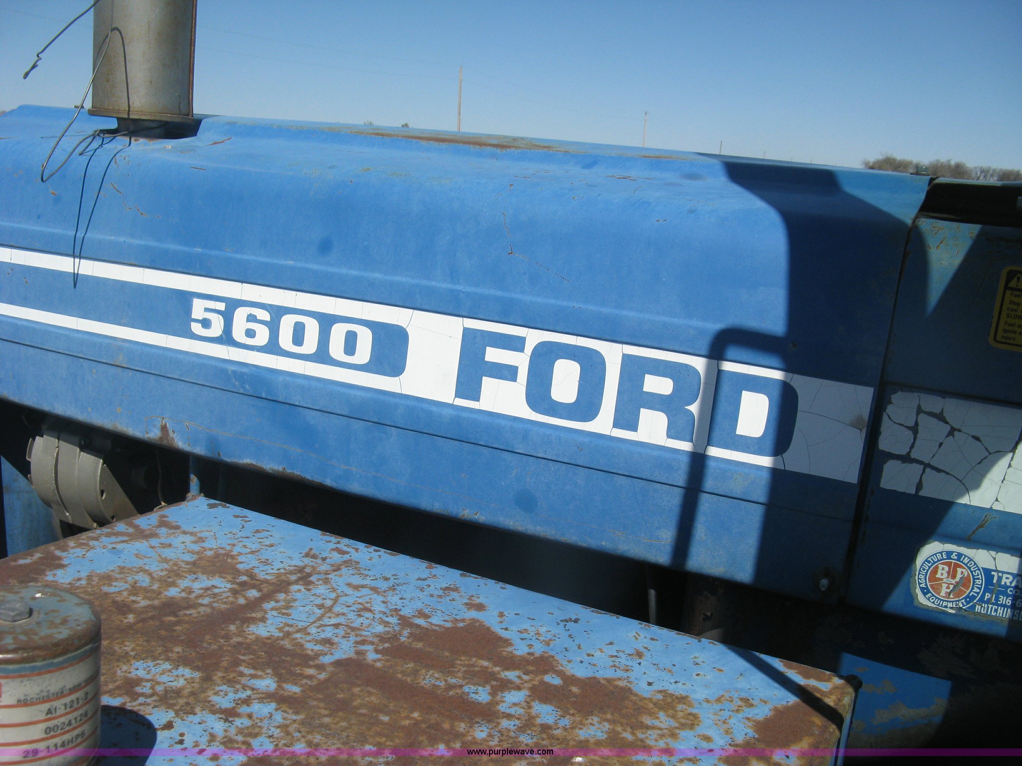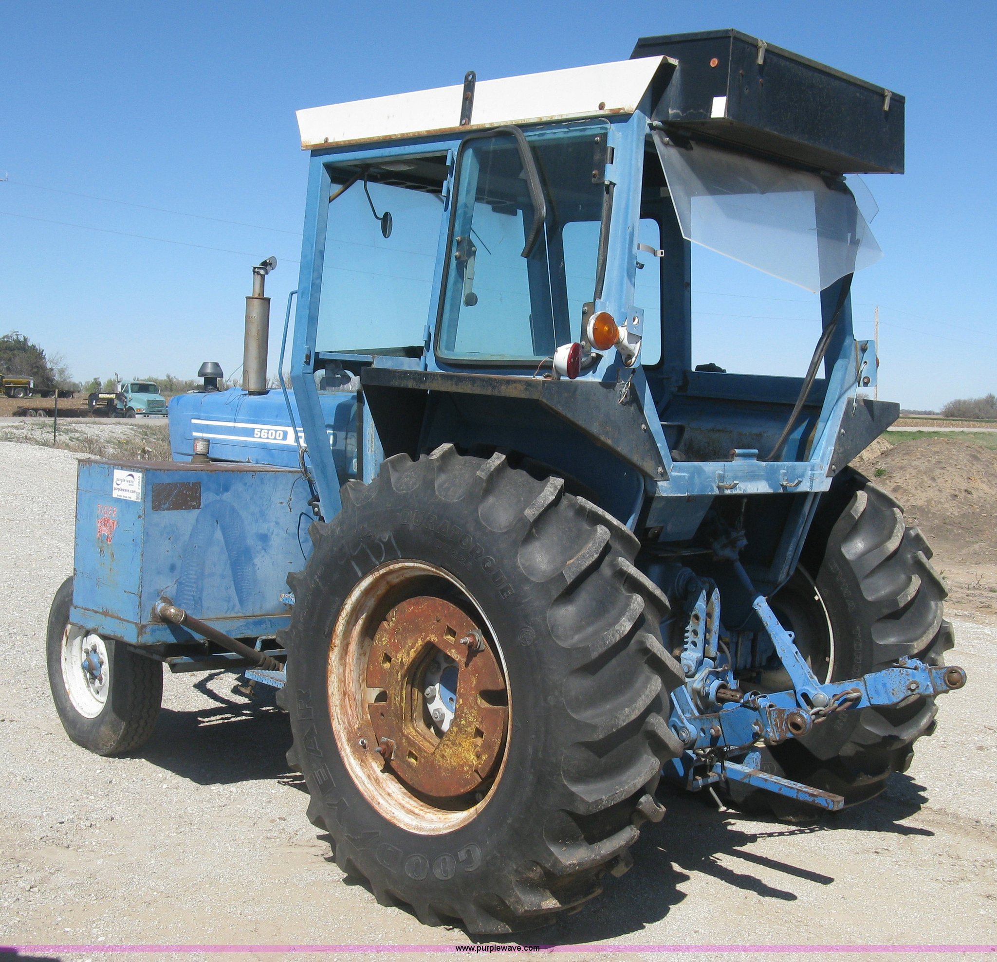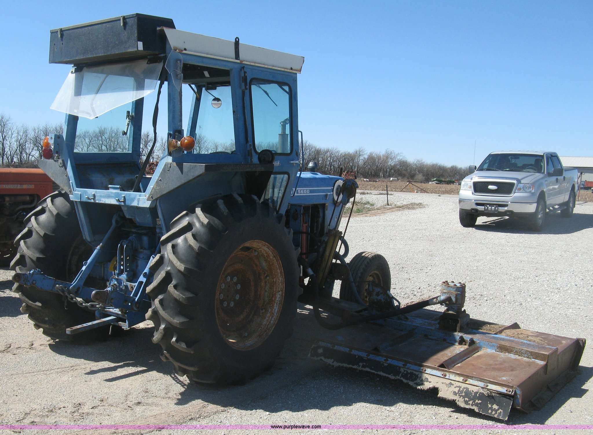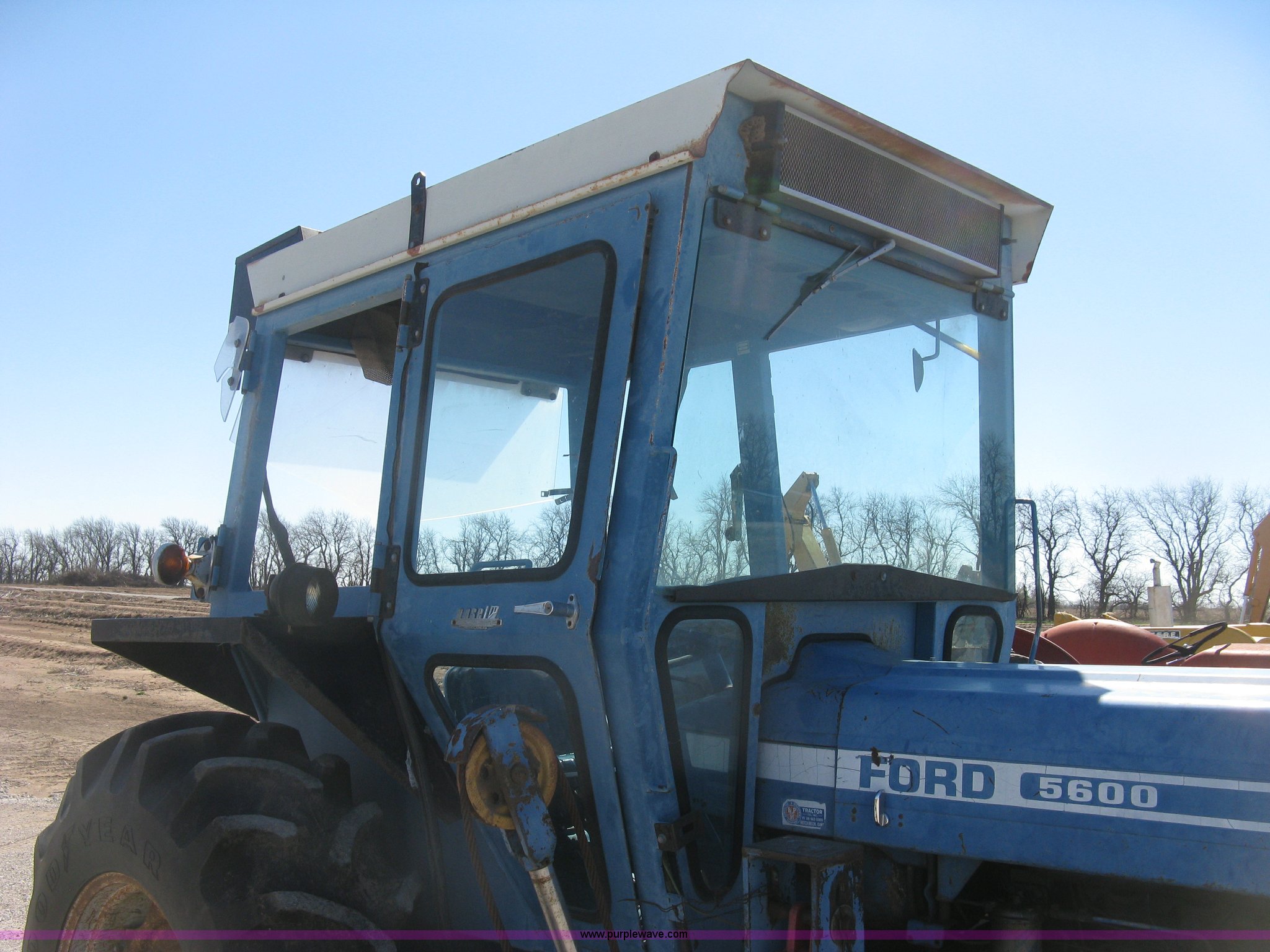 Purple Wave is selling a used Tractor in Kansas. This item is a Ford 5600 tractor with the following: 215 hours on meter, Actual hours unknown, Ford four cylinder diesel engine, Serial D5NN6015H, Manual transmission, 8F-2R gears, AC and heat, Unknown operating condition of AC and heat, Suspension seat, Three point, 540 PTO, Front mounted PTO hydraulic pump, Side mount hydraulic reservoir, Side mount rotary mower, 5'W, Hydraulic driven, Hydraulic/cable lift, Weld repair to deck frame, (2) left rear wheel weights, 7.50-16 front tires, 16.9-30 rear tires, Doors missing, Rear plexi-glass broken, Side glass missing, Serial L141556