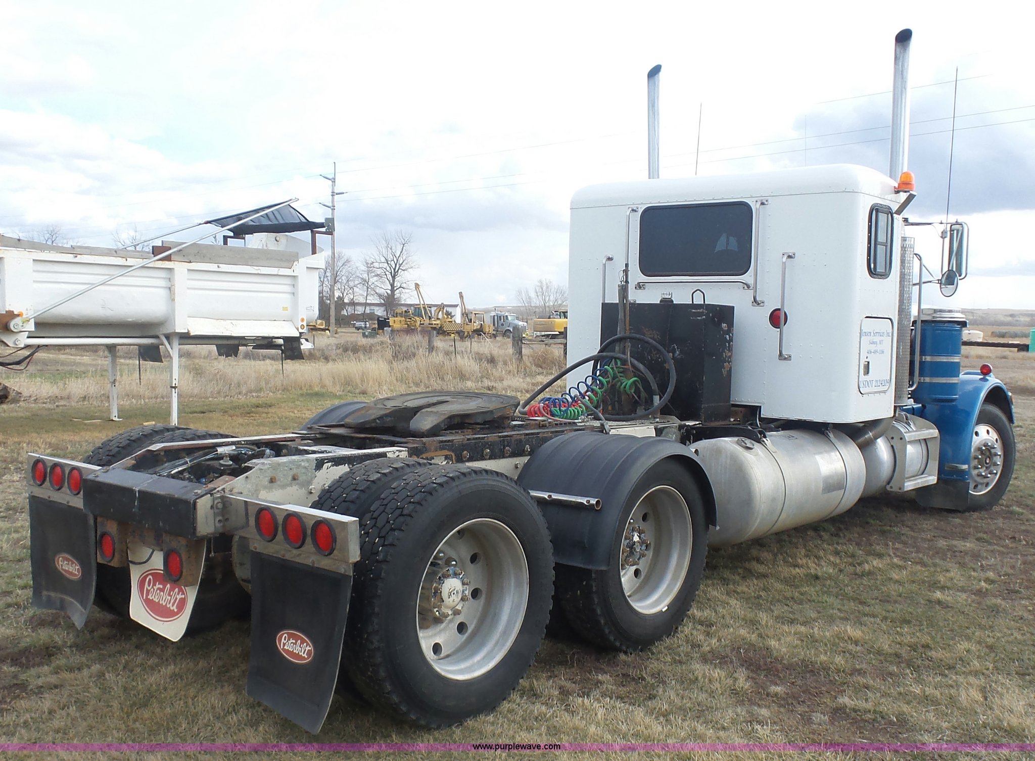 Purple Wave is selling a used Truck Tractor in Montana. This item is a 1986 Peterbilt semi truck with the following: 836,071 miles on odometer, 15,779 hours on meter, Cummins NTC400 six cylinder turbo diesel engine, Eaton Fuller 18 speed manual transmission, Tandem axle, Inter-axle differential lock, AC and heat, AM/FM/CD, Heated mirrors, Air suspension seat, Leather seat, Block heater, Ether start, Peterbilt 36" sleeper, Single bed, Rear climate control, PTO, Wet kit, Dump valves, Auxiliary electric hookup for tarp, Exterior visor, Front tow hooks, (2) beacon lights, Dual exhaust stacks, Sliding fifth wheel plate, Load scale, Dual fuel tanks, Half fenders, Mud flaps, Air suspension, Air brakes, Engine brake, Aluminum frame, 265" wheelbase, Aluminum wheels, 285/75R24.5 tires, GVWR 80,000 lbs, Additional 135 gallon fuel tank, AC condenser needs replaced