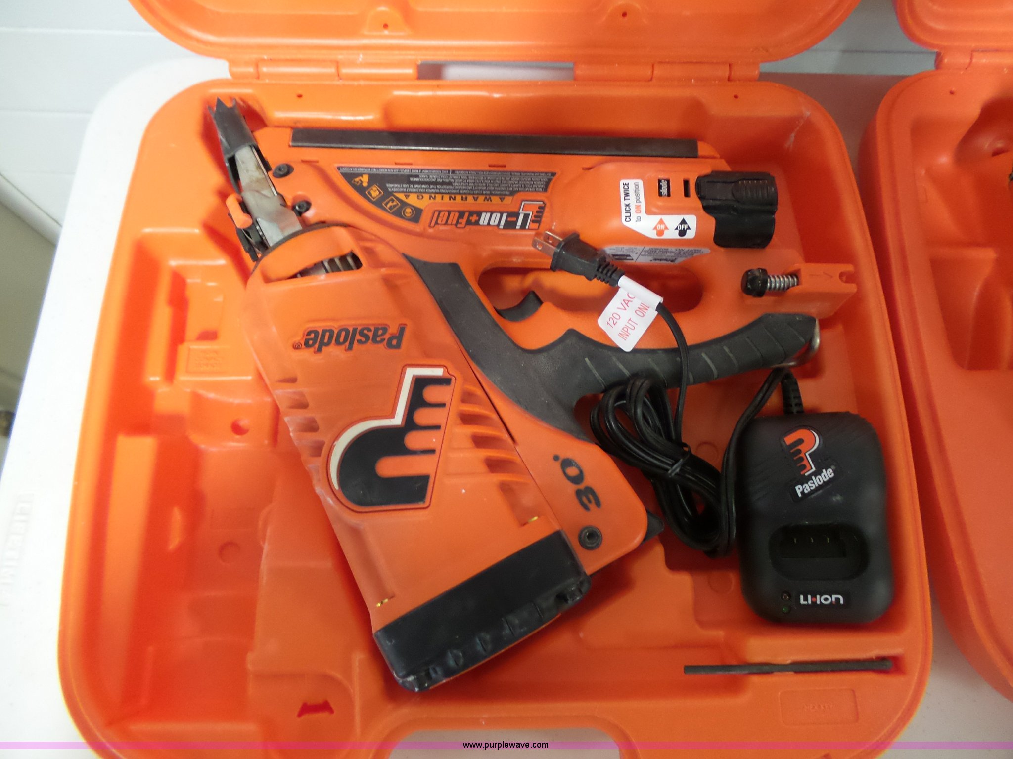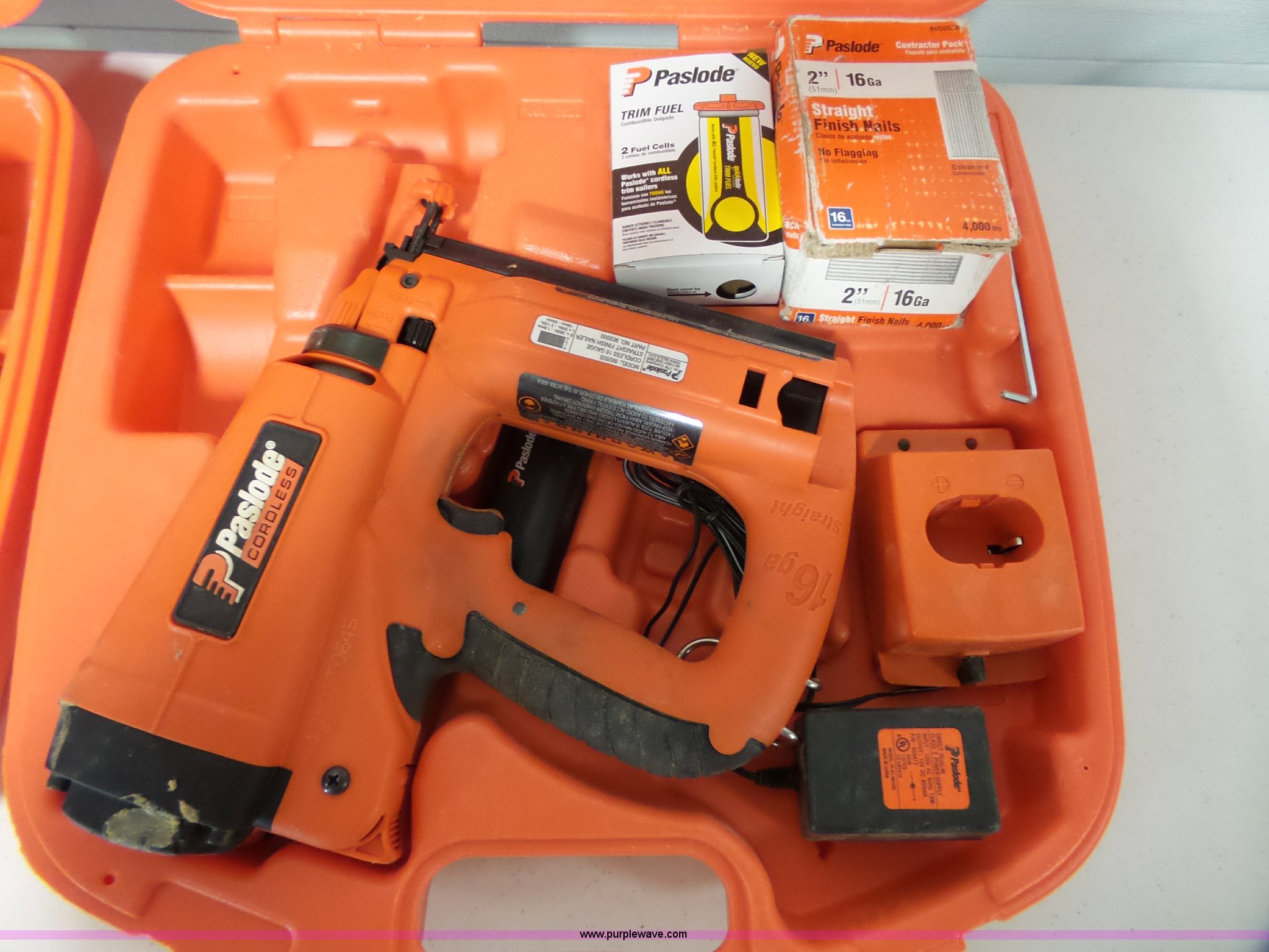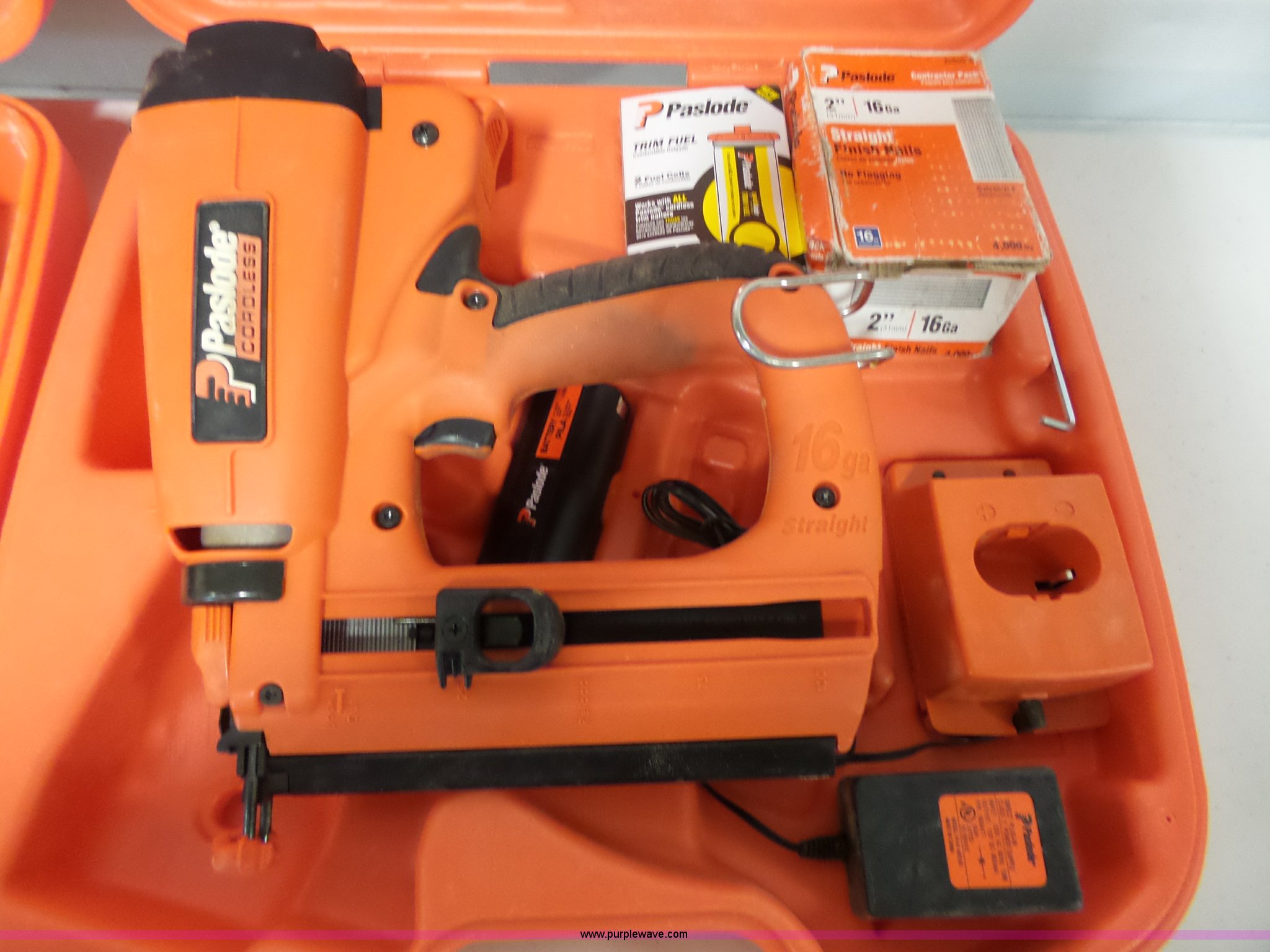 Purple Wave is selling a used Tools in Kansas. This item is a (2) Paslode cordless nail/stapler guns with the following: 16 gauge finish nailer, 30 framing nailer, Batteries and chargers included