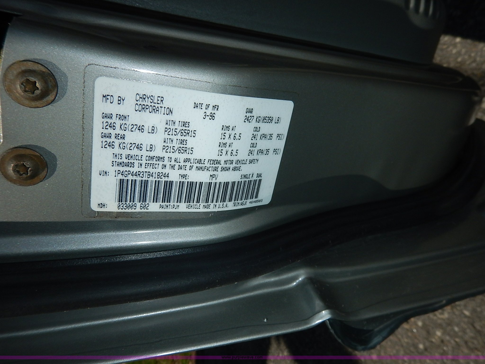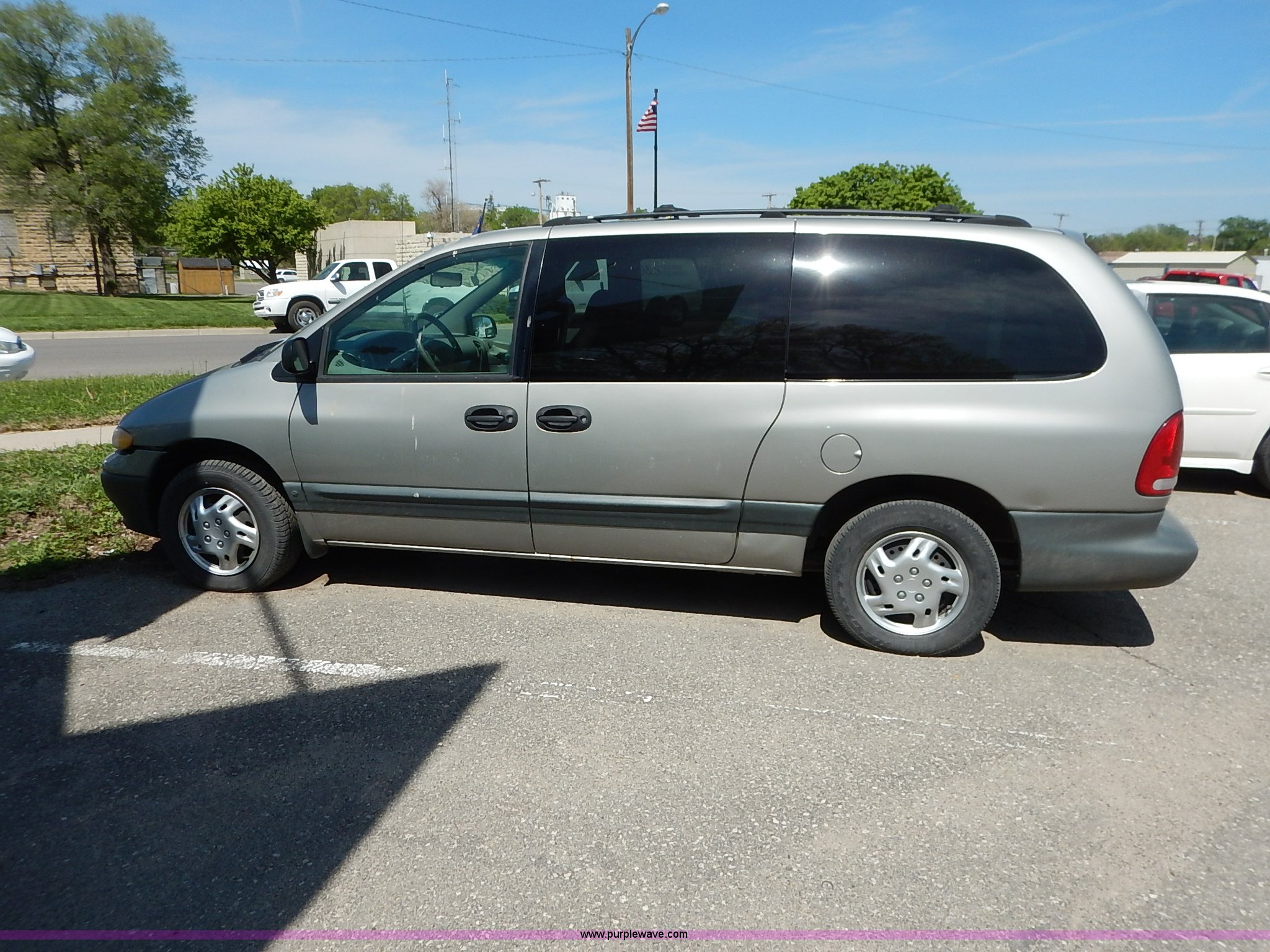 Purple Wave is selling a used Passenger Vehicle in Kansas. This item is a 1996 Plymouth Grand Voyager van with the following: 227,610 miles on odometer, 3.3L V6 OHV 12V gas engine, Automatic transmission, AC and heat, Tilt, Cruise, AM/FM/cassette, Power windows, locks, and mirrors, Cloth interior, Luggage rack, Receiver hitch, 215/65R15 tires, Chipped and cracked windshield, Rust, Dead battery