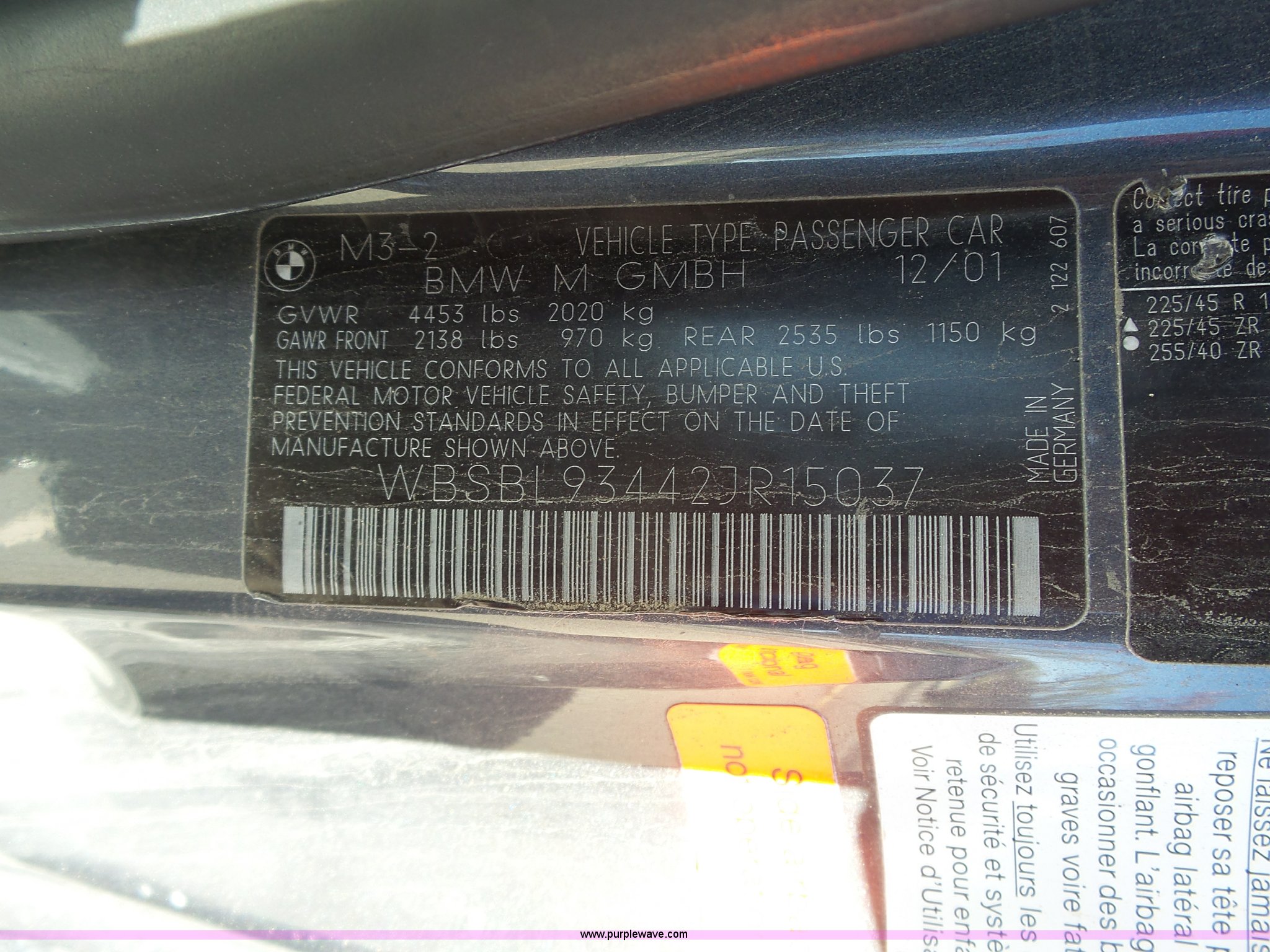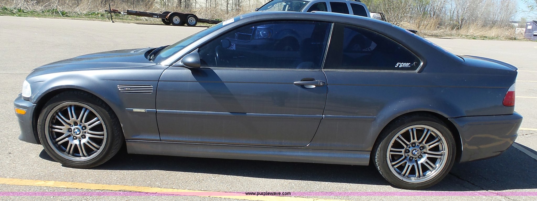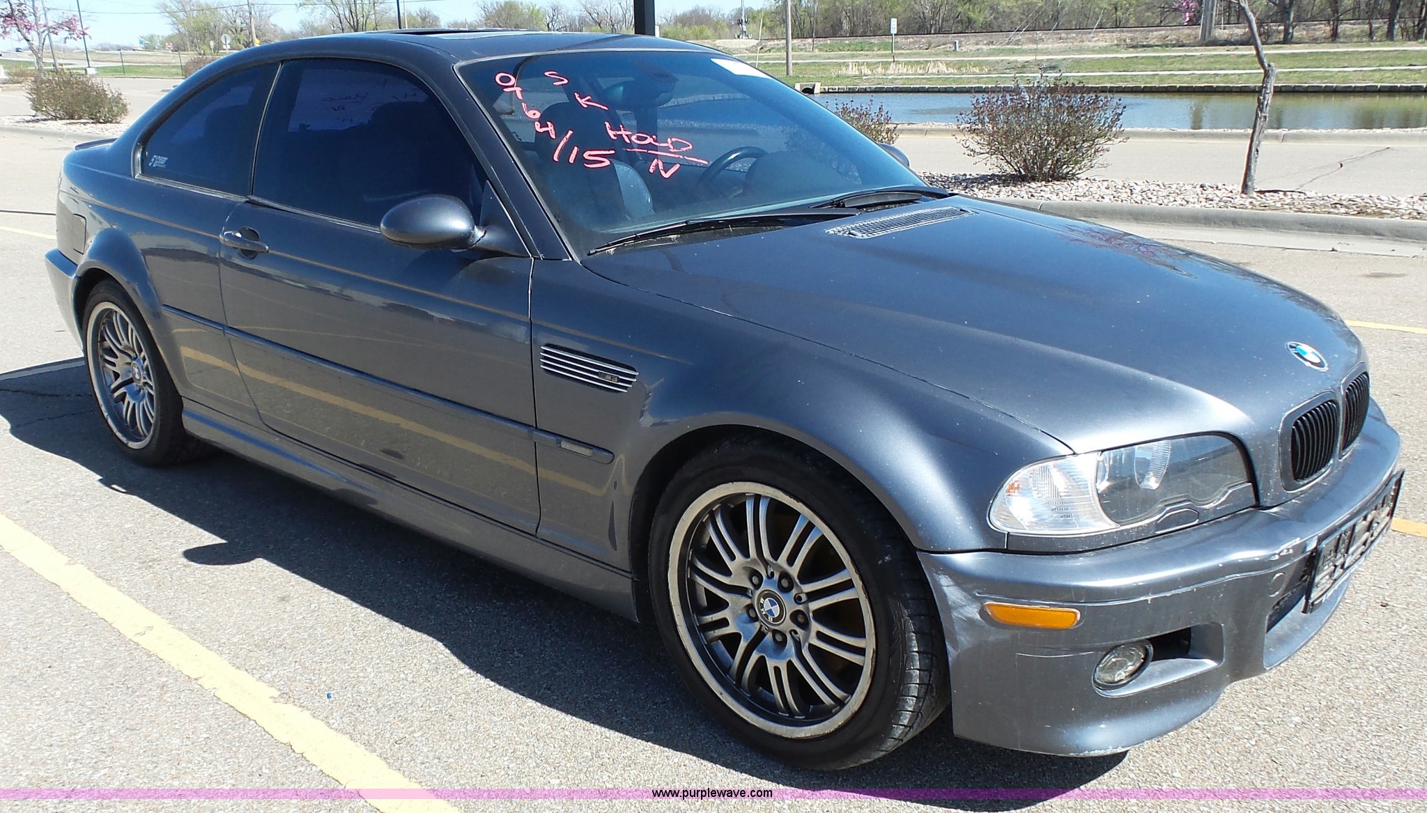 Purple Wave is selling a used Passenger Vehicle in Kansas. This item is a 2002 BMW M3 with the following: 94,281 miles on odometer, 3.2L L6 DOHC 24V gas engine, Automatic transmission, AC and heat, Cruise, AM/FM/CD, Power windows, locks, mirrors, and seats, Heated seats, Leather interior, Power sunroof, Fog lights, 225/45ZR18 tires, Unknown operating condition, Unable to start, Dead battery, Fog light damage, Scratches