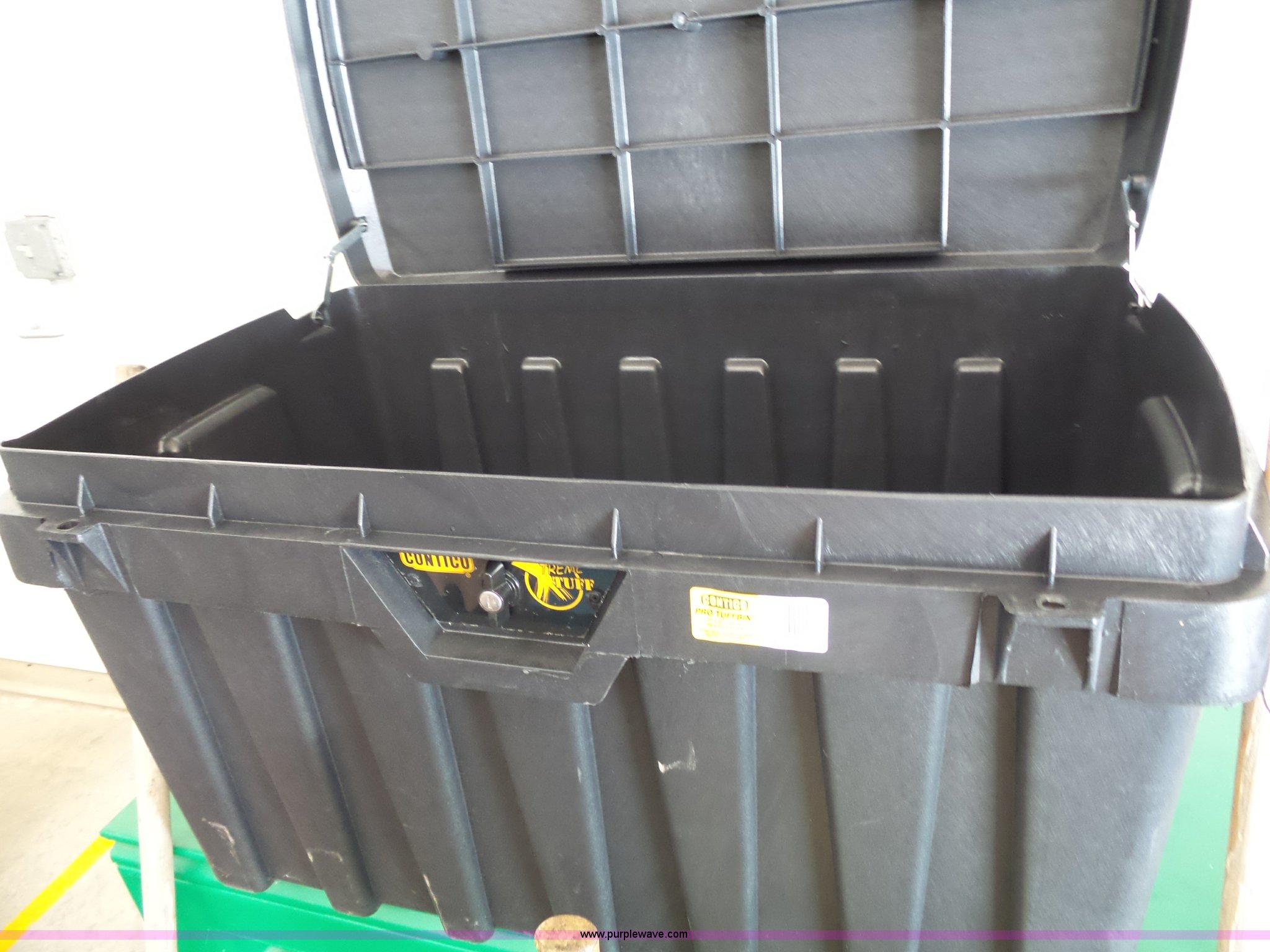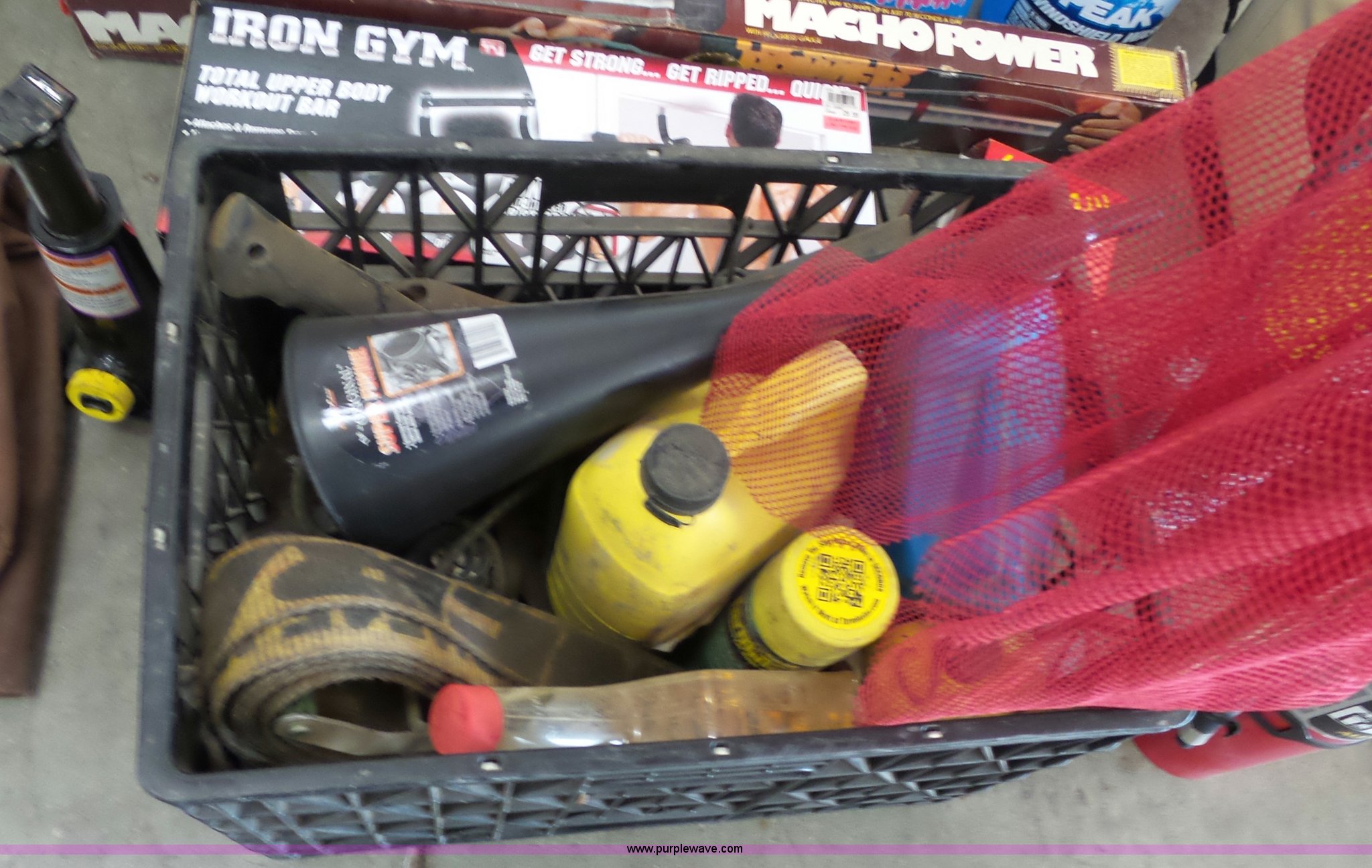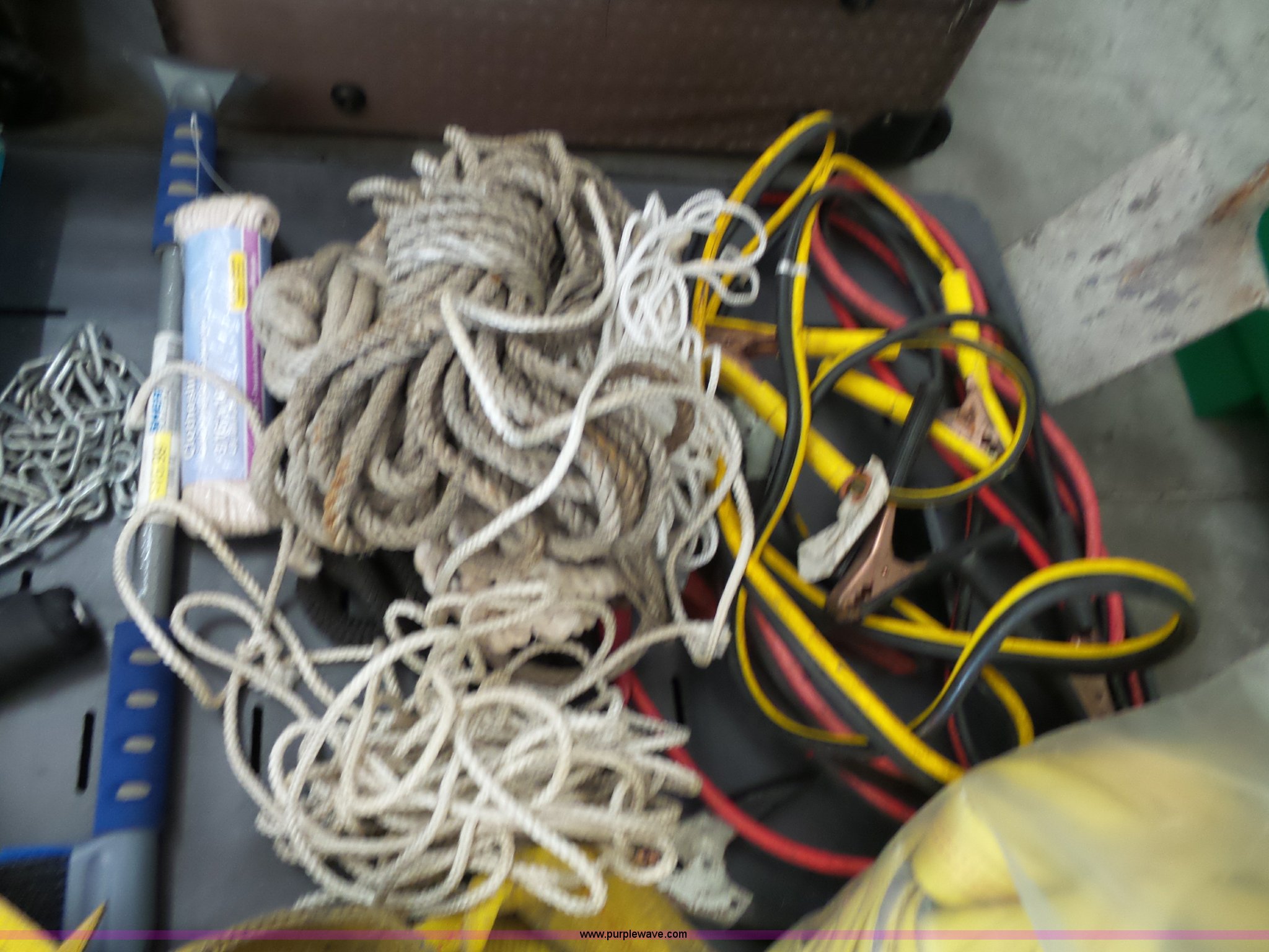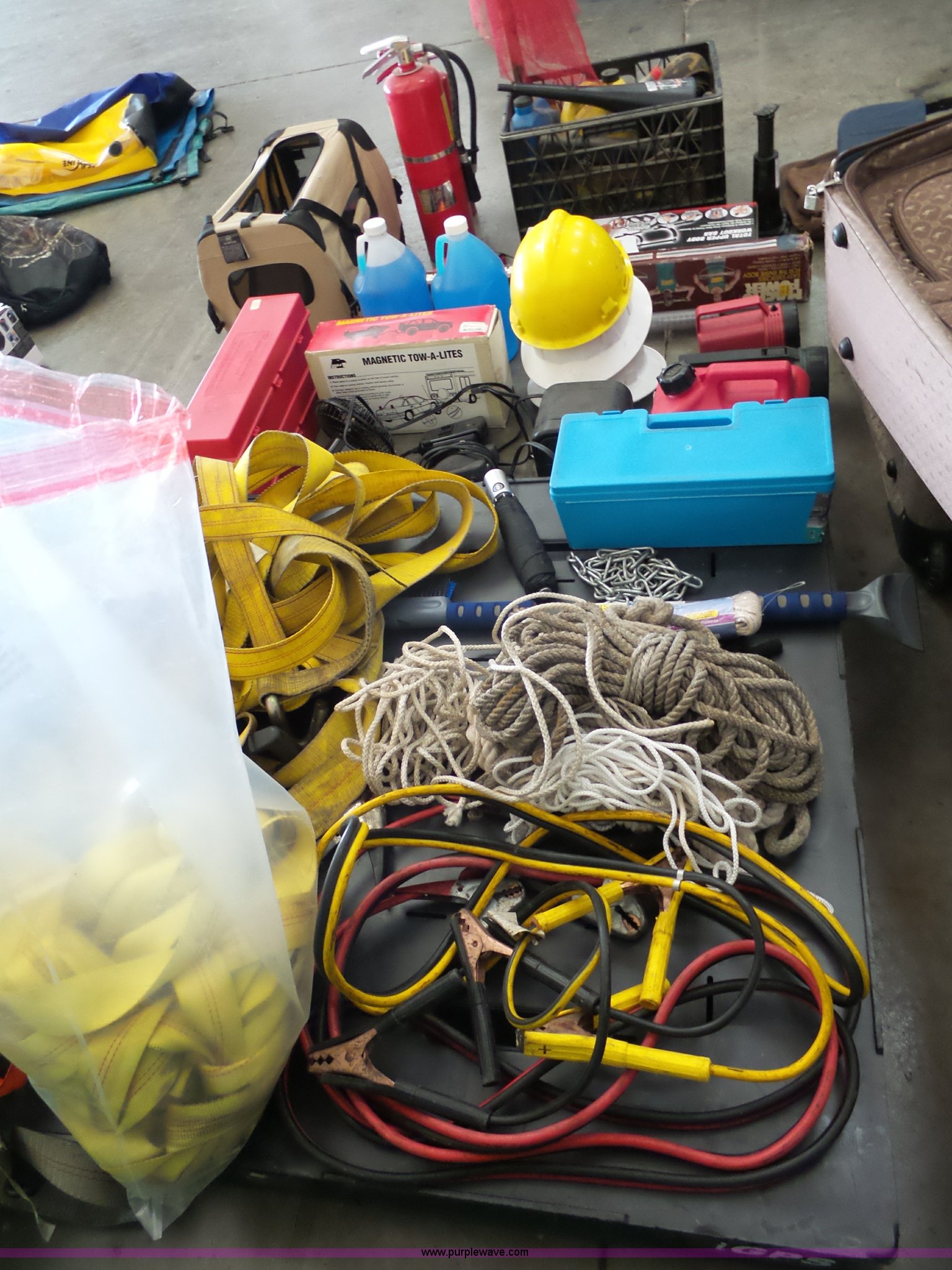 Purple Wave is selling a used Sporting Goods in Kansas. This item is a Outdoor equipment with the following: Contico xtreme tuff box, Load straps, Jumper cables, Ropes, Roadside flares, Hard hats, Luggage, Pet carrier and leash, Fire extinguishers, Flash, Worklights and more, Green box not included