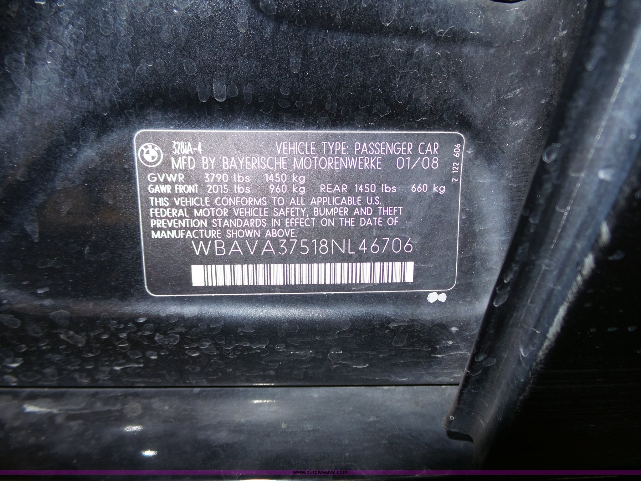 Purple Wave is selling a used Passenger Vehicle in Kansas. This item is a 2008 BMW 328i with the following: 117,838 miles on odometer, 3.0L L6 DOHC 24V gas engine, Automatic transmission, AC and heat, Tilt, Cruise, AM/FM/CD, Power windows, locks, mirrors, and seats, Leather interior, Power sunroof, 225/45ZR17 tires, Engine leaks fluid, Dead battery, Carfax history available upon request