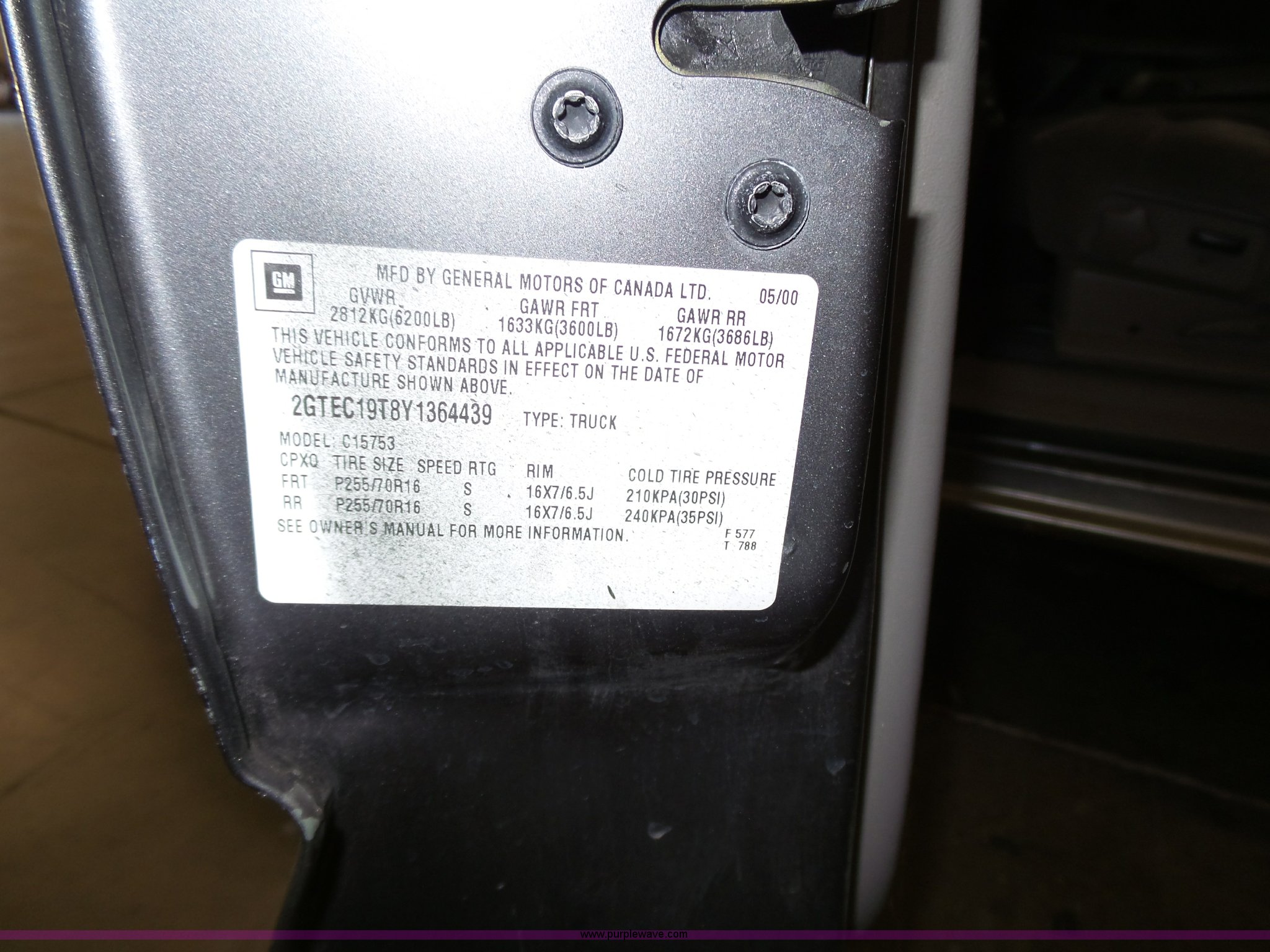 Purple Wave is selling a used 1/2 Ton Pickup or Van in Kansas. This item is a 2000 GMC Sierra 1500 pickup truck with the following: 204,467 miles on odometer, 5.3L V8 OHV 16V gas engine, Automatic transmission, AC and heat, Tilt, Cruise, AM/FM/CD/cassette, Power windows, locks, mirrors, and seat, Cloth interior, Bed liner, Front tow hooks, Receiver hitch, Trailer wiring, 255/70R16 tires, Front bumper damage, Rust, Carfax history available upon request