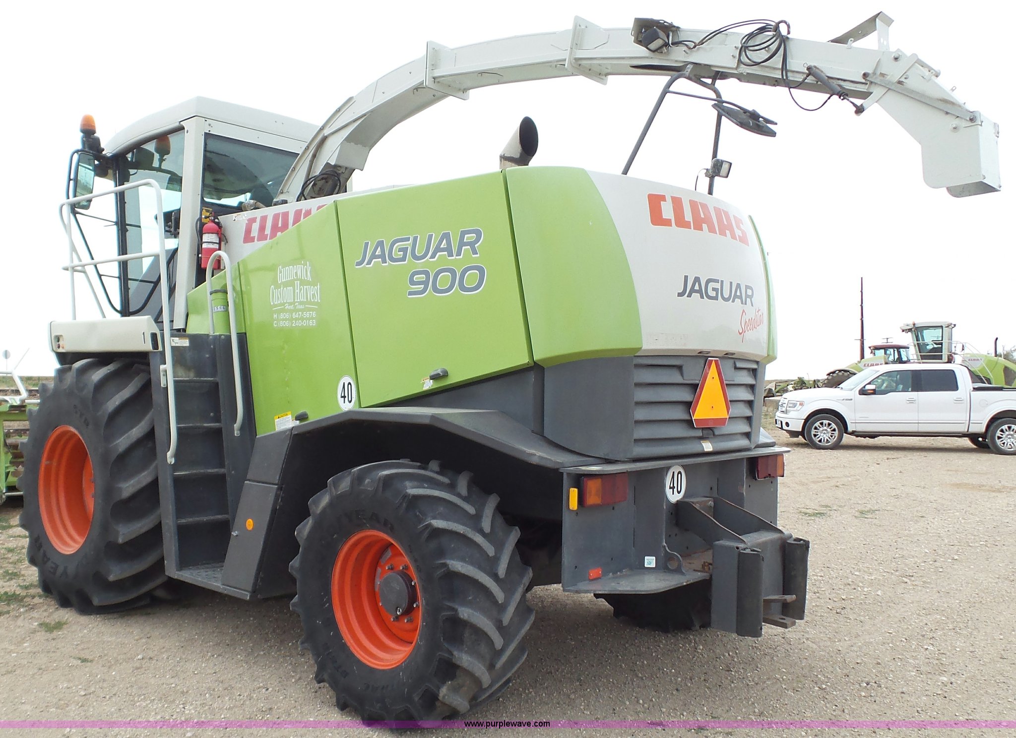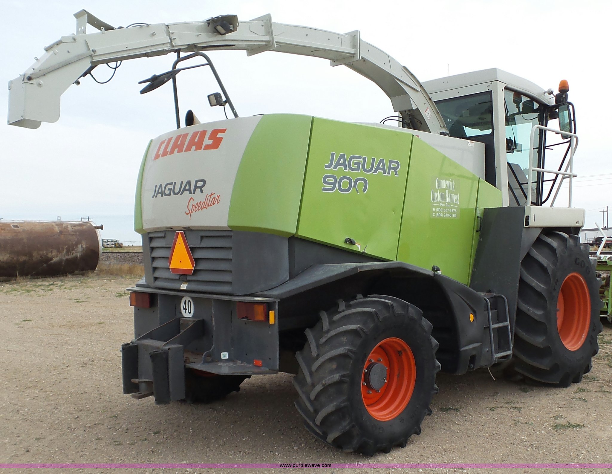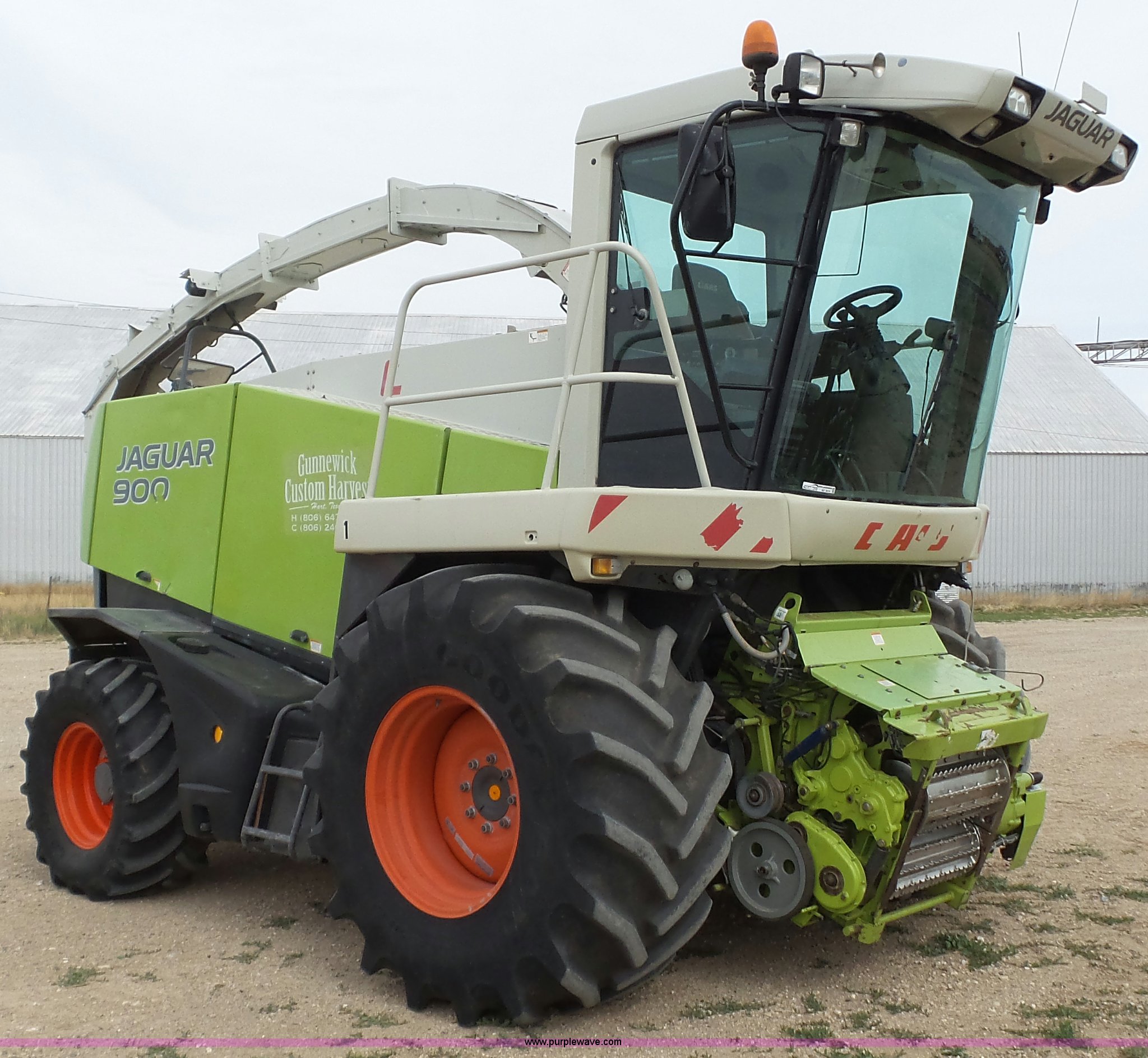 2006 Claas 900 forage harvester. 6,195 engine hours on meter, 4,579 cutting hours on meter, Mercedes Benz eight cylinder turbo diesel engine, Hydrostatic transmission, AC and heat, Tilt steering wheel, AM/FM, Suspension seat, Instructor's seat, On-board air, High arch spout Hydraulic adjust, 800/65R32 front tires, 540/65R24 rear tires, Serial 49205196. Gunnewick Custom Harvesting. 2050 CR 520. Hart, TX 79043
