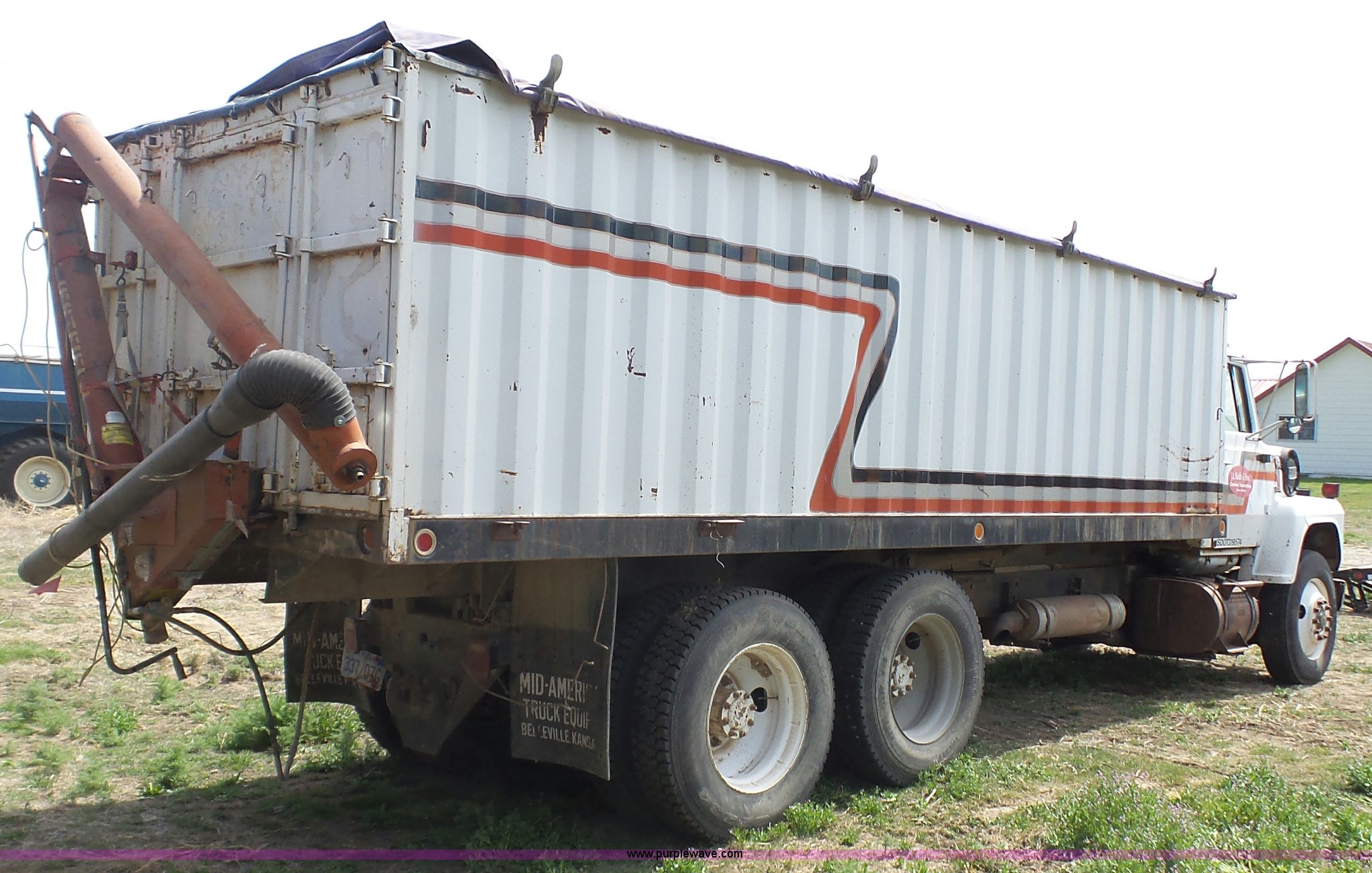Purple Wave is selling a used Grain Truck in Kansas. This item is a 1981 Ford LNT9000 grain truck with the following: 210,572 miles on odometer, Cummins MTC-300 six cylinder turbo diesel engine, Nine speed manual transmission, Tandem axle, AC and heat, Suspension seat, Brake controller, PTO, Scott steel grain bed, 22'L x 8'W, 60" side height, Rollover tarp, Manual end gate, Harsh dual ram hoist, Dual fuel tanks, Pintle hitch, Spring suspension, Air brakes, Double frame, 11R24.5 tires, GVWR 44,800 lbs, Auger not included