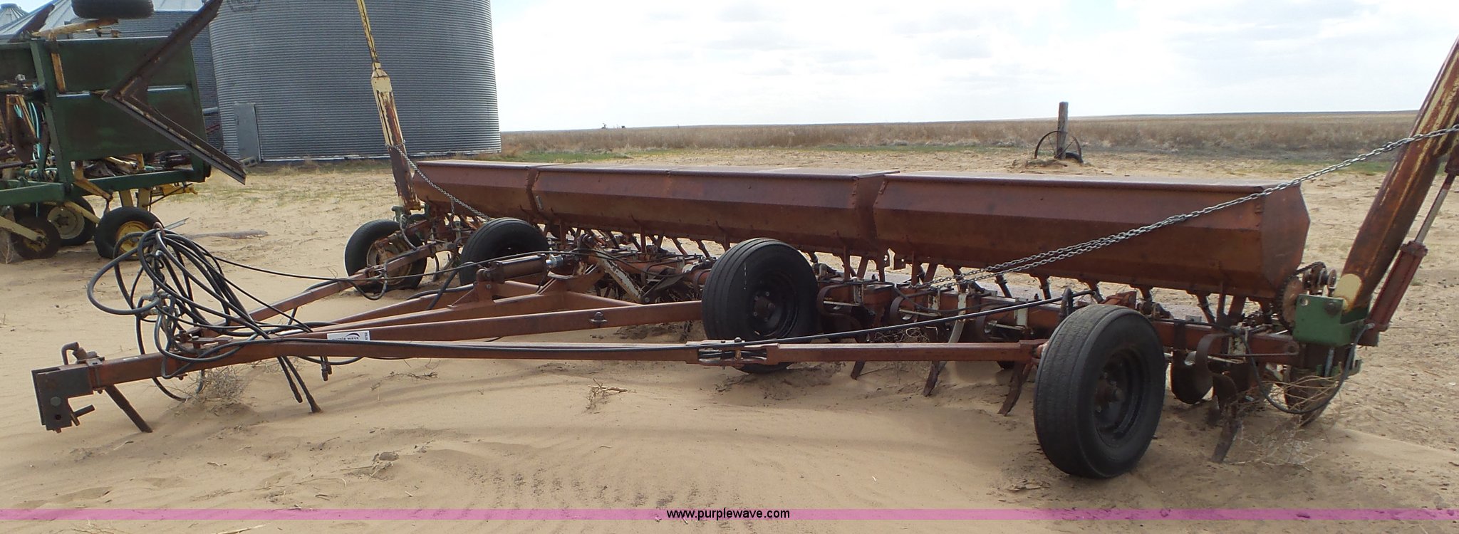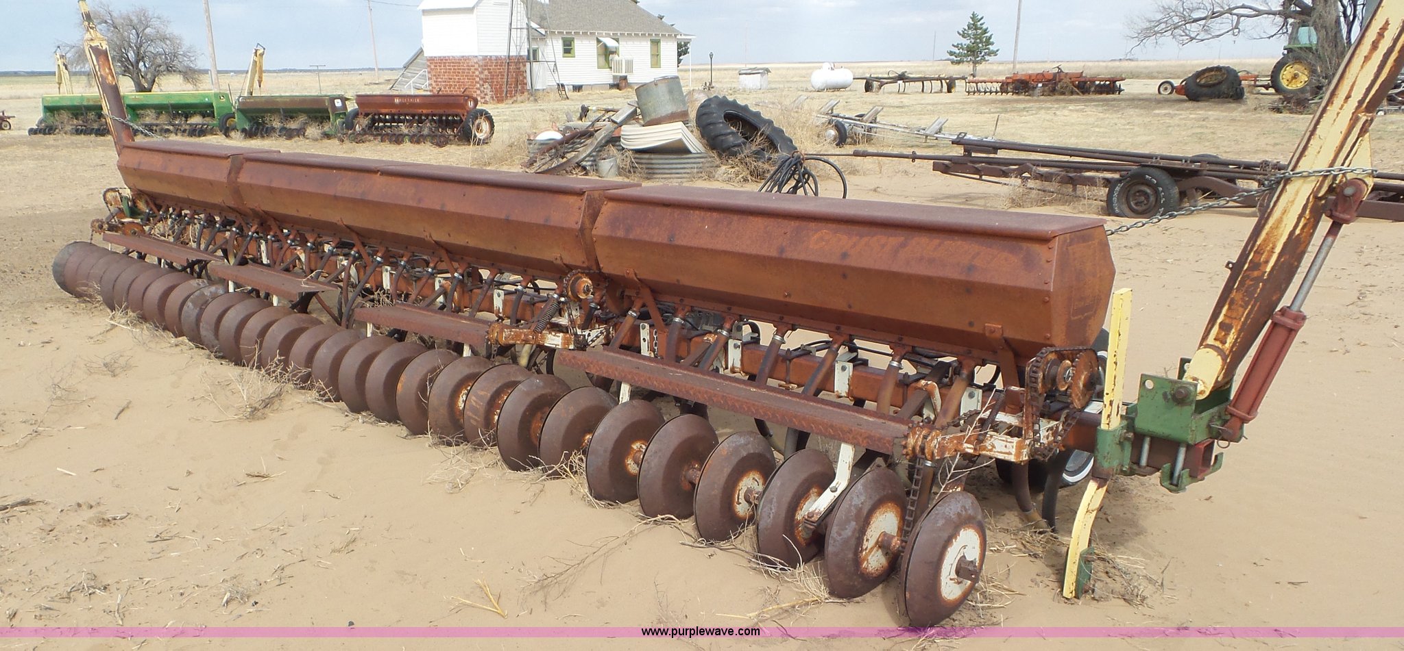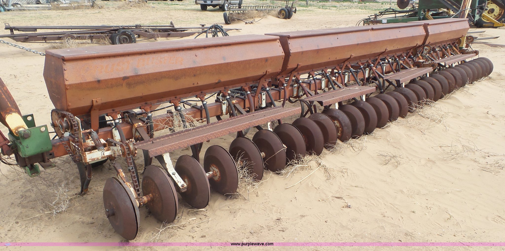 Purple Wave is selling a used Grain Drill or Seeder in Kansas. This item is a CrustBuster hoe drill with the following: 24'W, 10" spacing, Hydraulic fold markers, Pin hitch, 14" tires, Serial 1041
