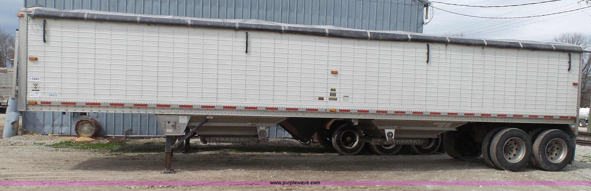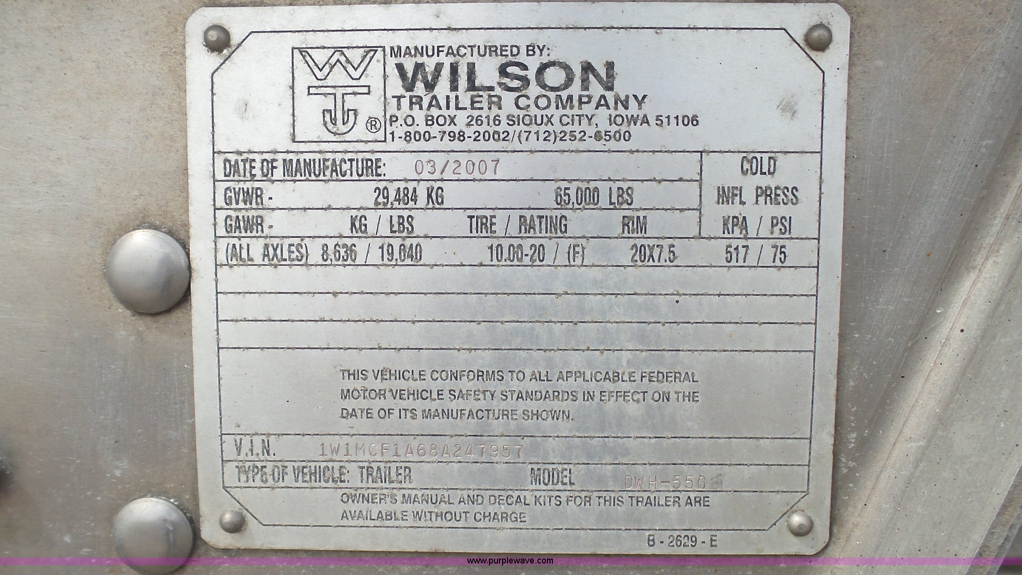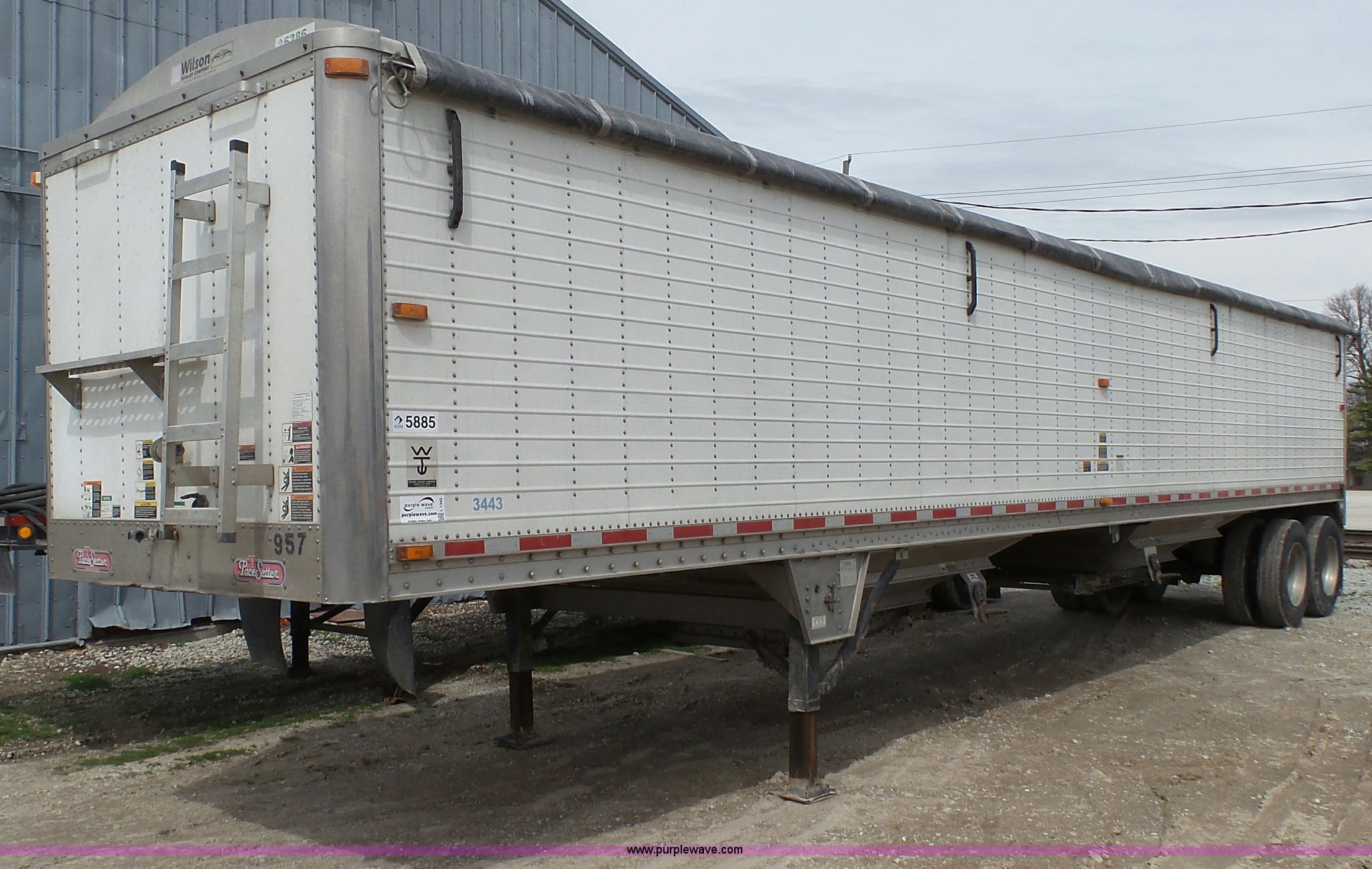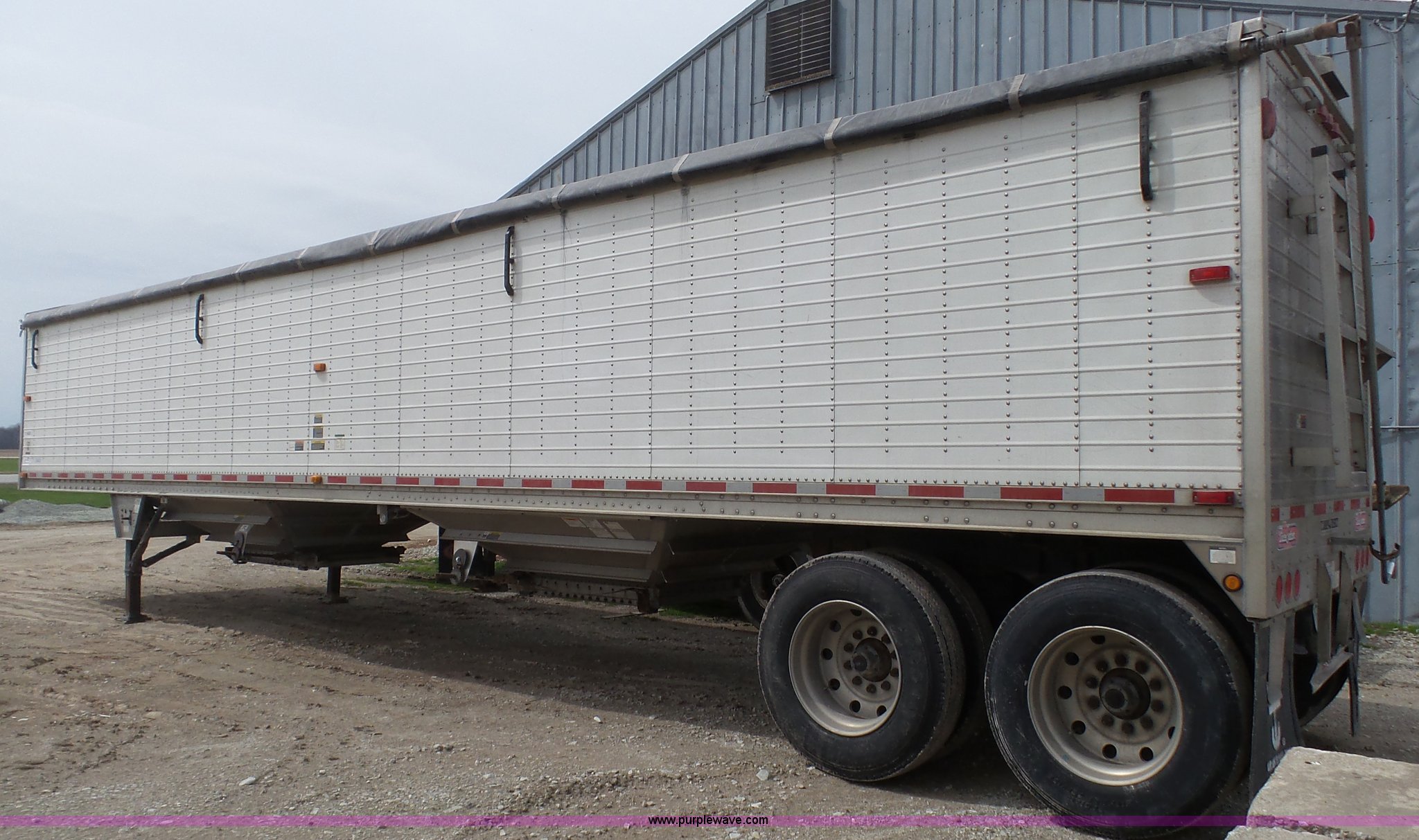 Purple Wave is selling a used Grain or Commodity Trailer in Indiana. This item is a 2007 Wilson double hopper grain trailer with the following: 42'L x 8'W, Manual trap gates, Manual rollover tarp, Front and rear access ladders, Aluminum construction, Fifth wheel plate, Dual leg landing gear, Air suspension, Air brakes, Aluminum wheels, 11R24.5 tires, GVWR 65,000 lbs