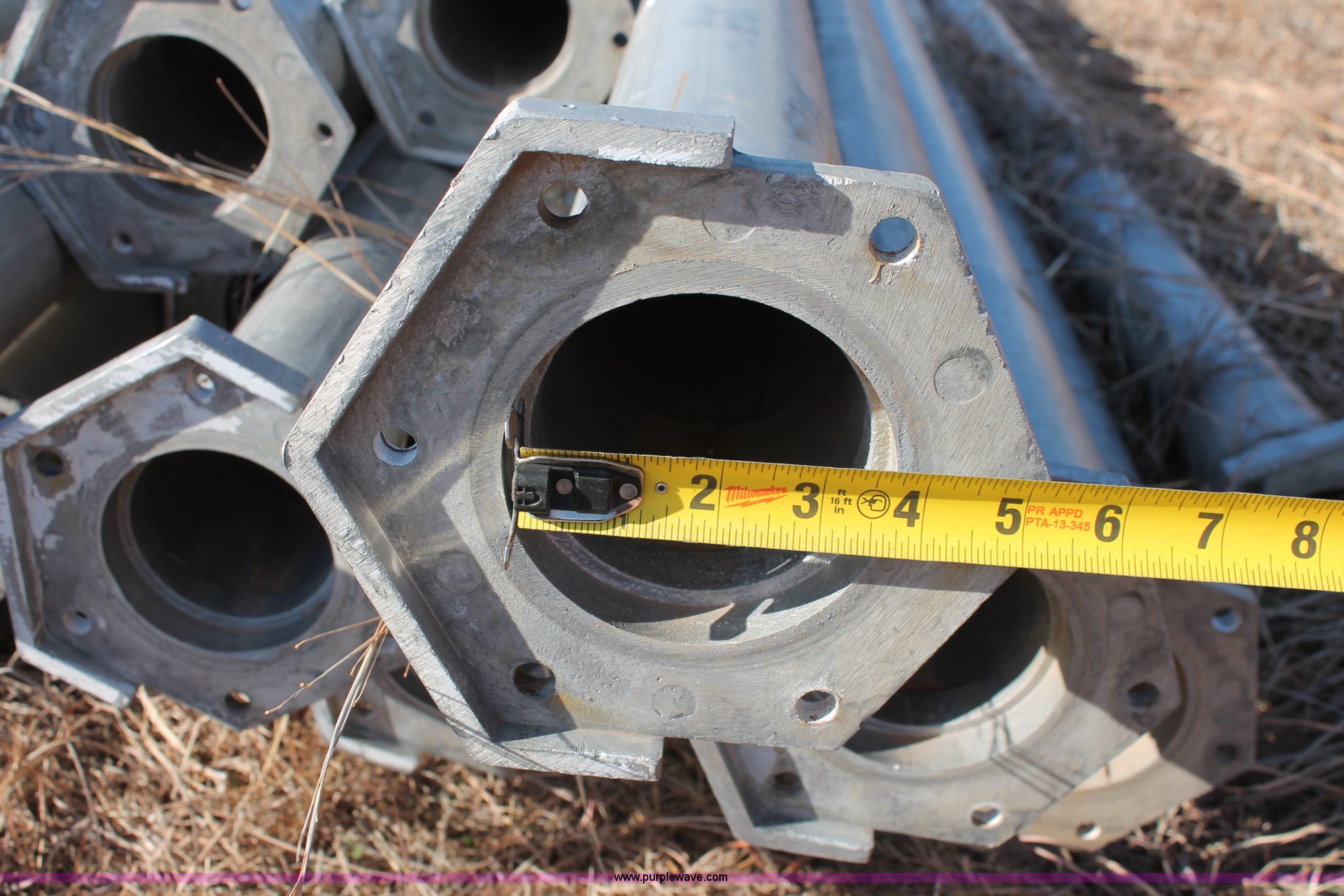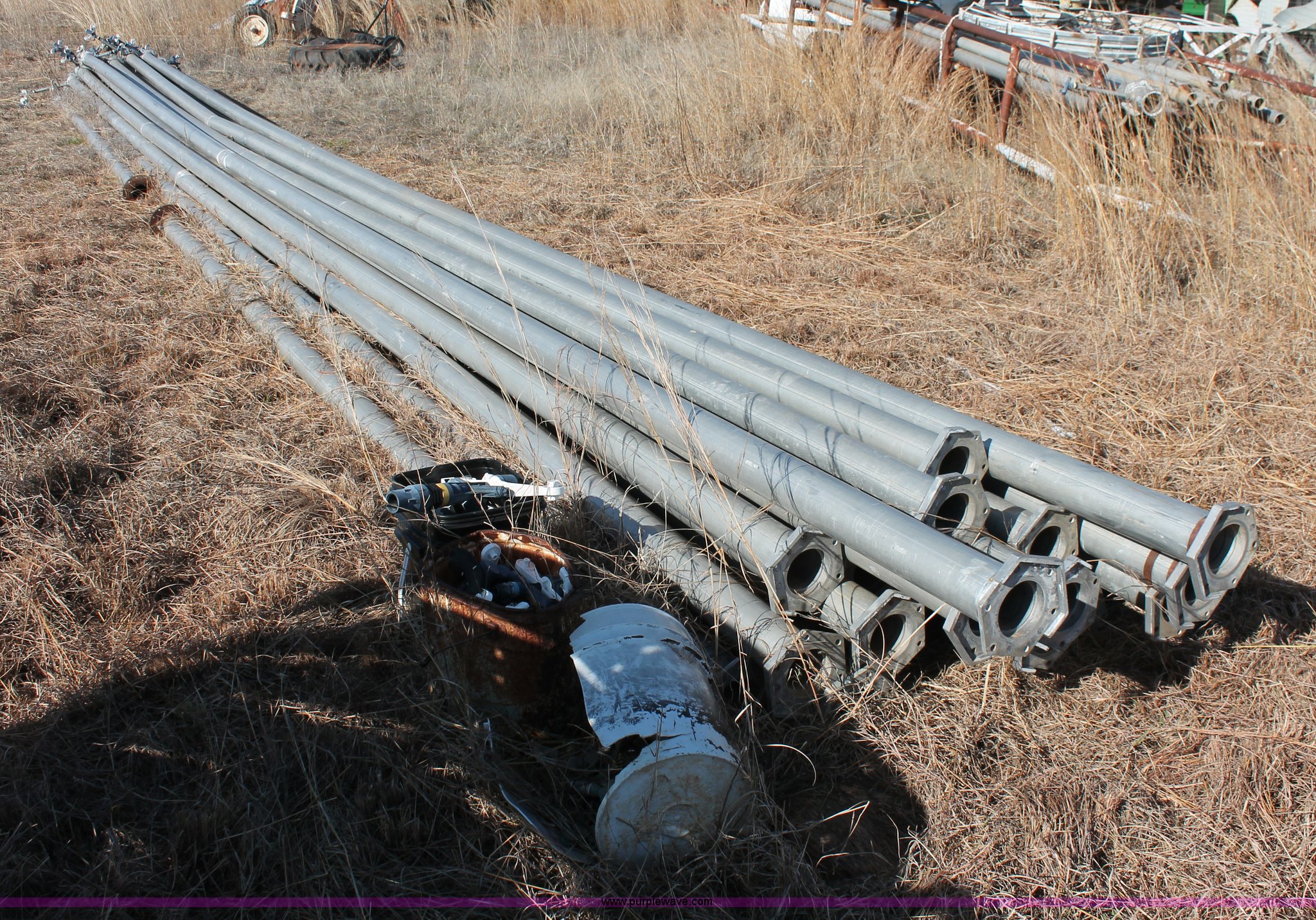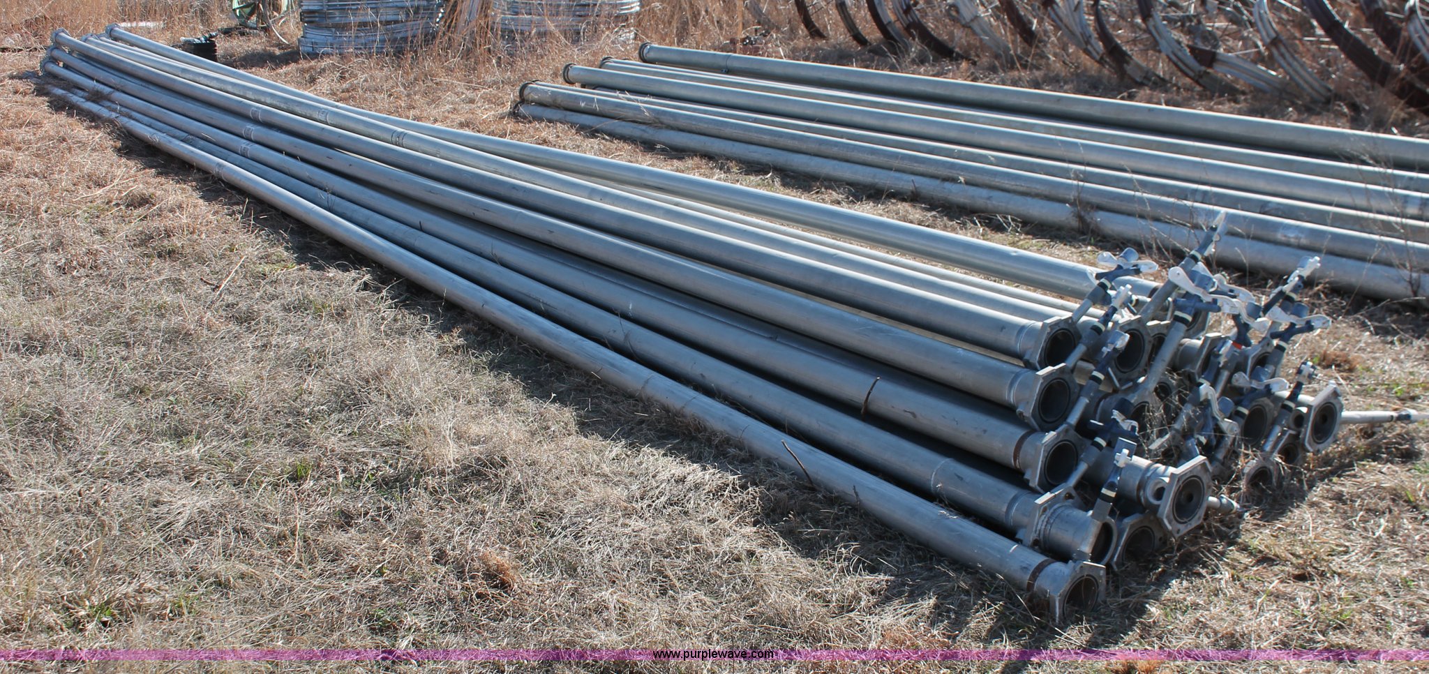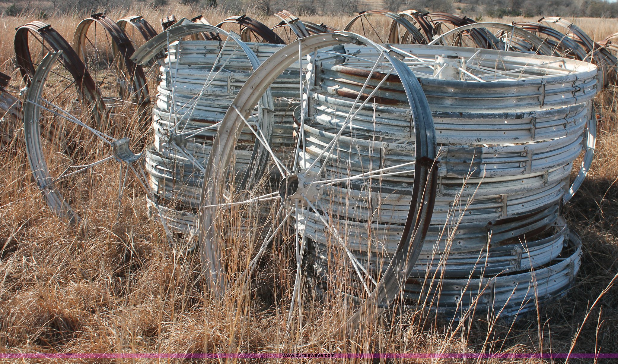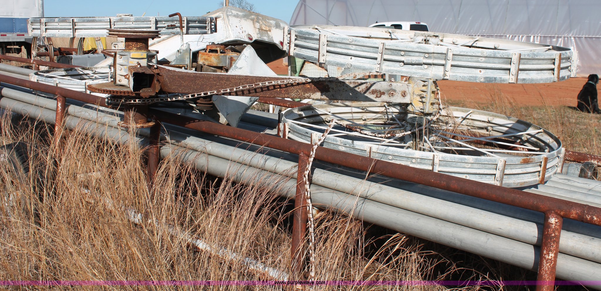 Purple Wave is selling a used Center Pivot in Oklahoma. This item is a Anderson-Miller side roll irrigation system with the following: 1000'L, Briggs & Stratton 6 HP gas engine, 4" aluminum pipe, (25) 40' sticks of main line, Senniger sprinkler heads, Connection hardware and additional heads included, (29) 5' diameter wheels, Drive gears frame needs repair