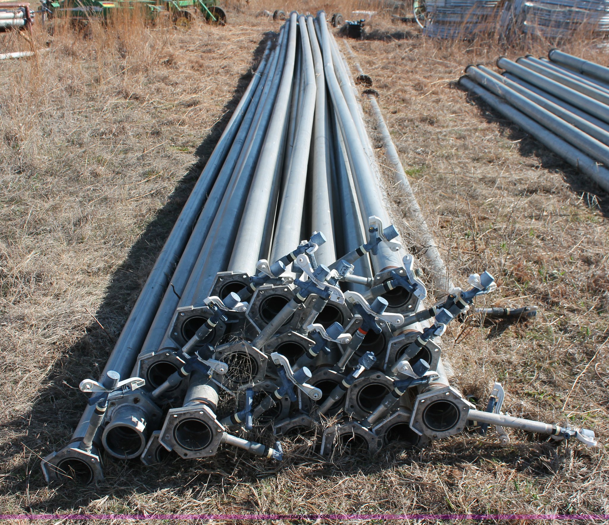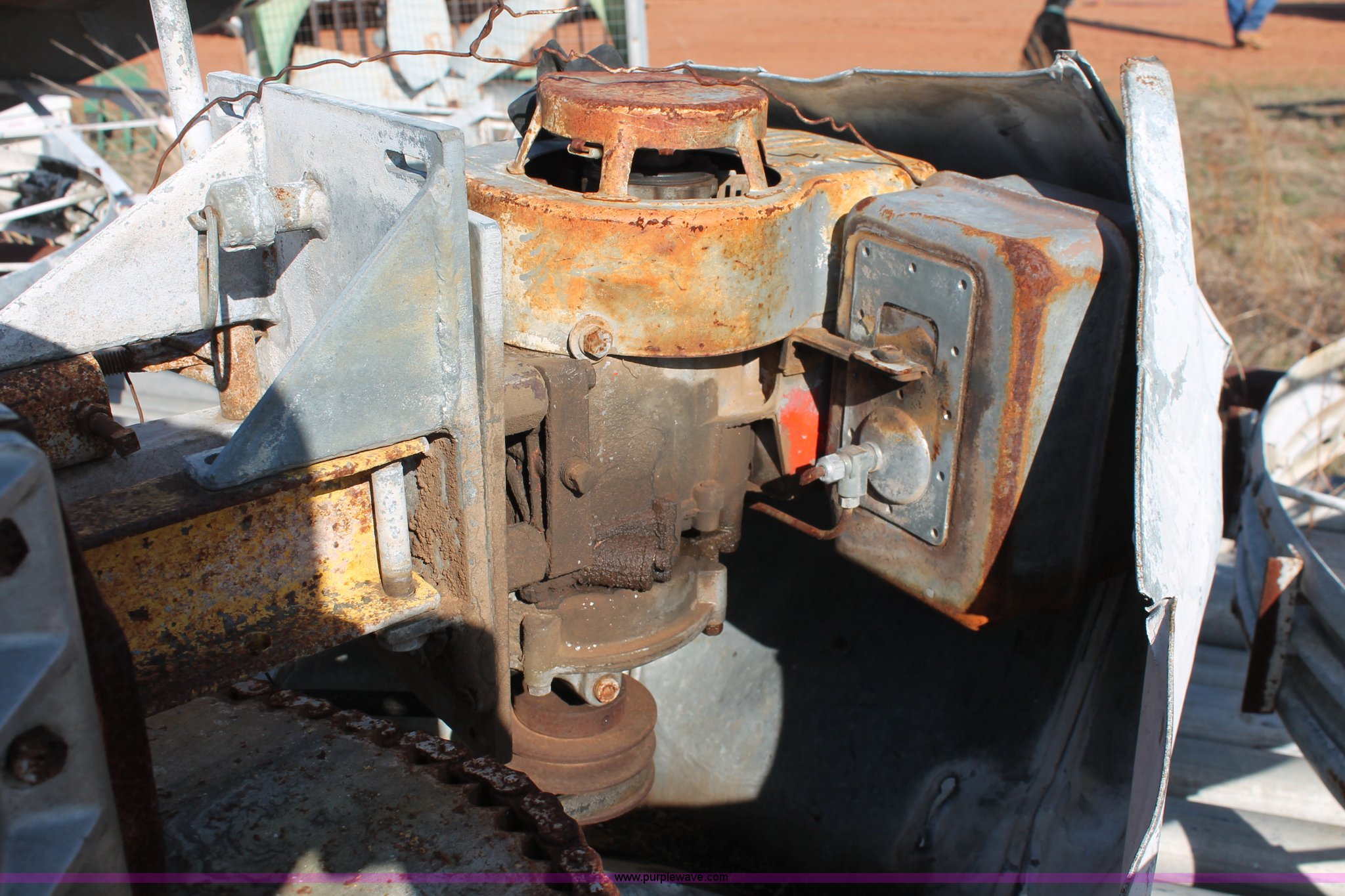Anderson-Miller side roll irrigation system. 1000'L, Briggs & Stratton 6 HP gas engine, 4" aluminum pipe, (25) 40' sticks of main line, Senniger sprinkler heads, Connection hardware and additional heads included, (29) 5' diameter wheels, Drive gears frame needs repair. 12945 240th St. Blanchard, OK 73098