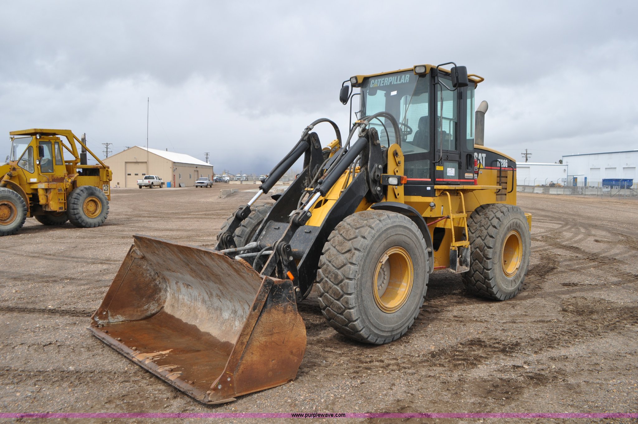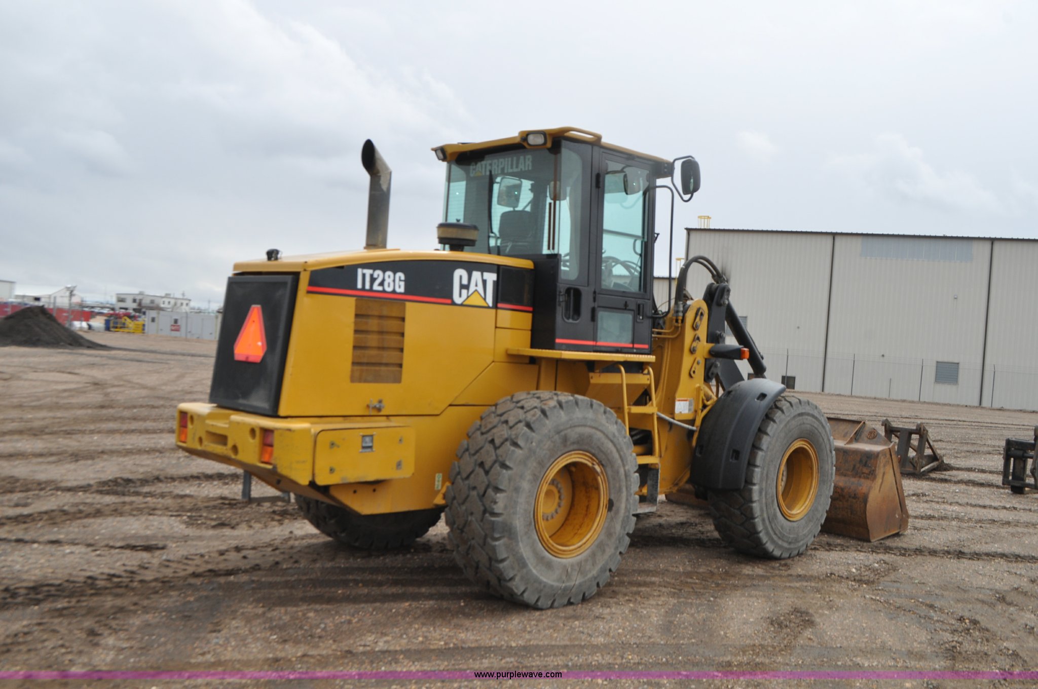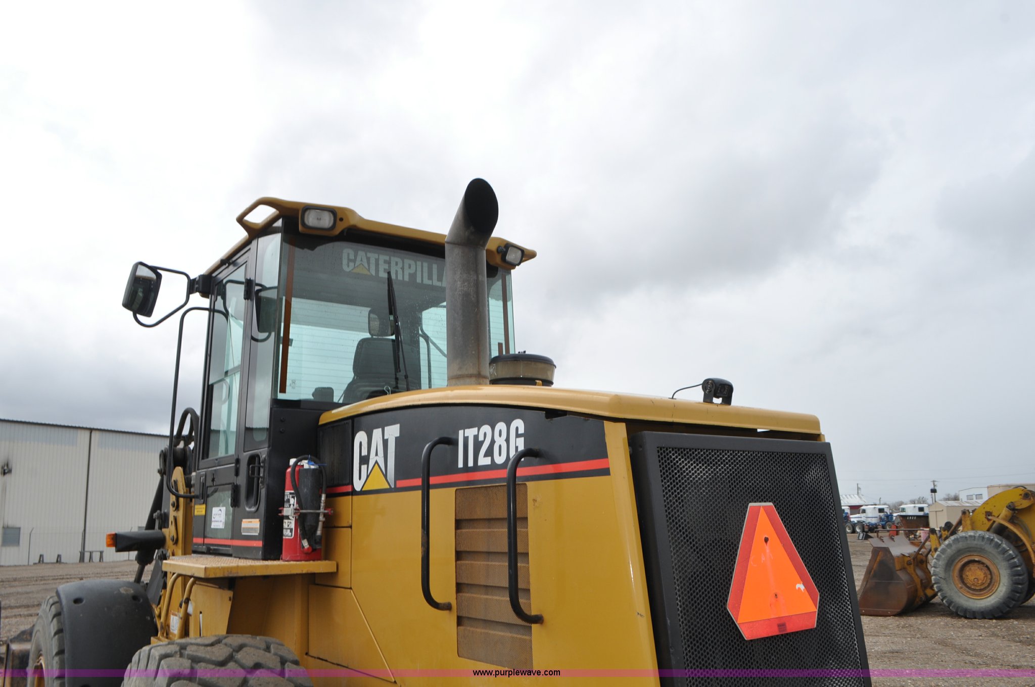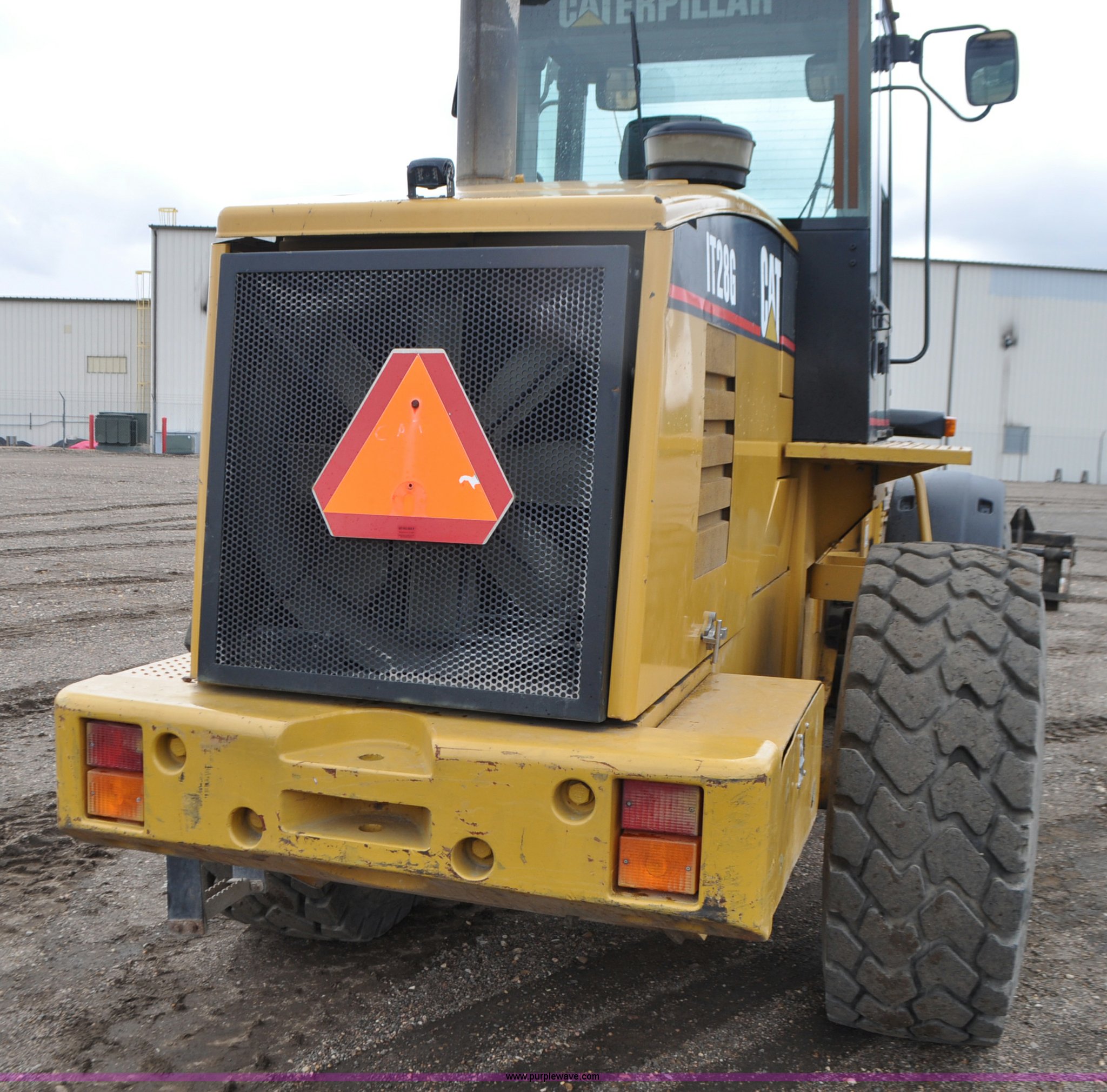 Purple Wave is selling a used Wheel Loader in Colorado. This item is a 2003 Caterpillar IT28 wheel loader with the following: 12,301 hours on meter, Caterpillar 3116T 6.0L six cylinder turbo diesel engine, 145 HP, Powershift transmission, 4F-3R gears, Enclosed cab, AC and heat, Tilt steering wheel, Air suspension seat, Joystick bucket controls, Wipers, Backup alarm, 99"W general purpose bucket, Hydraulic quick coupler, Caterpillar material handling boom, 8' x 7" x 2.5" forks, Front and rear work lights, Automatic engine prelube system, Backup camera, Counterweights, 20.5R25 front tires, Serial CATIT28GH8CR03532