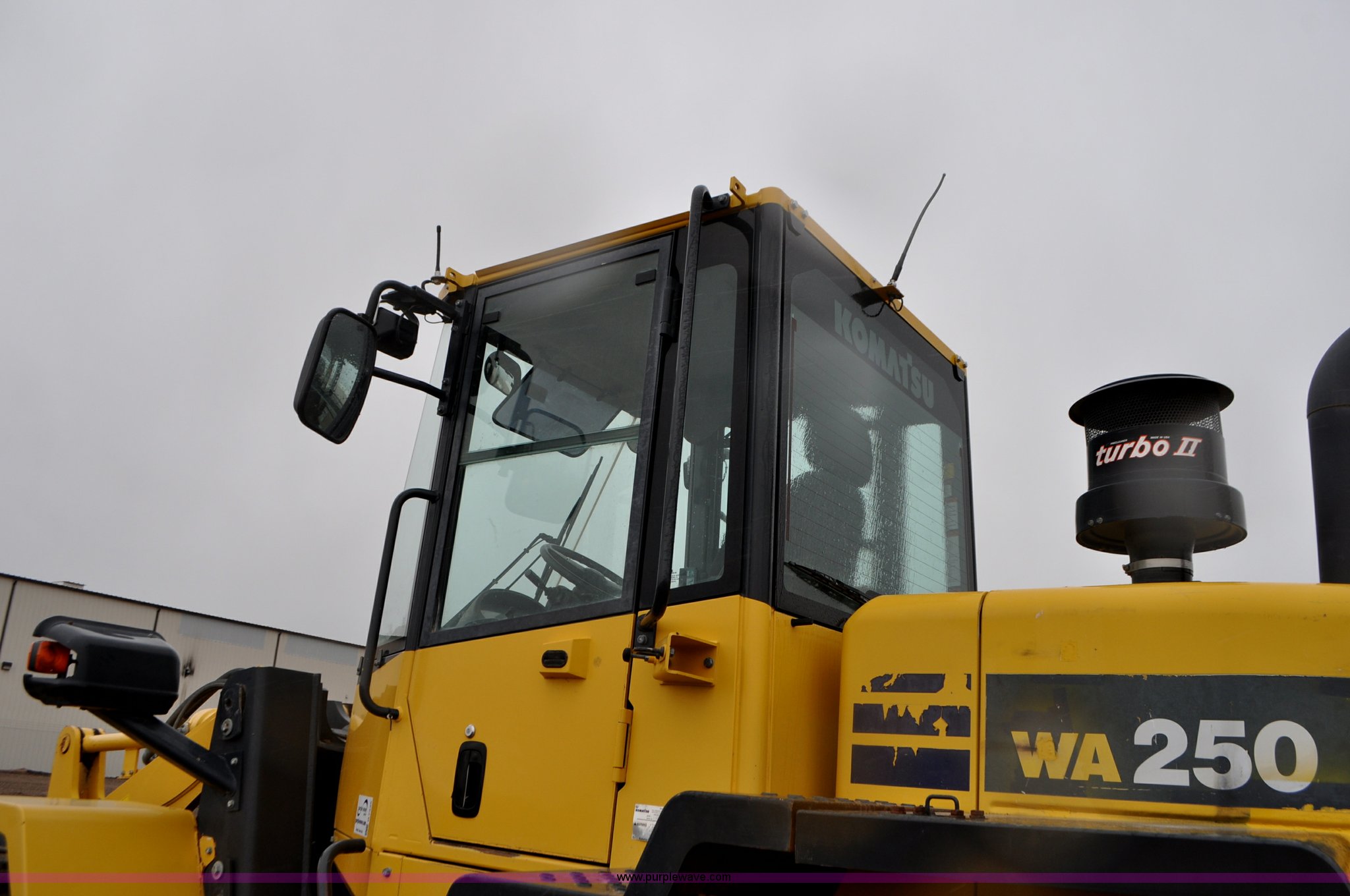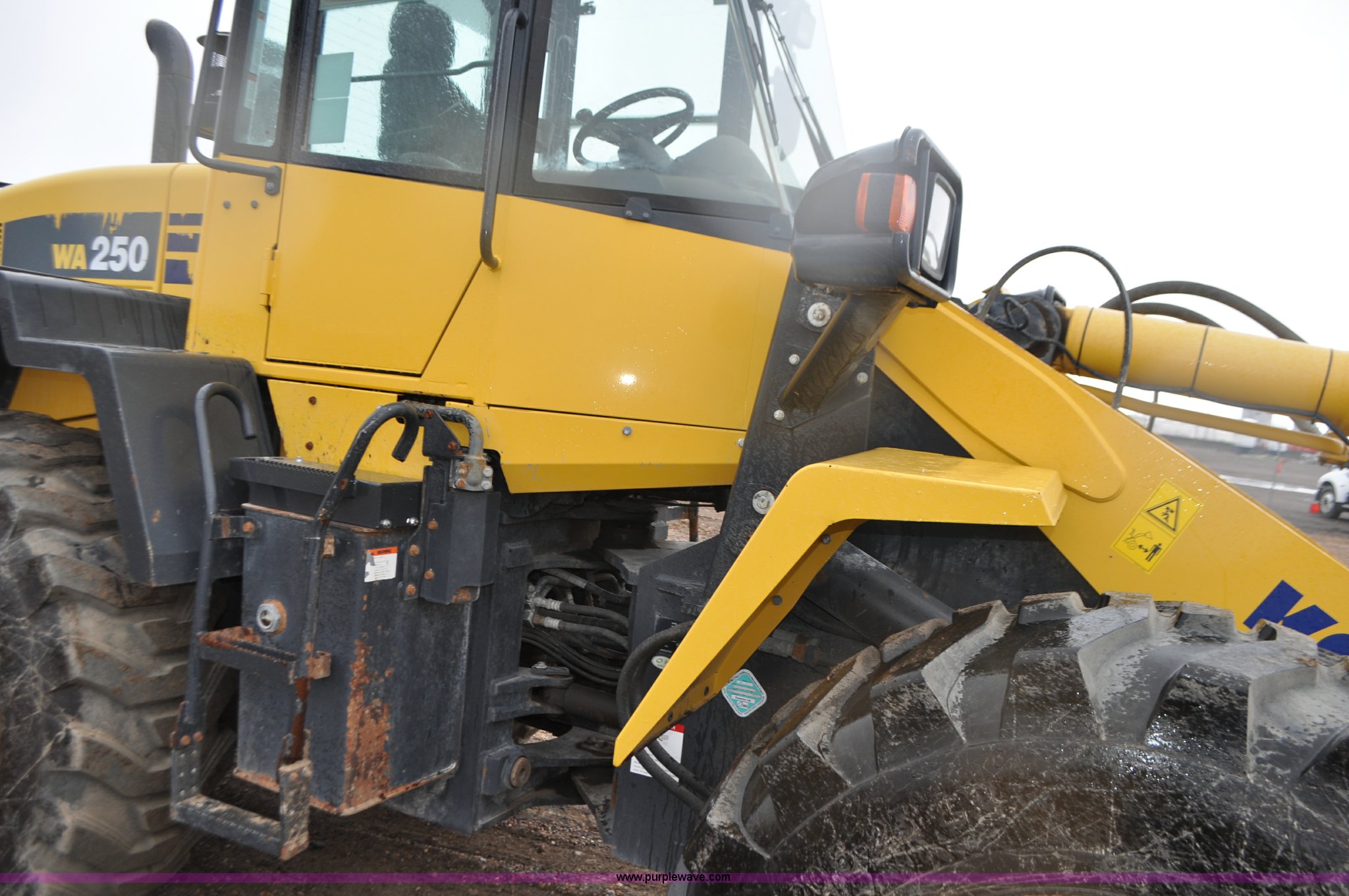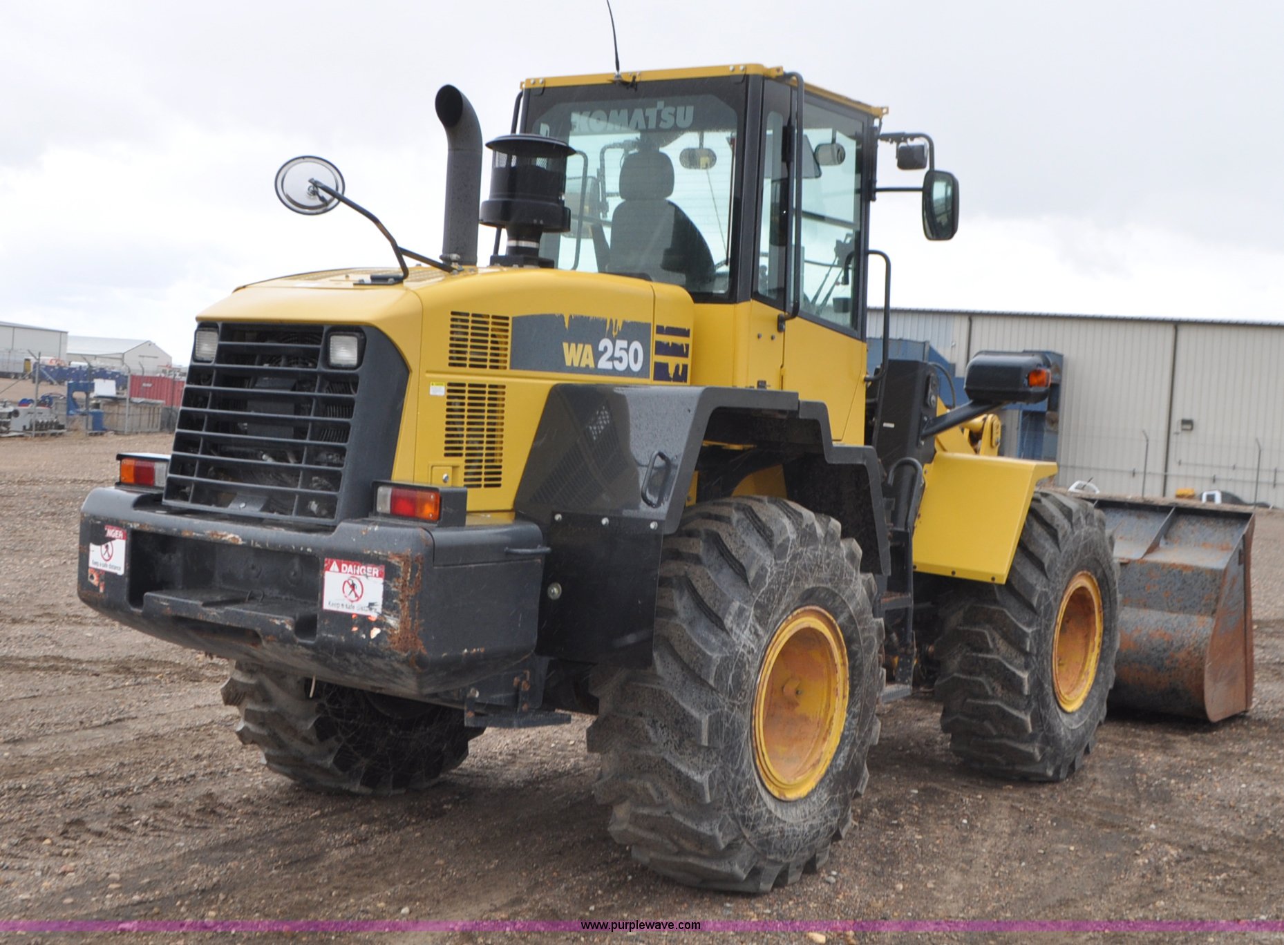 Purple Wave is selling a used Wheel Loader in Colorado. This item is a 2012 Komatsu WA250-6 wheel loader with the following: 7,466 hours on meter, Komatsu SAA6D107E-1 6.7L six cylinder turbo diesel engine, 140 HP, Hydrostatic transmission, 4F-4R gears, Enclosed cab, AC and heat, Tilt steering wheel, Air suspension seat, Joystick bucket controls, Wipers, Front and rear work lights, Rockland LBWA250-6 general purpose bucket, Bolt-on cutting edge, JRB material boom, Pallet forks, Hydraulic quick coupler, Counterweights, 20.5-25 tires, Recently replaced tires, Serial 76994