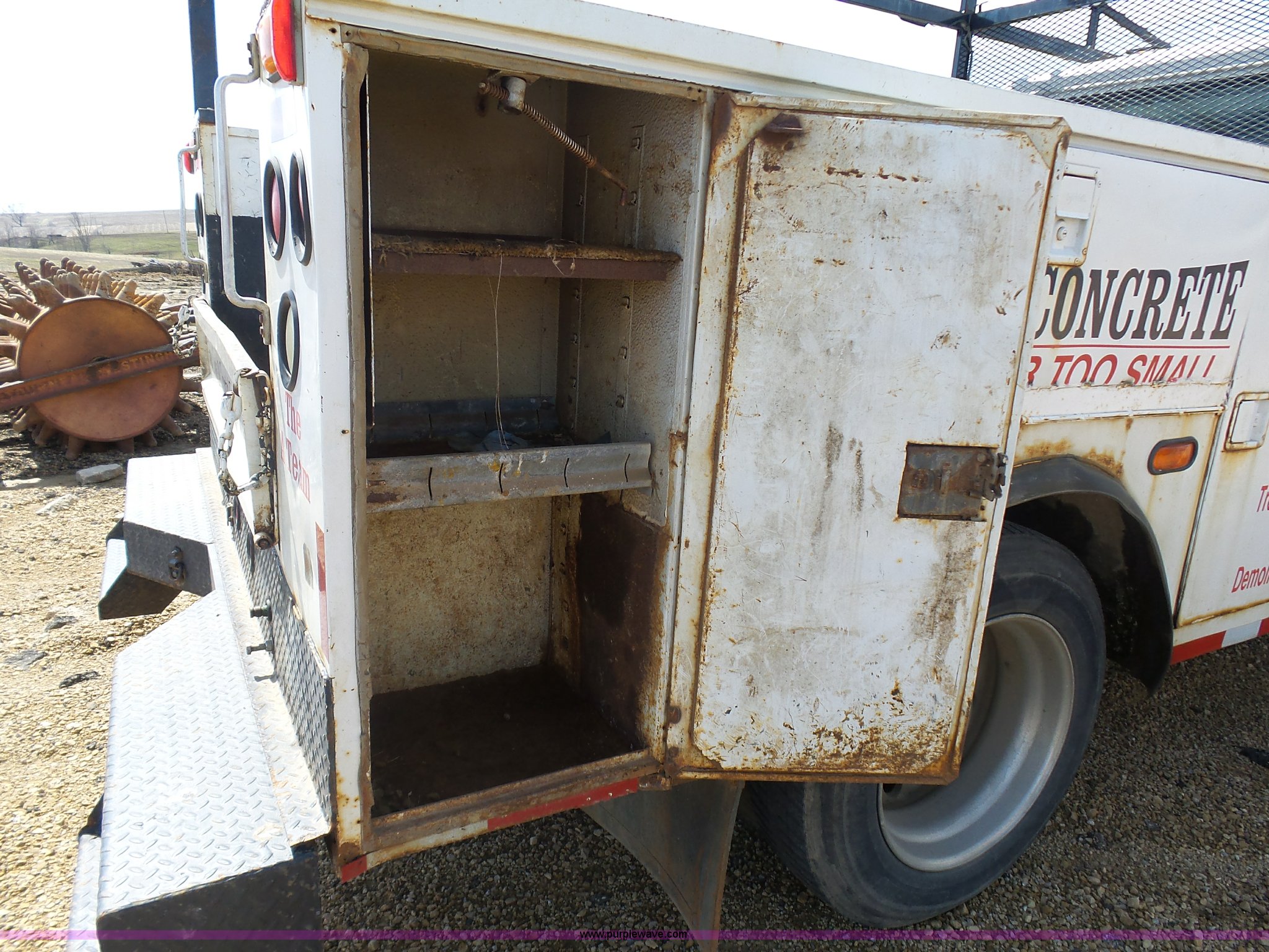 2002 International 4700 service truck. 106,740 miles on odometer, International T444 7.3L V8 turbo diesel engine, Automatic transmission, AC and heat, AM/FM, Spring suspension seat, Beacon light, Block heater, Front tow hooks, Stahl service bed 11'L x 95"W, (4) compartments per side, Slideout drawers, Utility rack, Work lights, Propane bottle holder, Fire extinguisher, Trailer wiring, Single exhaust stack, Single fuel tank, 255/70R22.5 front tires, 245/75R22.5 rear tires, GVWR 23,500 lbs, FAWR 8,000 lbs, RAWR 15,500 lbs, Transmission replaced 03/2015. View repairs. Wisconsin title. 1HTSLABL22H521189. Wiederholt Enterprises. 30111 Raoster Road. Cuba City, WI 53807