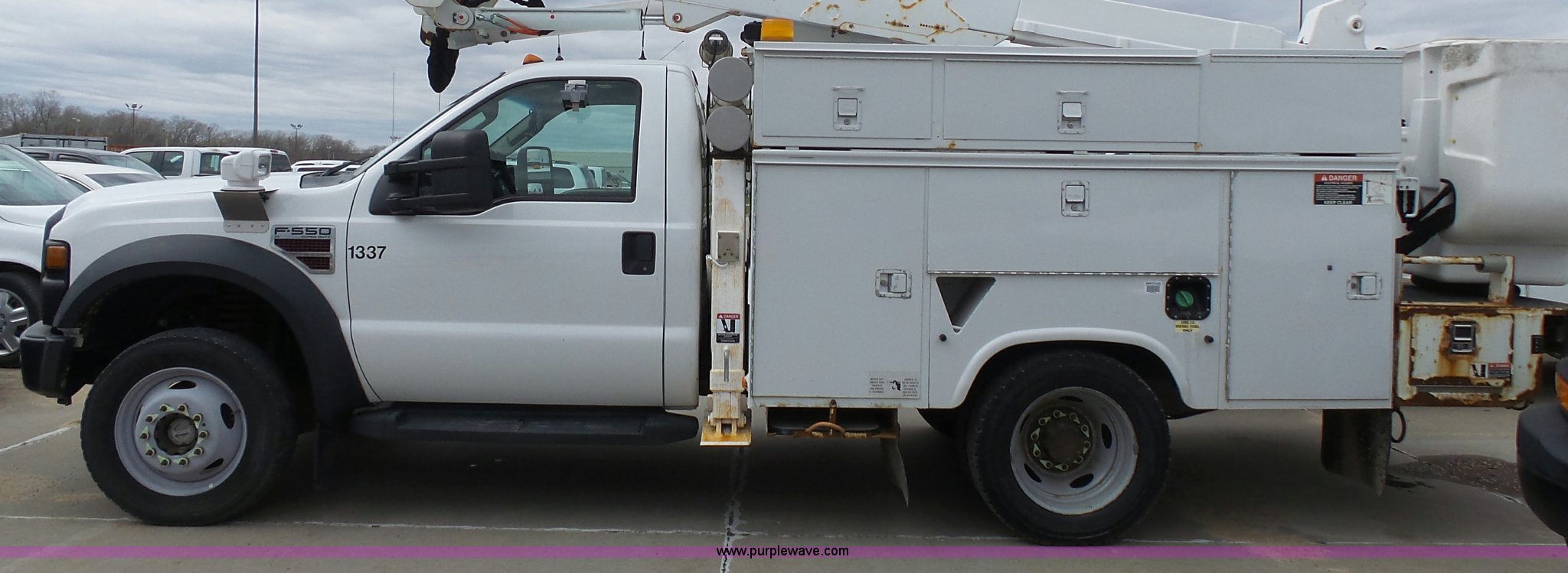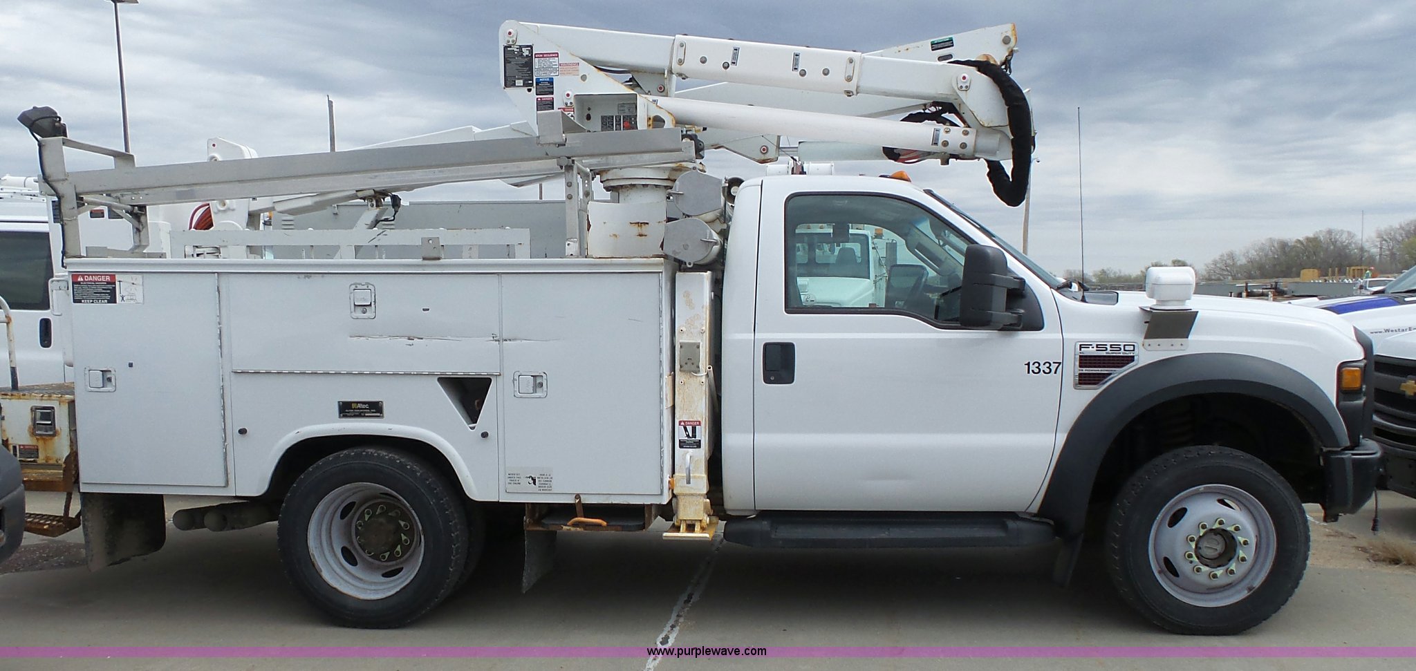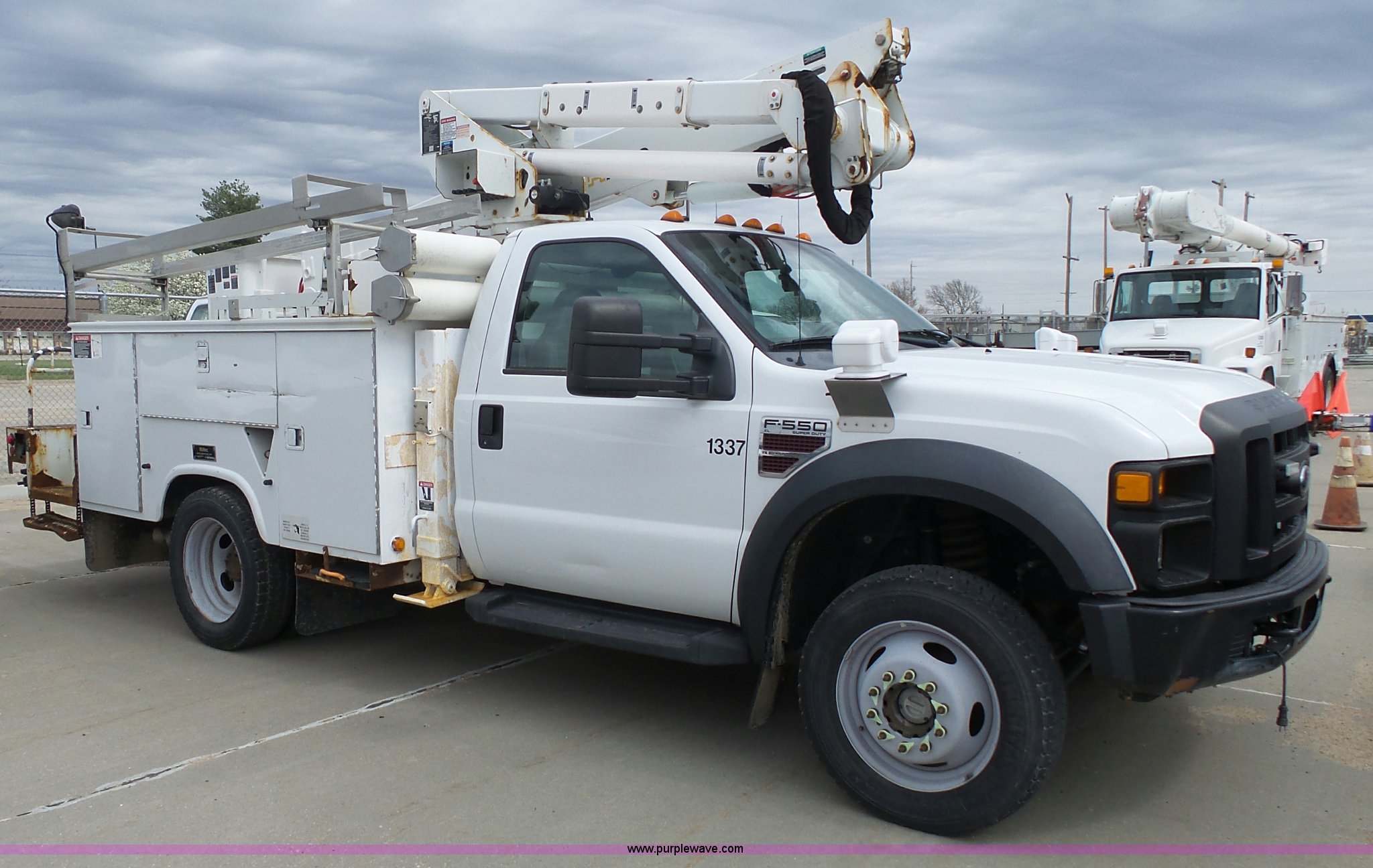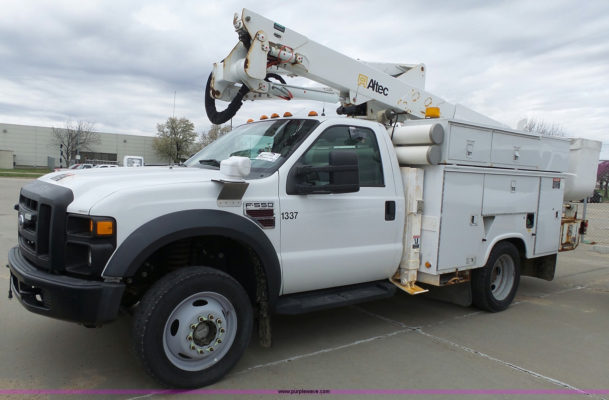 Purple Wave is selling a used Bucket Truck in Kansas. This item is a 2008 Ford F550 Super Duty bucket truck with the following: 147,428 miles on odometer, 6.4L V8 OHV 32V turbo diesel engine, Automatic transmission, Single axle, AC and heat, AM/FM, Beacon light, Front tow hooks, PTO, Altec 6102D545 service bed, 8.5'L, Slide-out drawers, Work lights, Ladder rack, Pintle hitch, 2007 Altec AT37G boom, 400 lbs maximum lift capacity, 37.5' maximum lift height, Ground and platform controls, (2) outriggers, Serial 0507DE8371, Spring suspension, Hydraulic brakes, 225/70R19.5 tires, GVWR 17,950 lbs, Inspection is out of date, Unit# 1337