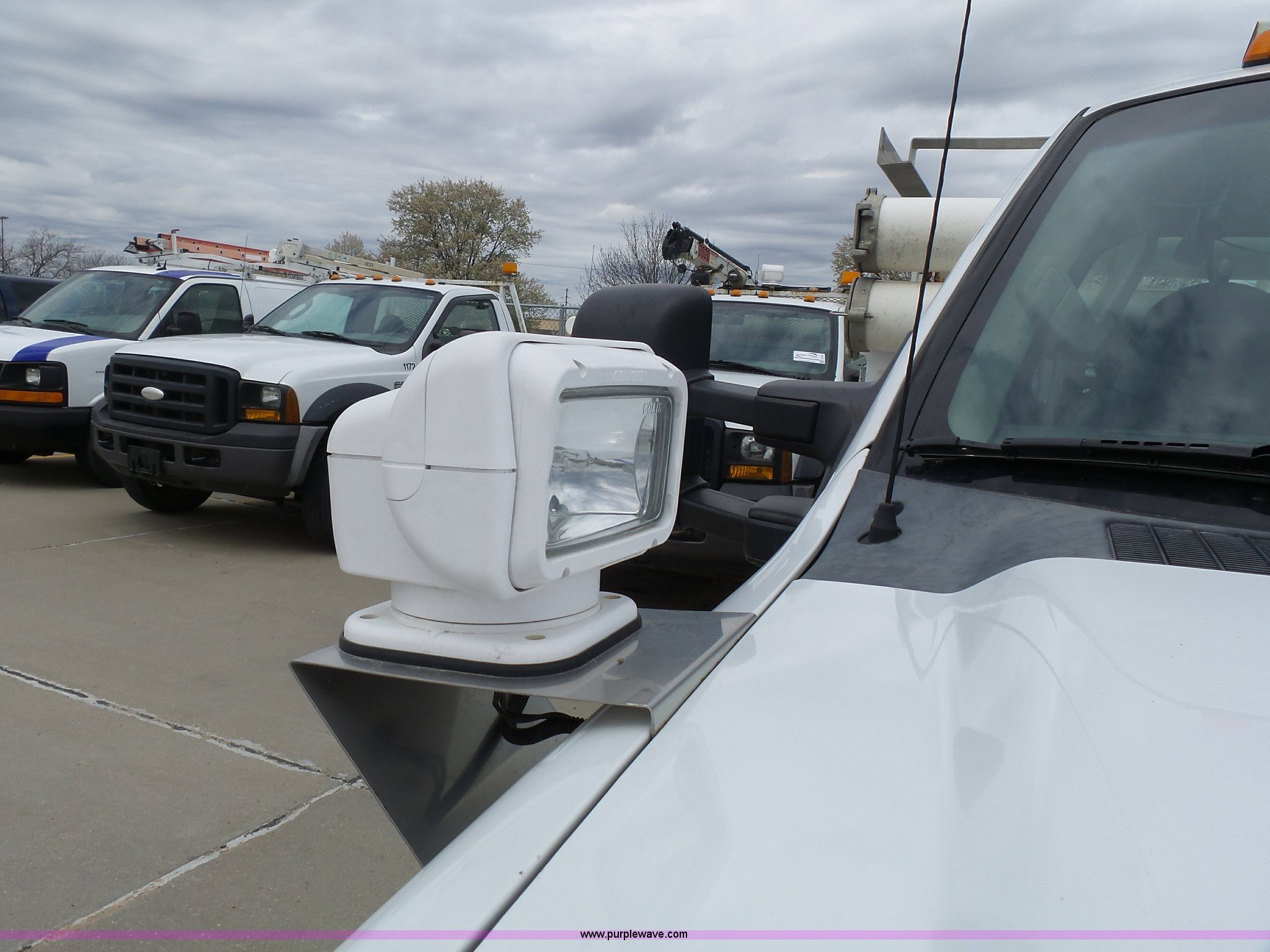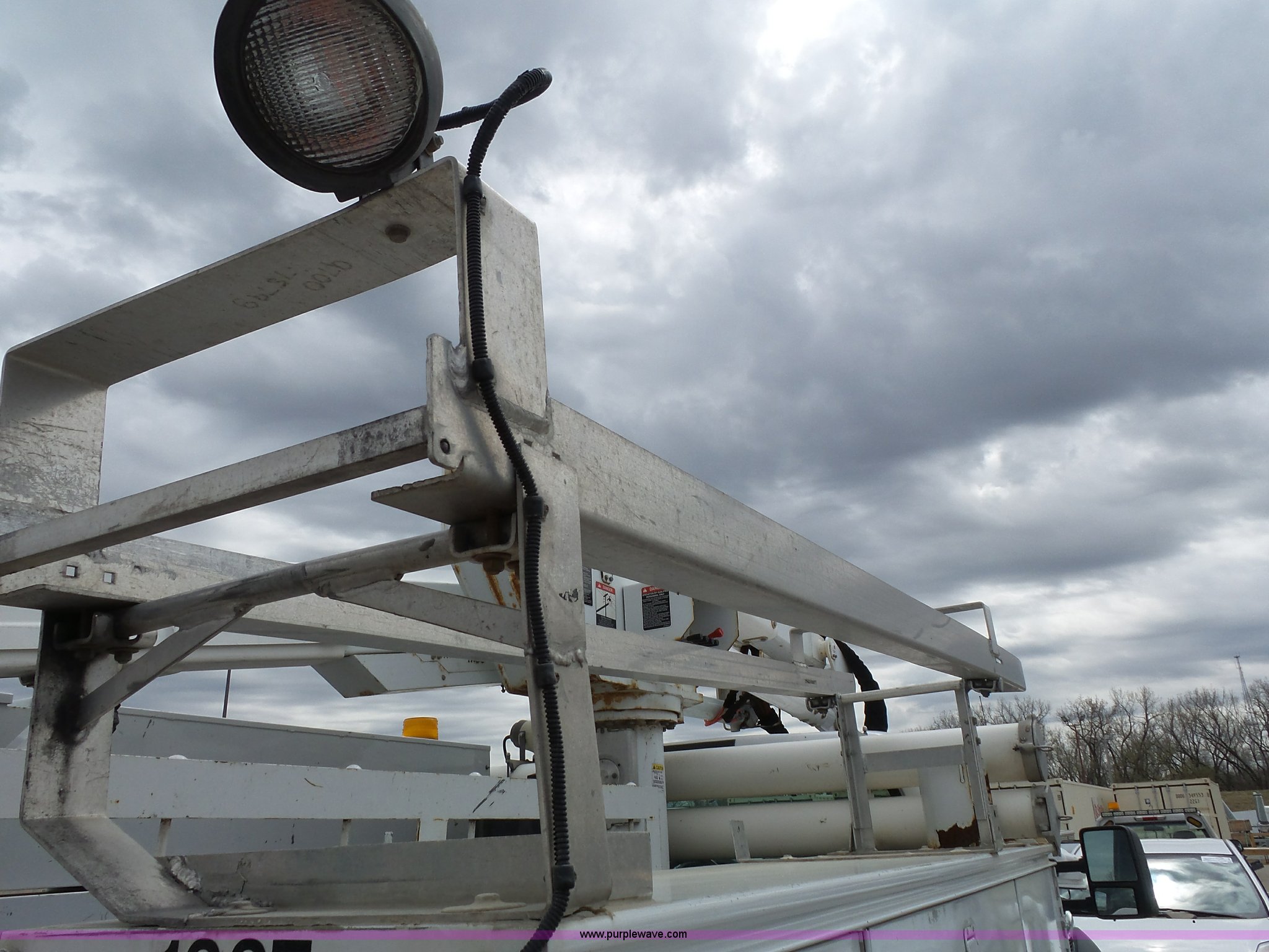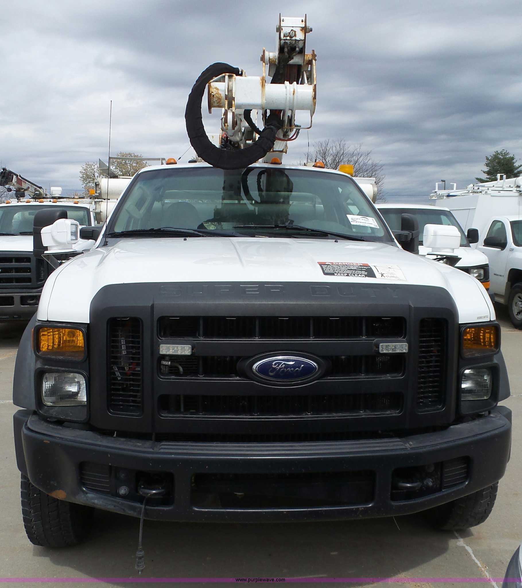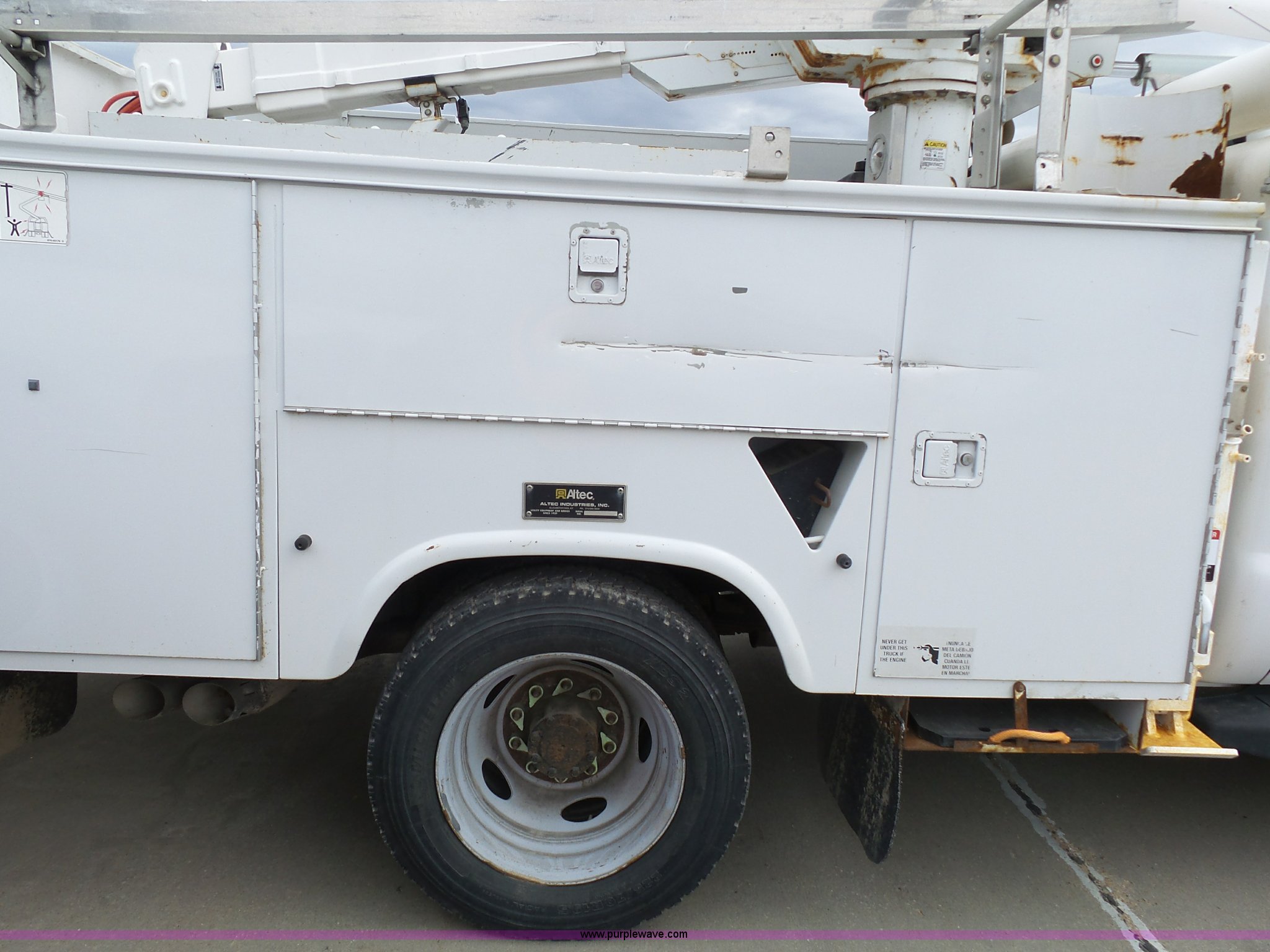 Purple Wave is selling a used Bucket Truck in Kansas. This item is a 2008 Ford F550 Super Duty bucket truck with the following: 147,428 miles on odometer, 6.4L V8 OHV 32V turbo diesel engine, Automatic transmission, Single axle, AC and heat, AM/FM, Beacon light, Front tow hooks, PTO, Altec 6102D545 service bed, 8.5'L, Slide-out drawers, Work lights, Ladder rack, Pintle hitch, 2007 Altec AT37G boom, 400 lbs maximum lift capacity, 37.5' maximum lift height, Ground and platform controls, (2) outriggers, Serial 0507DE8371, Spring suspension, Hydraulic brakes, 225/70R19.5 tires, GVWR 17,950 lbs, Inspection is out of date, Unit# 1337