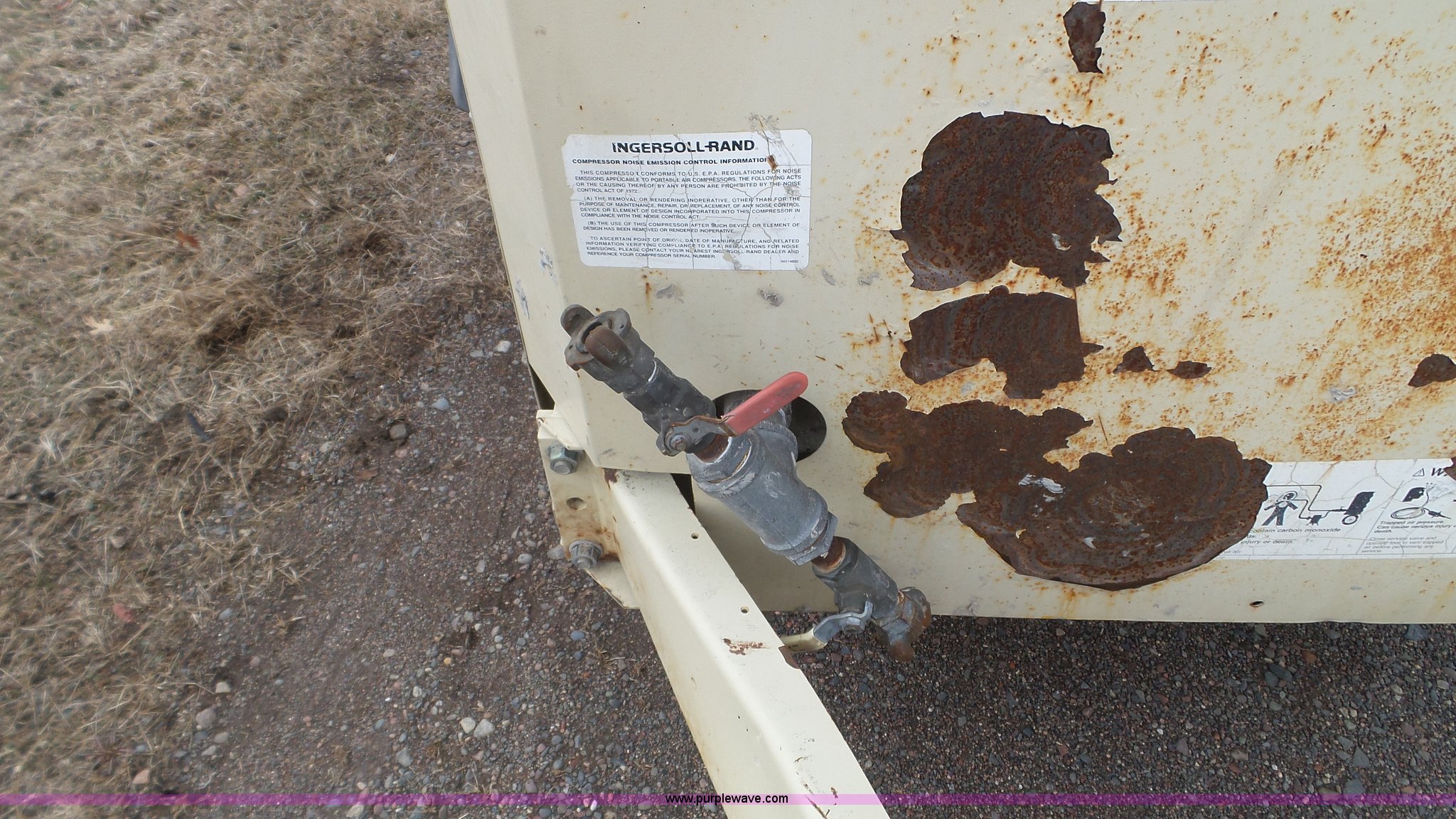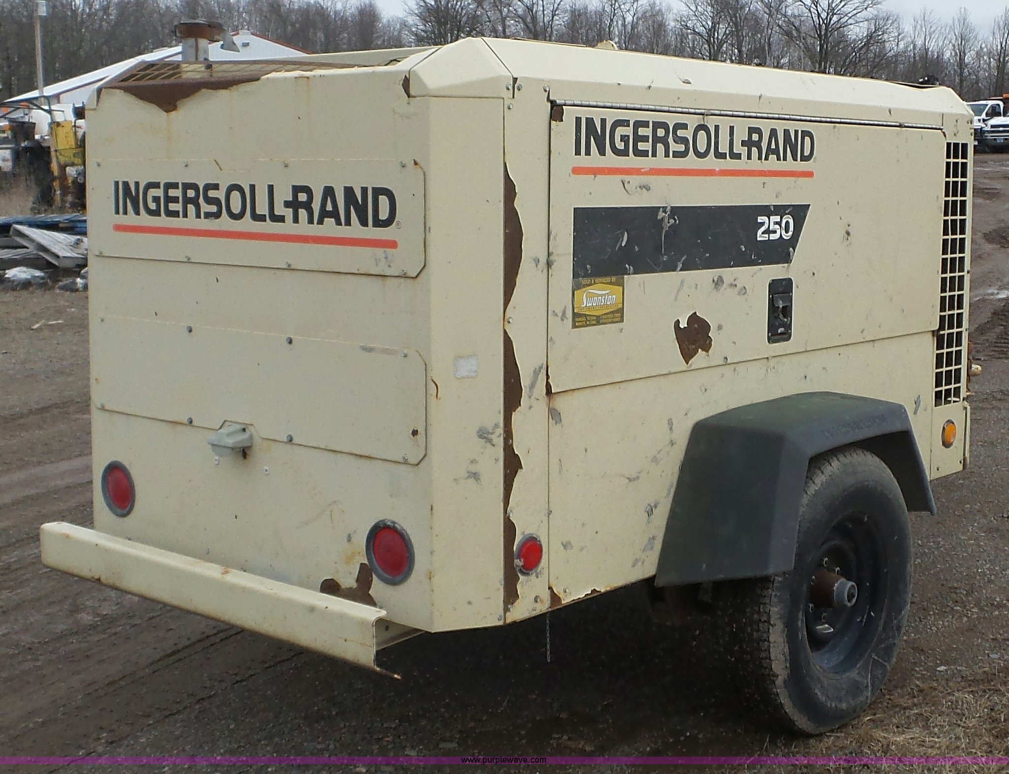 Purple Wave is selling a used Air Compressor in Minnesota. This item is a 1999 Ingersoll Rand P250 WJD air compressor with the following: Unknown hours on meter, John Deere 4.5L four cylinder diesel engine, 60 kW, 250 CFM, 100 psi, 225/75R15 tires, Serial 299768UDJ359